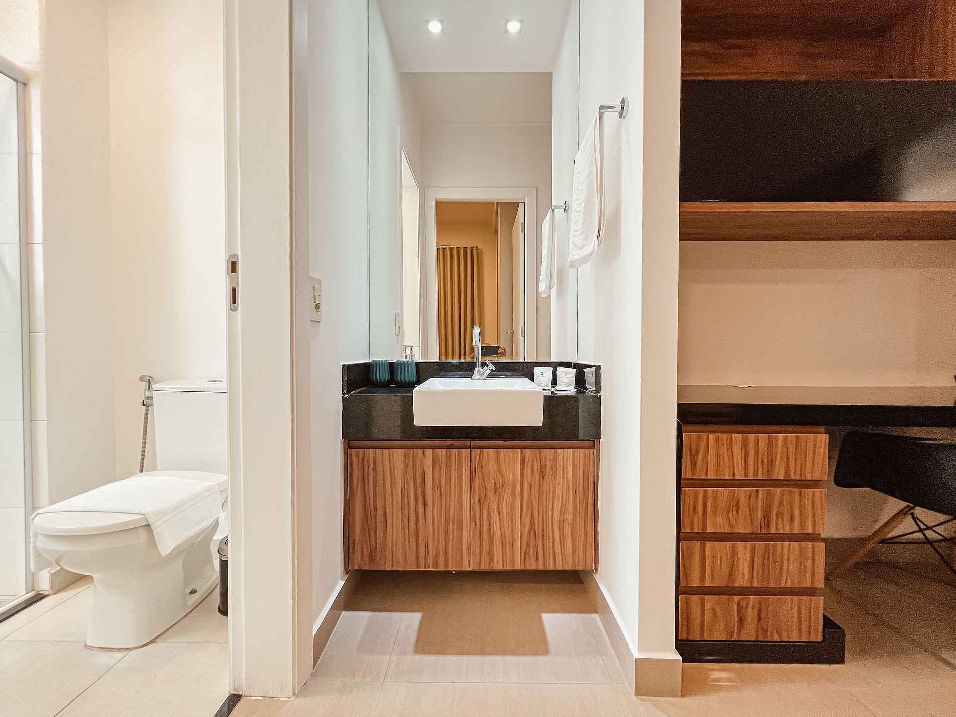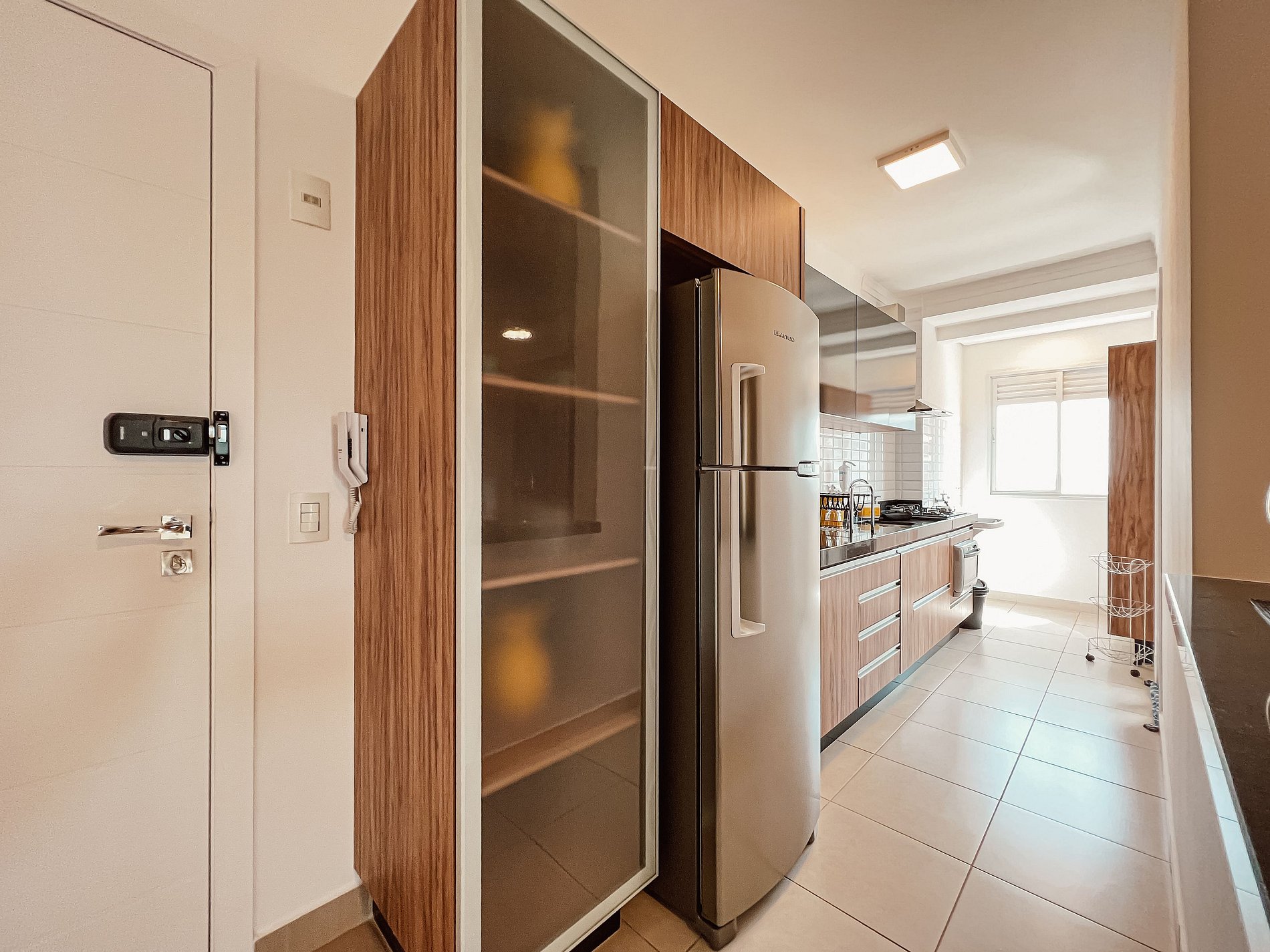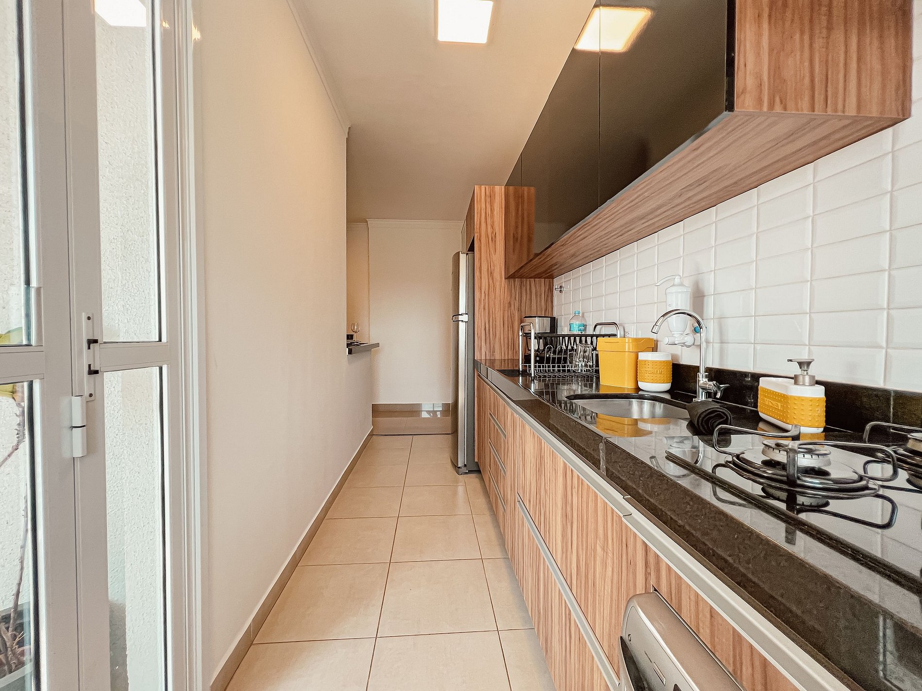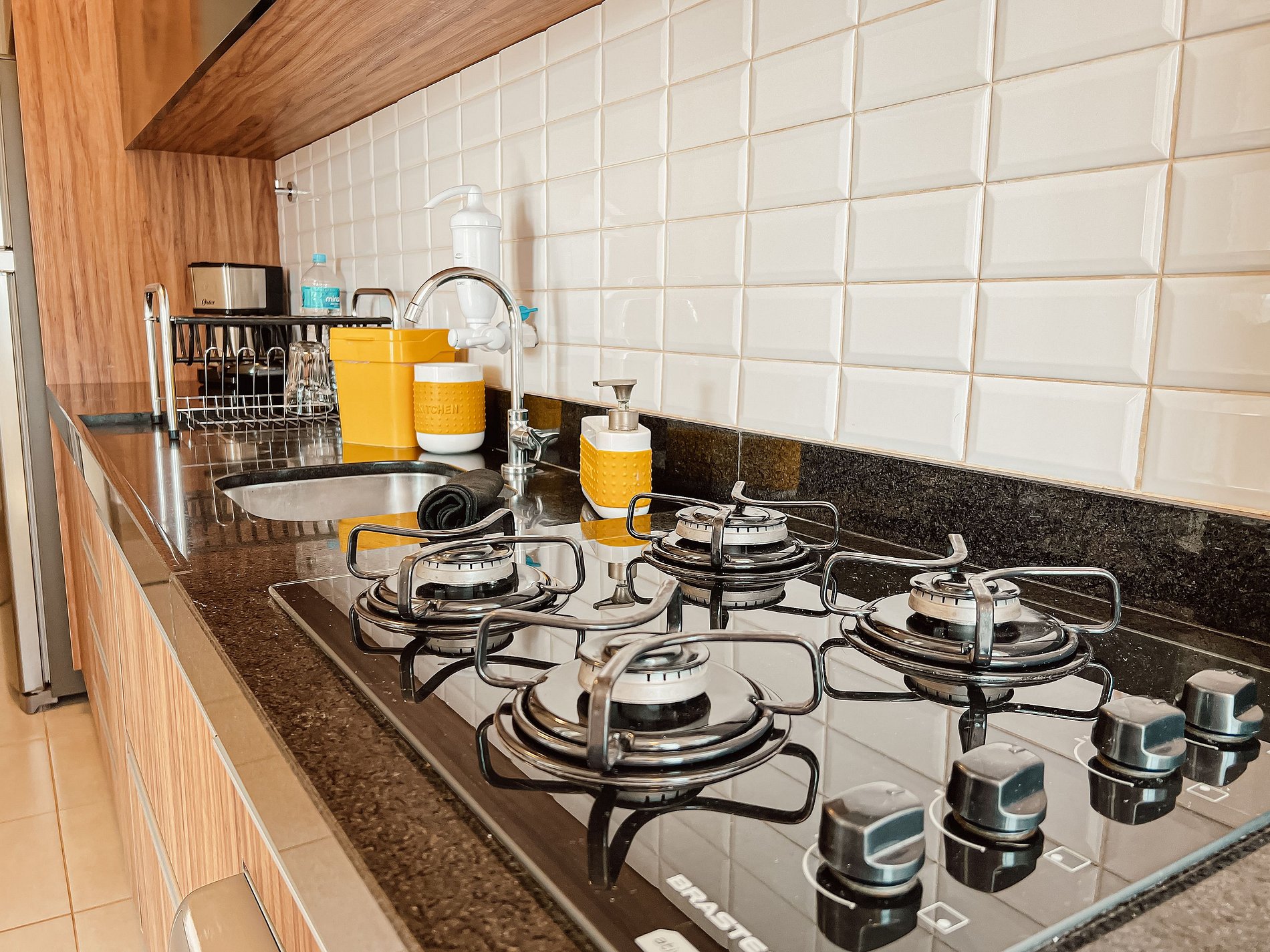A cozinha é um charme à parte: totalmente equipada com fogão cooktop, geladeira inox, micro-ondas, sanduicheira e cafeteira elétrica. Todos os utensílios são novos, pensados para sua comodidade. O banheiro, com ducha revigorante, é um convite ao relaxamento.