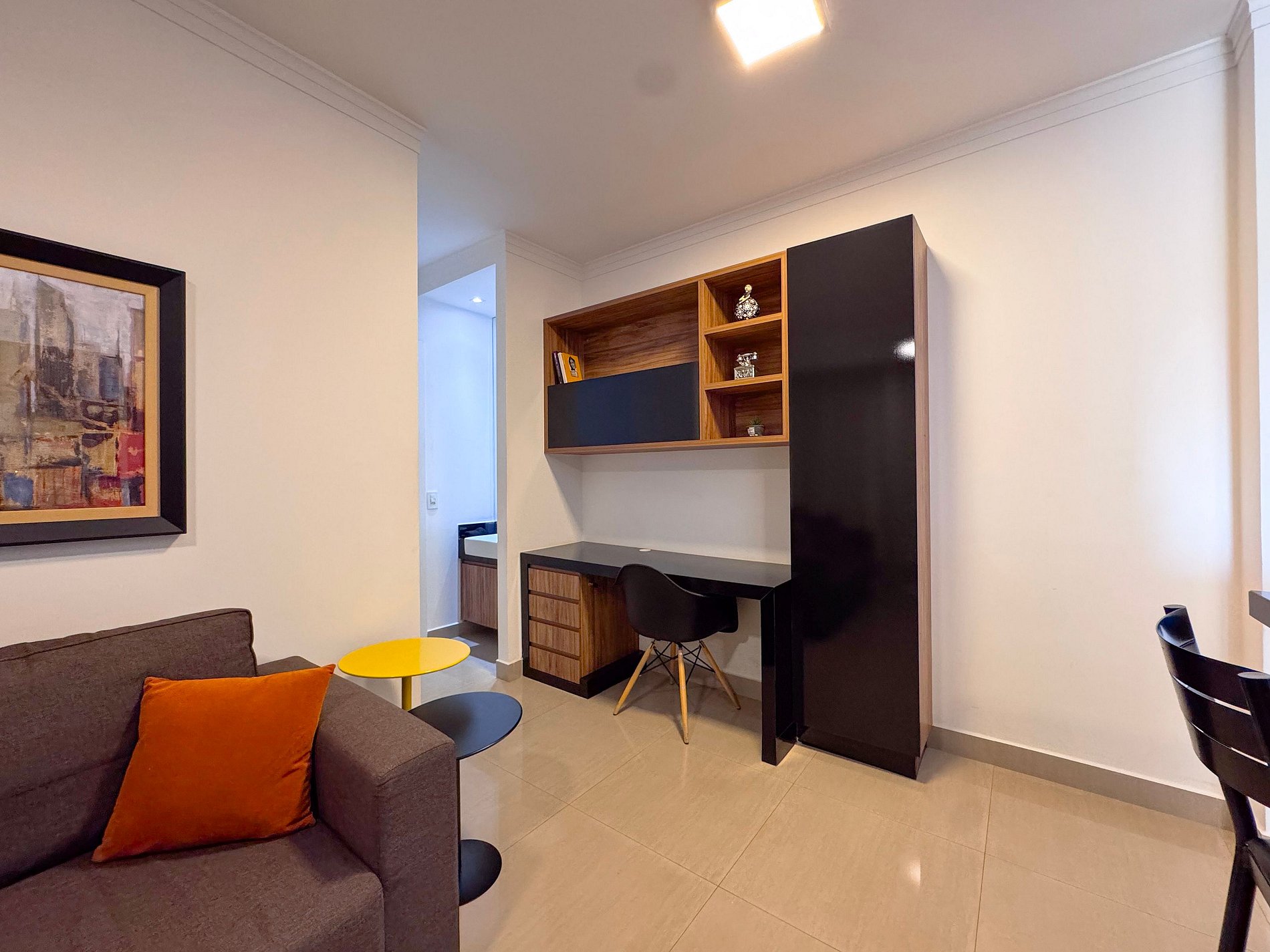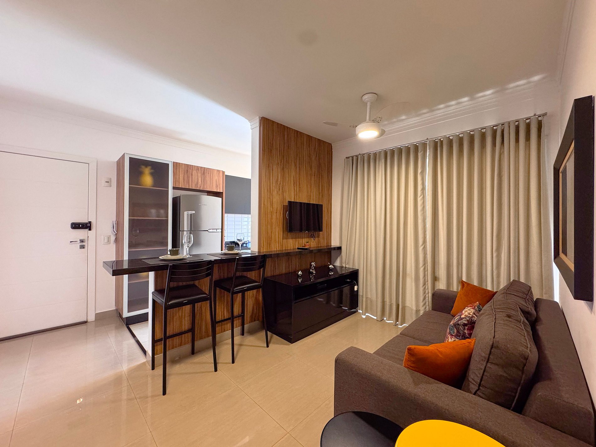 O quarto, decorado com sofisticação, é climatizado e oferece uma cama queen para noites de sono reconfortantes. A sala é aconchegante com seu sofá-cama, ventilador e uma Smart TV com conexão rápida, ideal para momentos de lazer.
