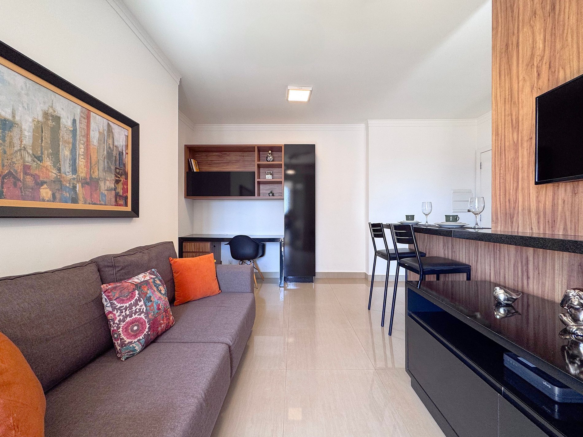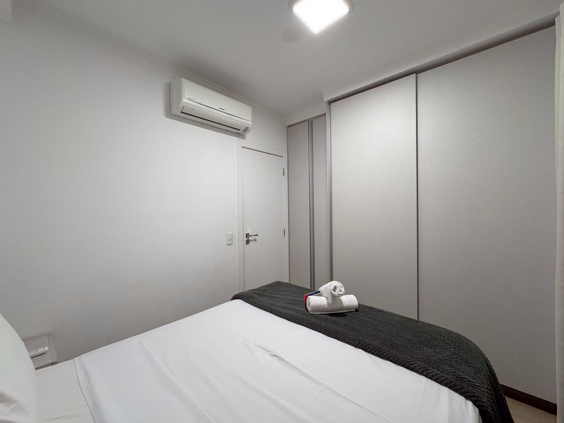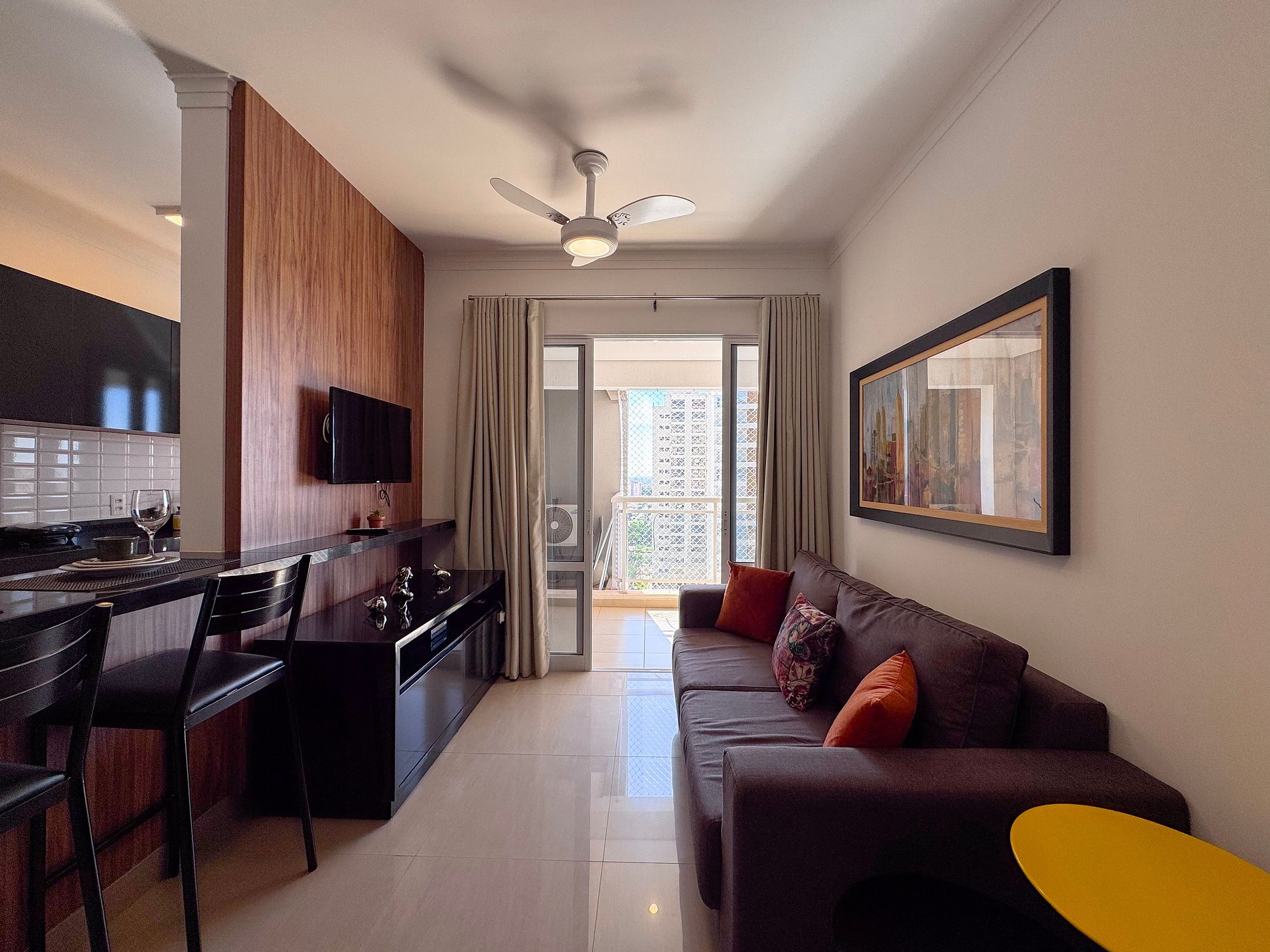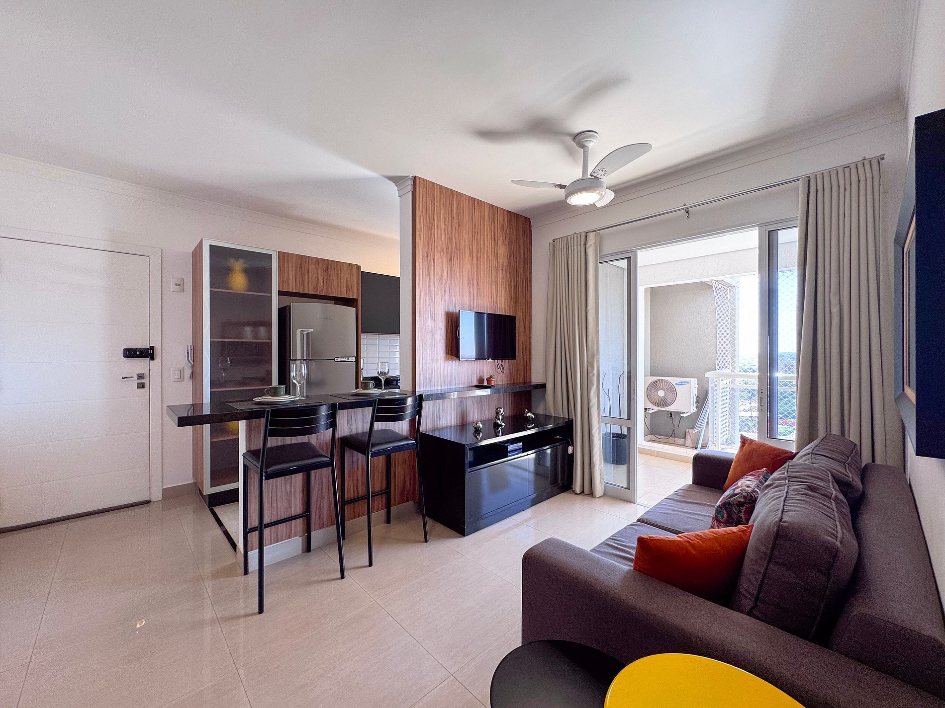 Com design clean, este apartamento aconchegante hospeda 3 hóspedes. Desfrute do ar-condicionado no quarto e do frescor do ventilador na sala. A sacada, com tela de proteção, é o ponto alto: um sofá-cam e conjunto para refeições ao ar livre transformam o espaço. Conexão Wi-fi e Smart TV garantem lazer. A cozinha está pronta para suas criações culinárias. Vem se sentir em casa!