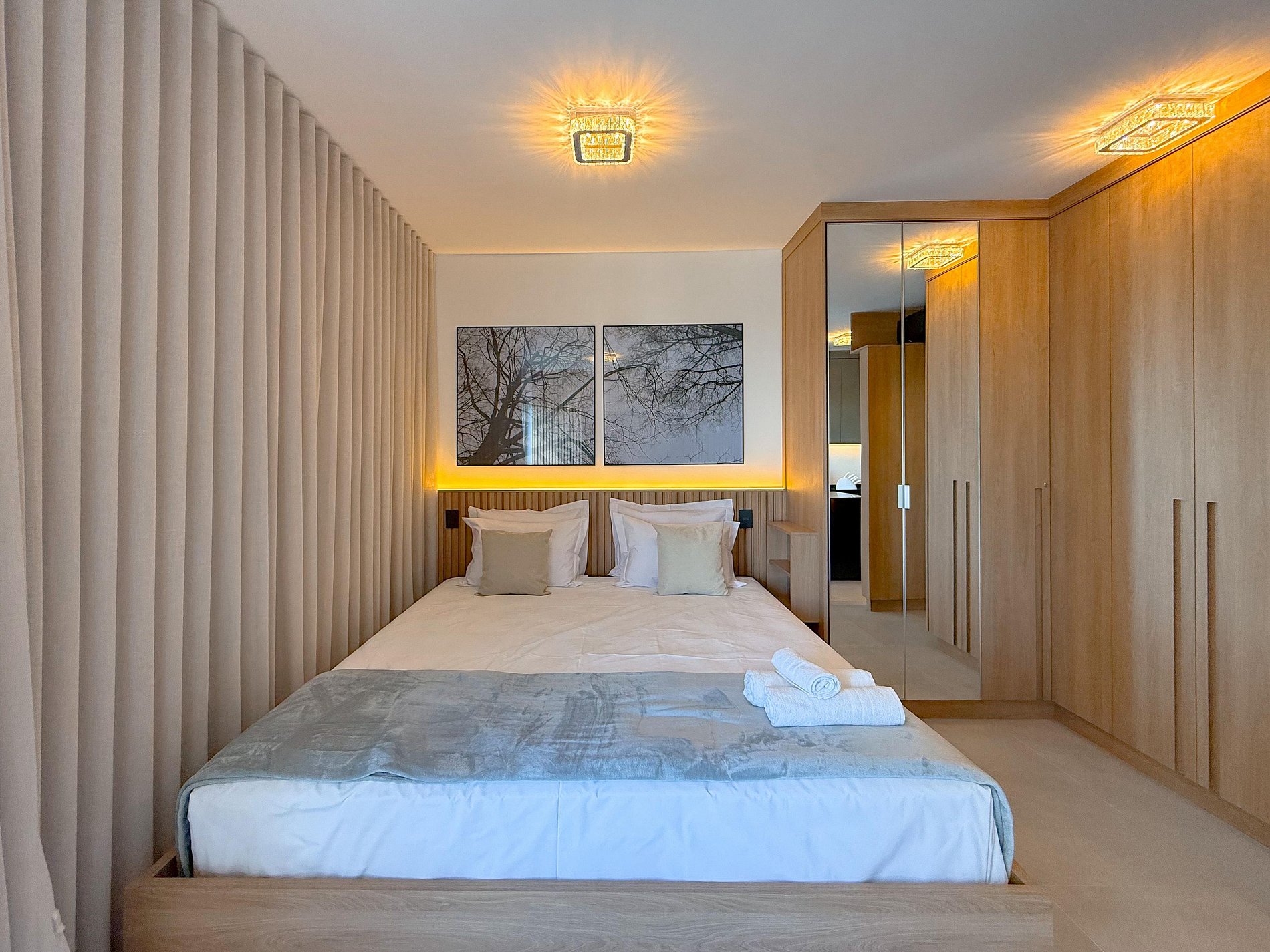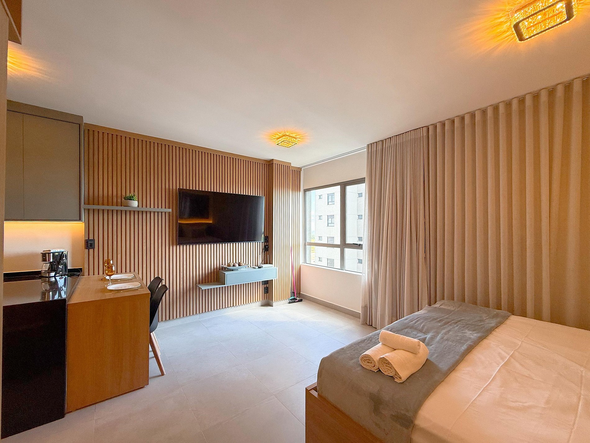 O dormitório oferece cama queen confortável, enxoval de qualidade, iluminação suave e armários amplos, garantindo noites tranquilas e uma estadia funcional. As grandes janelas trazem luz natural e ampliam a sensação de espaço, mesmo em um layout inteligente de estúdio.