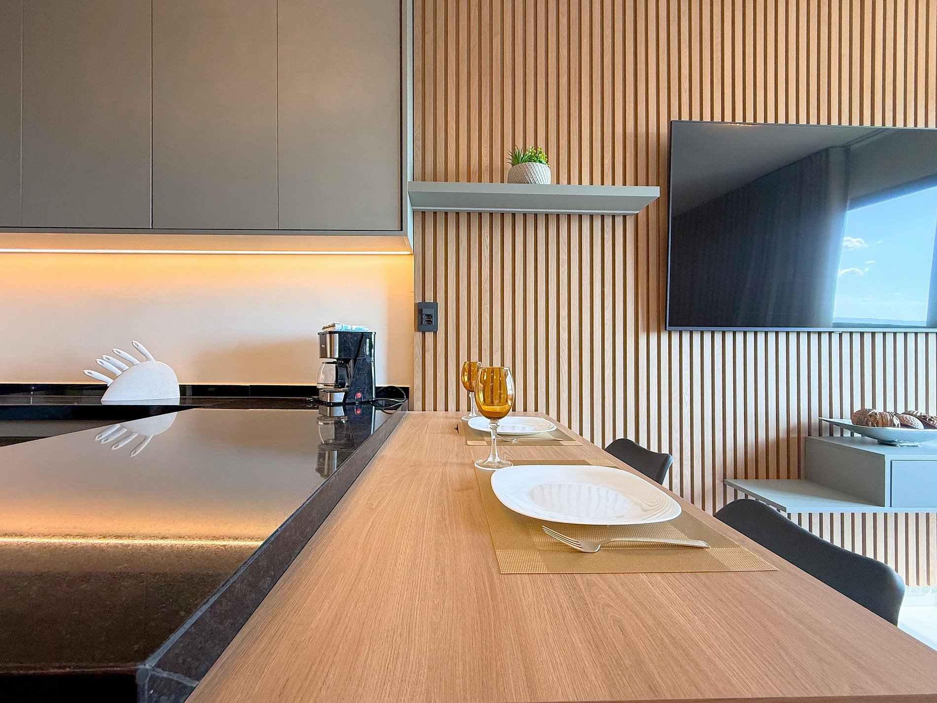 A área social integra cozinha, jantar e estar com fluidez. A bancada em pedra escura contrasta com a madeira clara, enquanto a mesa para refeições e trabalho reforça a versatilidade do espaço. A TV em painel ripado completa o cenário com estética limpa e sofisticada.