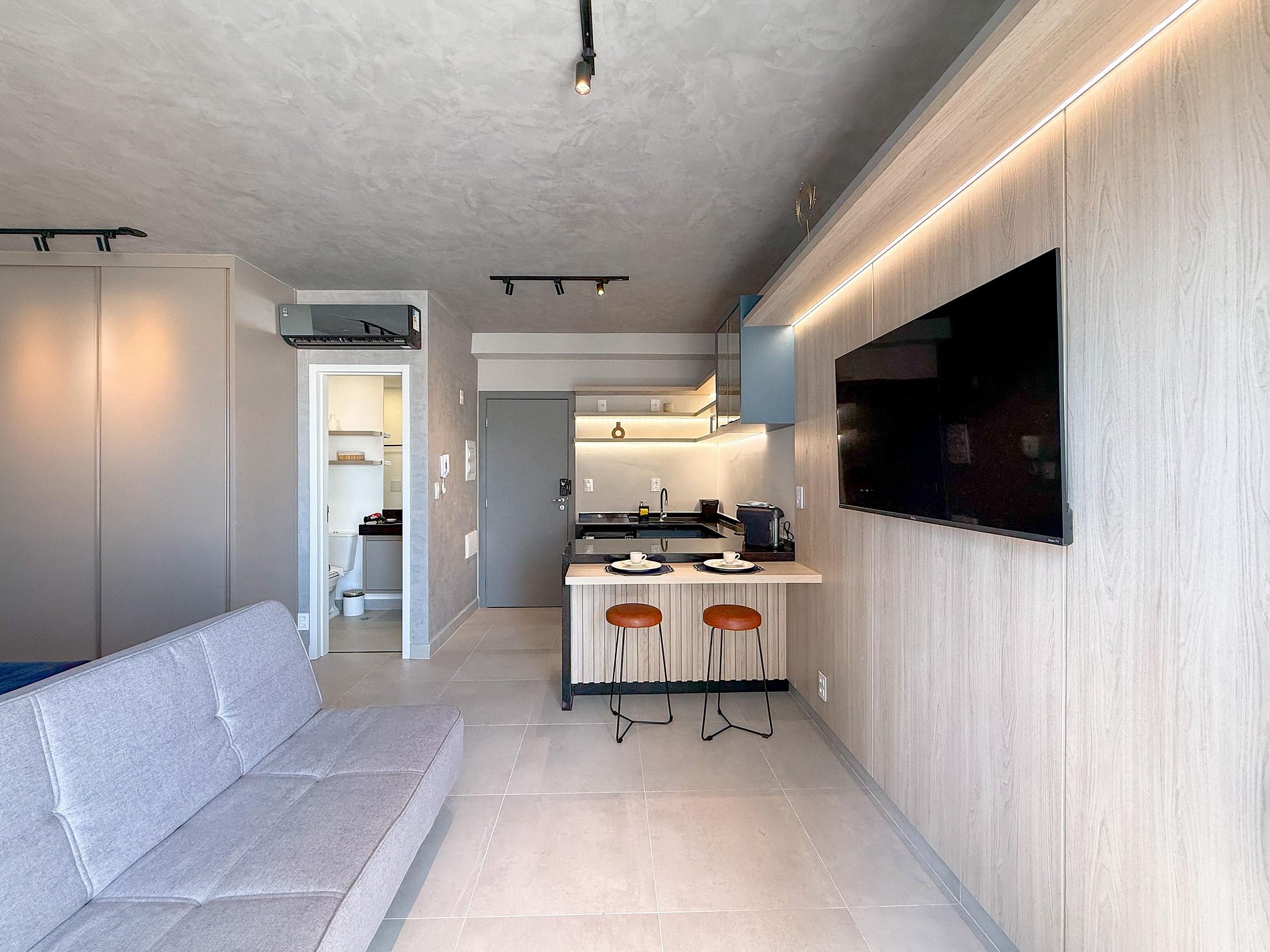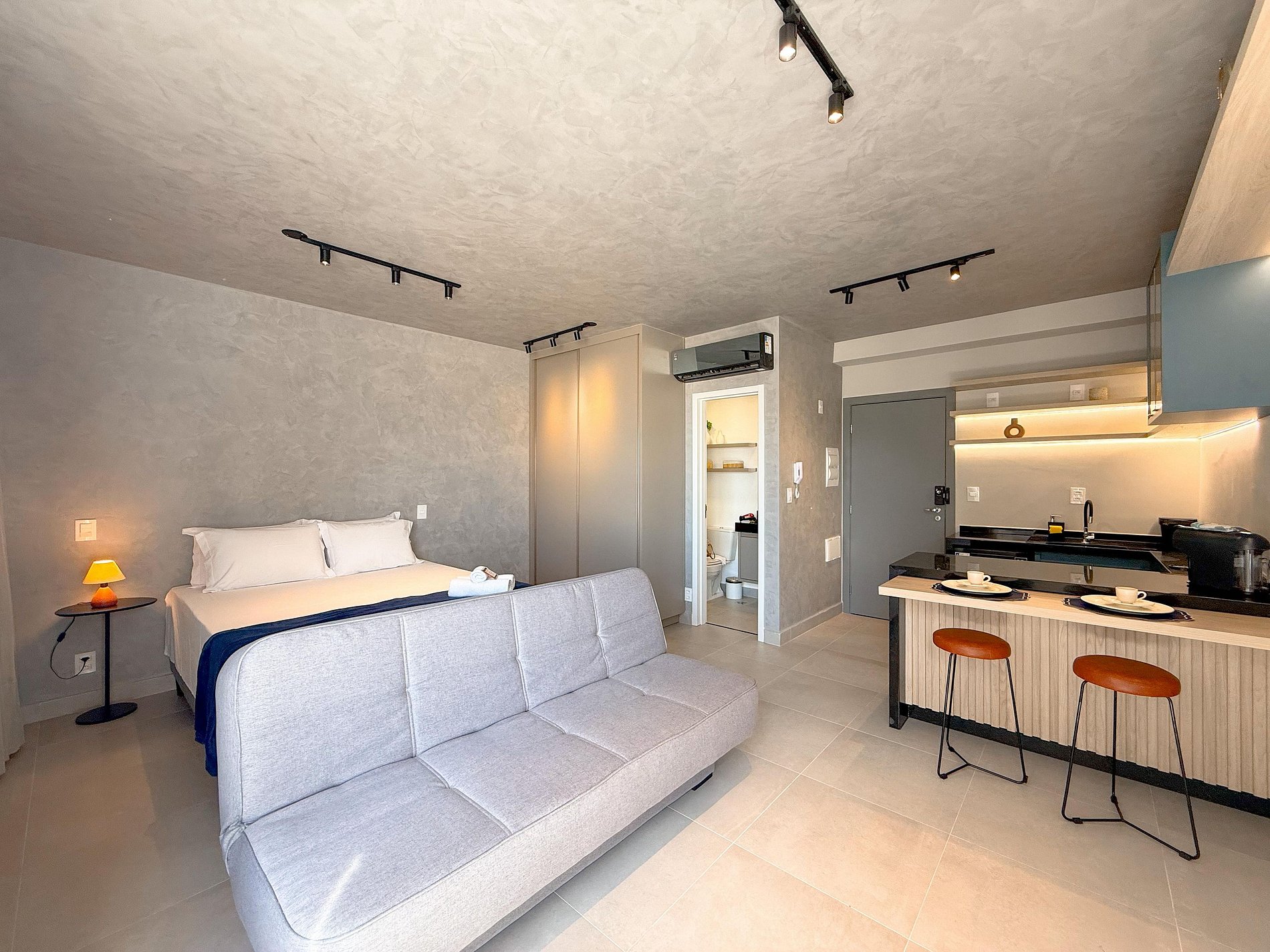 A paleta neutra, os tons de madeira, o concreto aparente e a iluminação indireta criam uma atmosfera sofisticada e tranquila. A área social integra sala, dormitório e cozinha de forma fluida, trazendo amplitude e conforto visual. O sofá posiciona o espaço para momentos de descanso, enquanto a cama garante noites confortáveis e silenciosas.