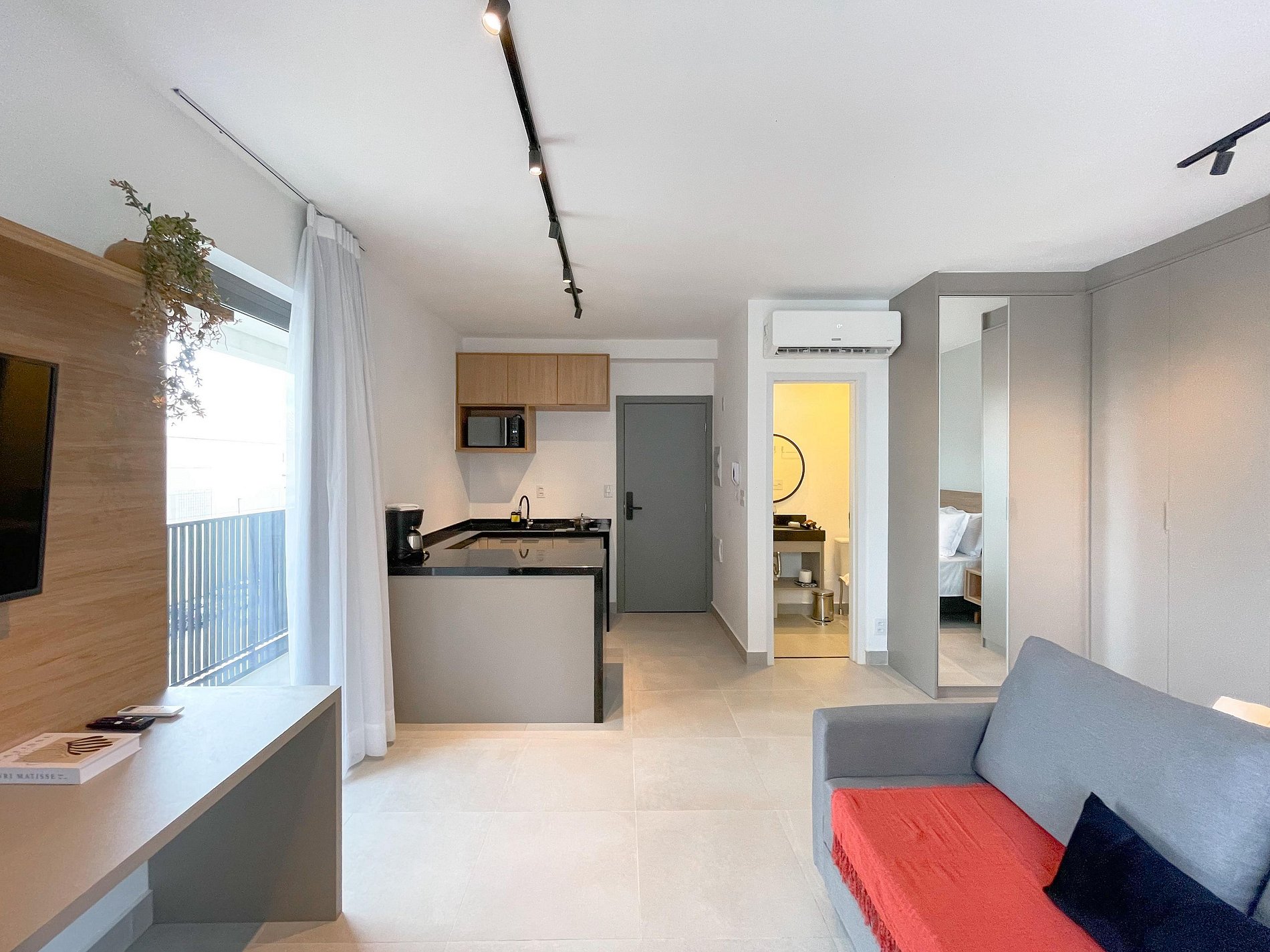 O ambiente é bem distribuído, com cama casal confortável, enxoval completo e iluminação direcionada que cria uma atmosfera aconchegante. A área de estar conta com sofá, smart TV e integração fluida com o restante do espaço, trazendo sensação de amplitude e funcionalidade.