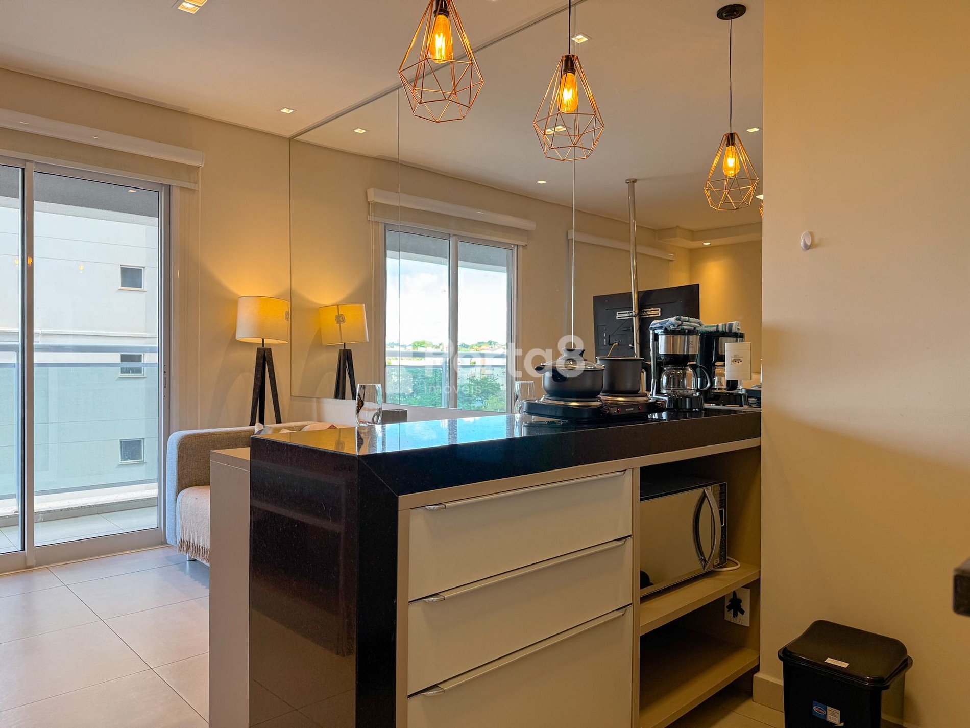 A sala tem um sofá confortável, uma TV Smart com Netflix, YouTube e GloboPlay, e uma iluminação suave que vai te fazer relaxar. Tudo isso com o ar condicionado garantindo o ambiente perfeito.