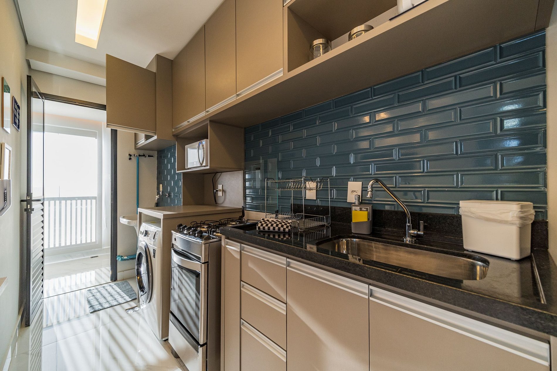 Cozinha com geladeira inox 2 portas, fogão 4 bocas, cafeteira, sanduicheira, pratos, talheres, copos, taças, panelas e utensílios de cozinha fundamentais para o preparo daquele jantar especial. Possui filtro de água.