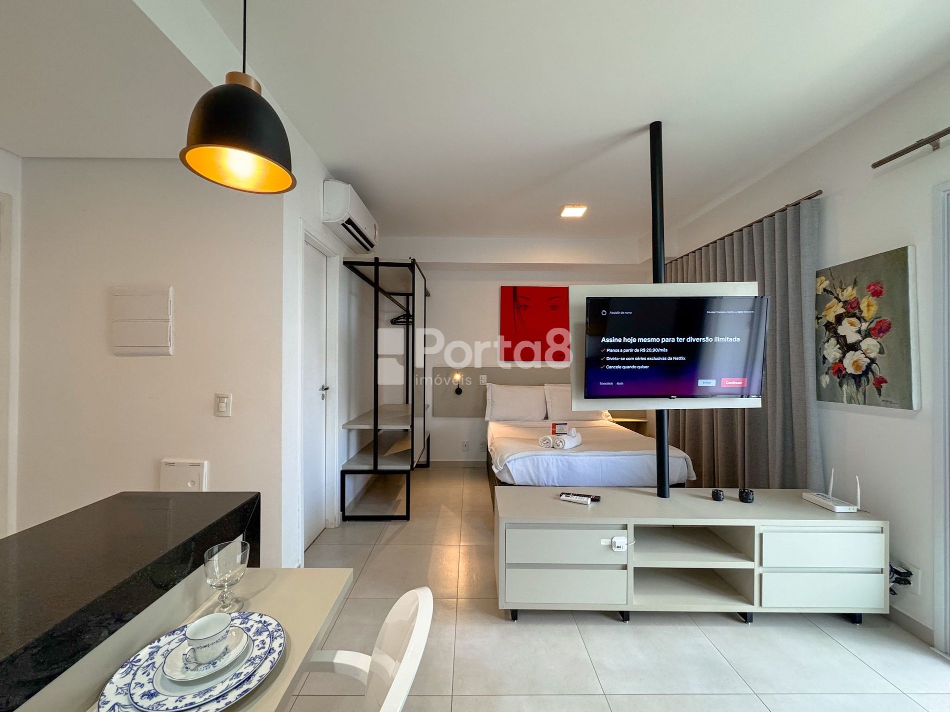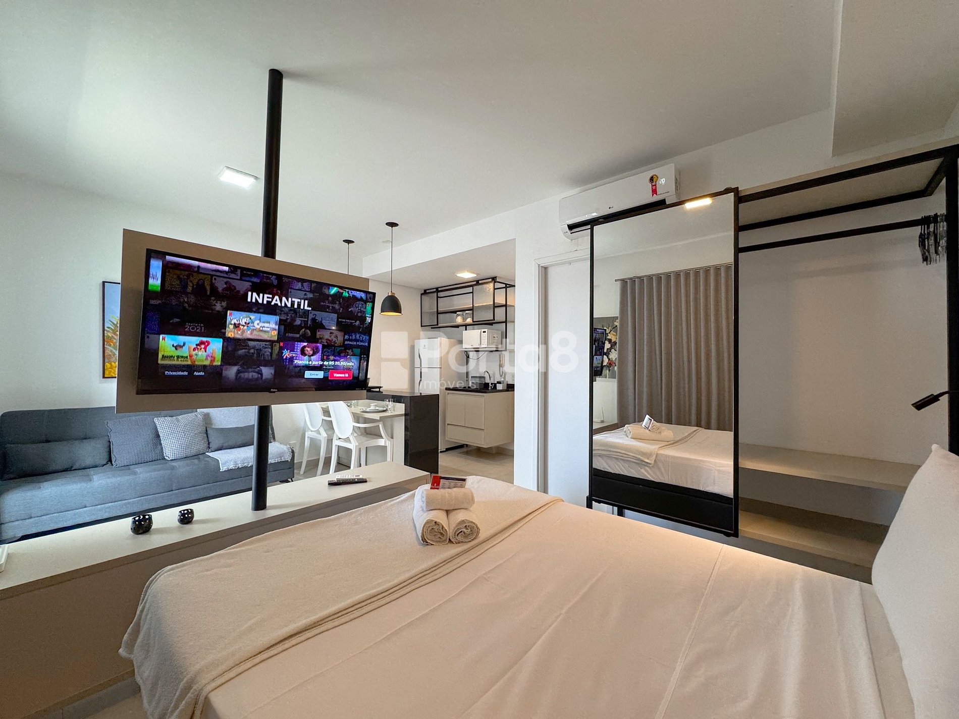 A sala possui um sofá confortável para relaxar. Smart TV com os principais app Netflix, YouTube, GloboPlay está a sua disposição com internet de velocidade de 300MG. O ambiente todo é climatizado com ar condicionado.