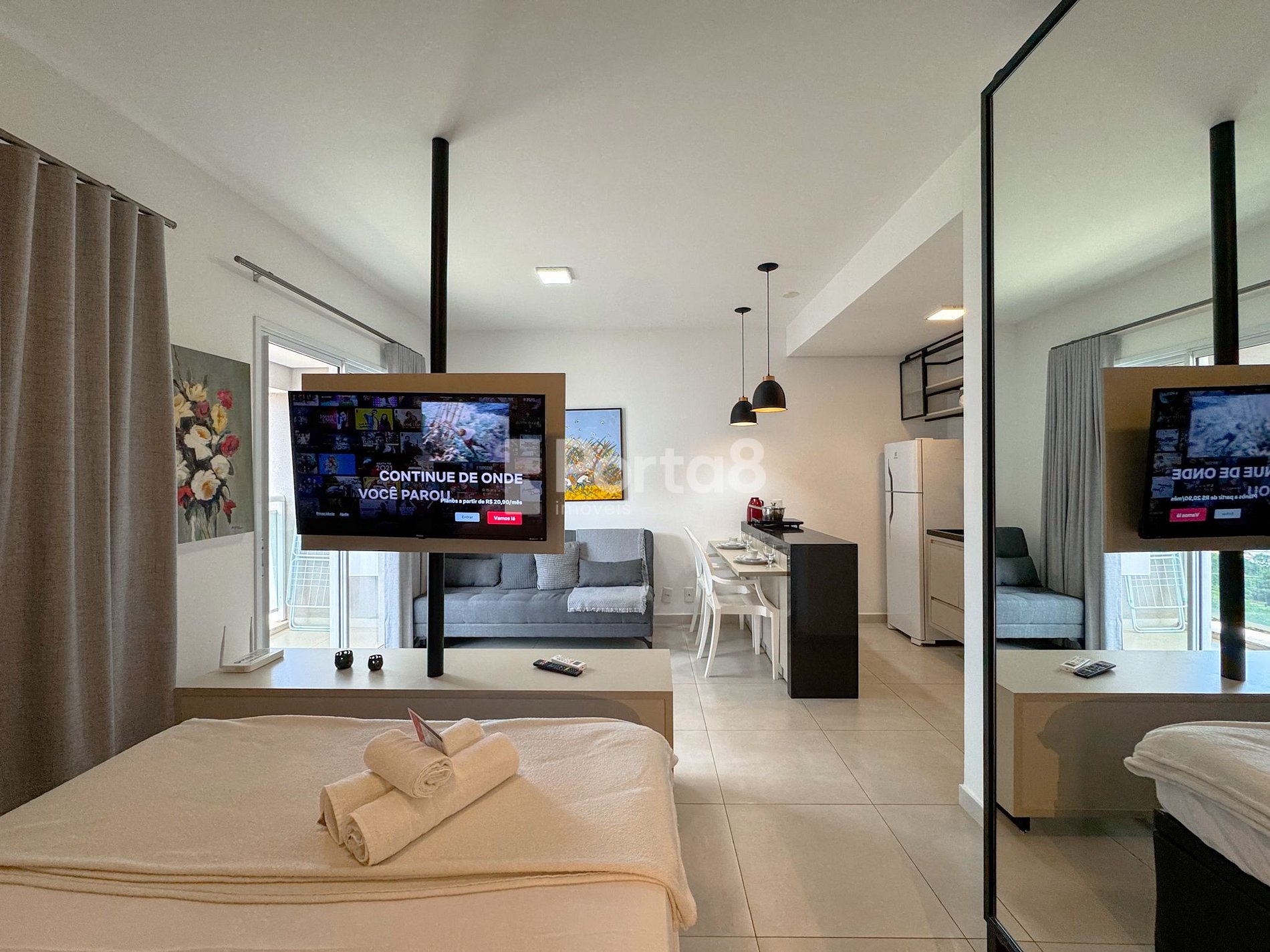 Os apartamentos são modernos, confortáveis e bem equipados, com ar condicionado, cozinha compacta e vista para a cidade. Os moradores têm à disposição estacionamento particular Med Park no próprio condomínio.