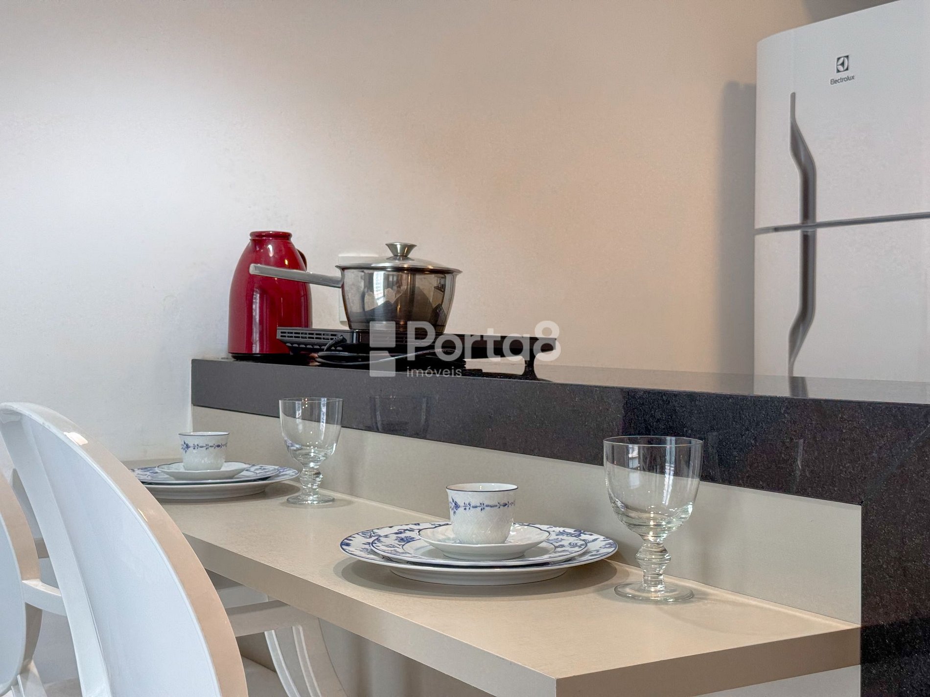 A cozinha compacta possui geladeira e micro-ondas para guardar suas refeições e aquece-las a seu gosto. Tem garrafa térmica e coador para o preparo do café de todo dia! Tem pratos, talheres, copos, taças, facas, tábua e potes de plástico. Na cozinha ainda tem uma chaleira e fogão de indução de 1 boca juntamente com as panelas para você preparar uma refeição a seu gosto.
