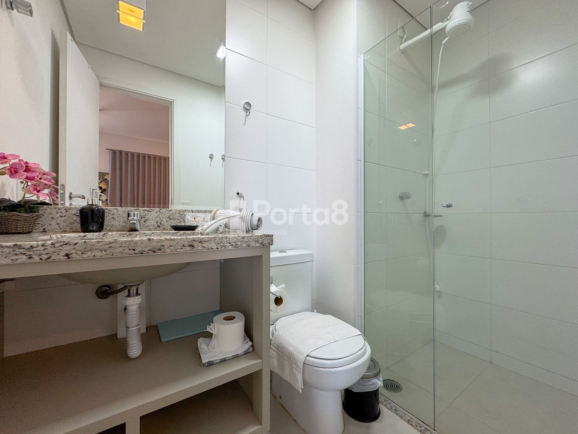 Banheiro com chuveiro quente e enxoval de banho completo.