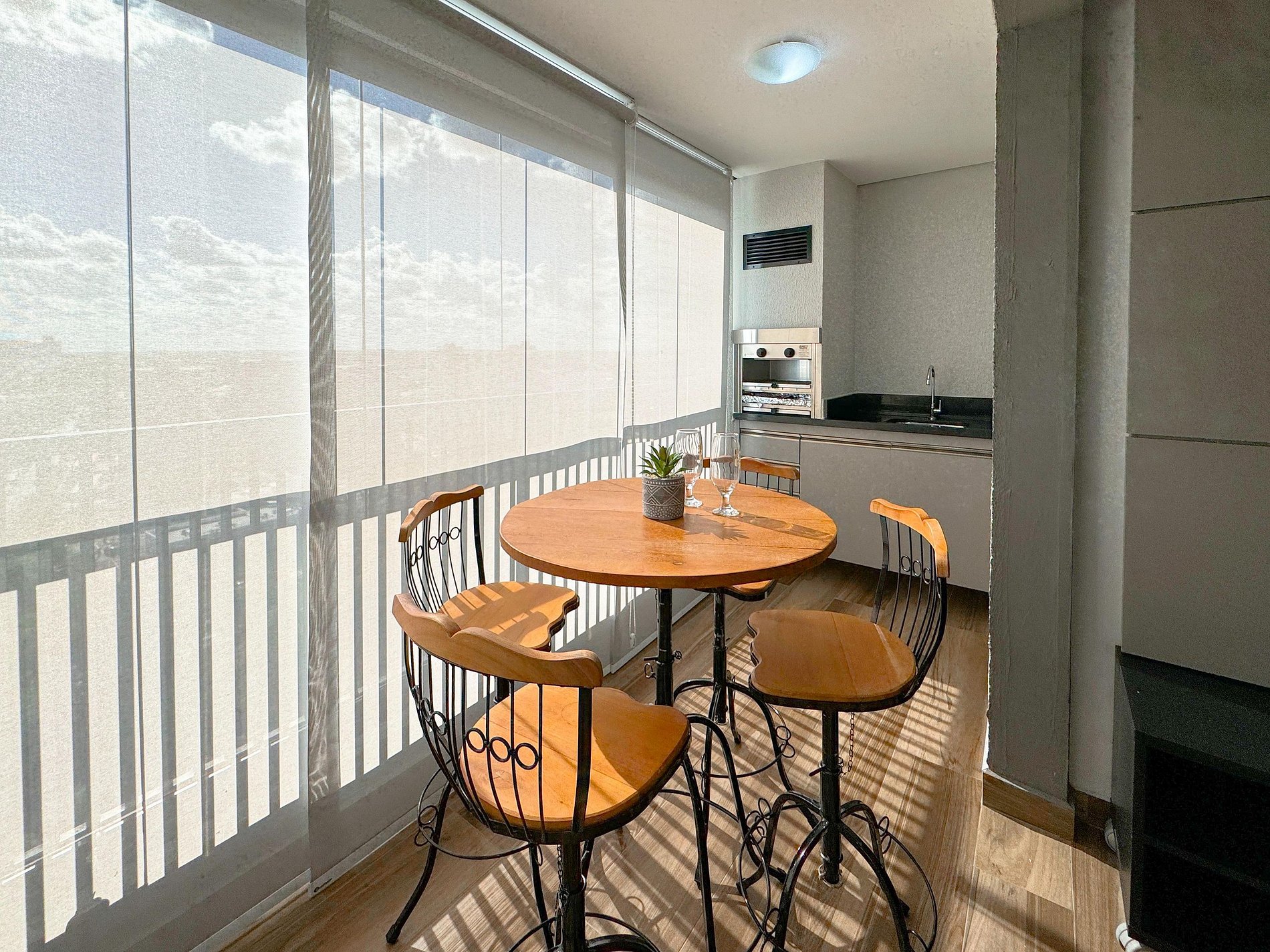 Sacada fechada em vidro, com cortina e mesa bistrô para apreciar a vista incrivel ao anoitecer.