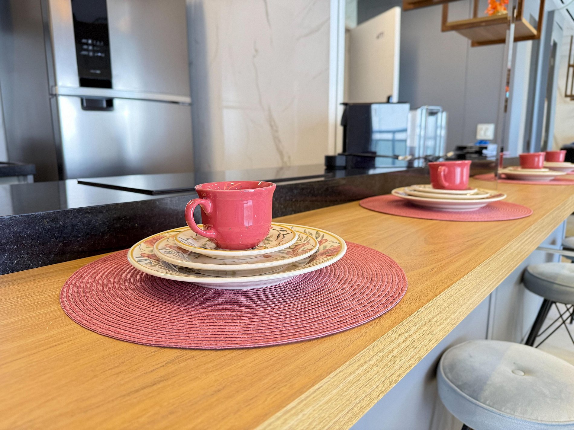 Não importa se você é cozinheiro de mão cheia ou só quer preparar um lanche rápido, a cozinha está equipada com eletrodomésticos de qualidade e uma variedade de louças e utensílios para você se sentir em casa, com uma bancada e banquetas super charmosas.