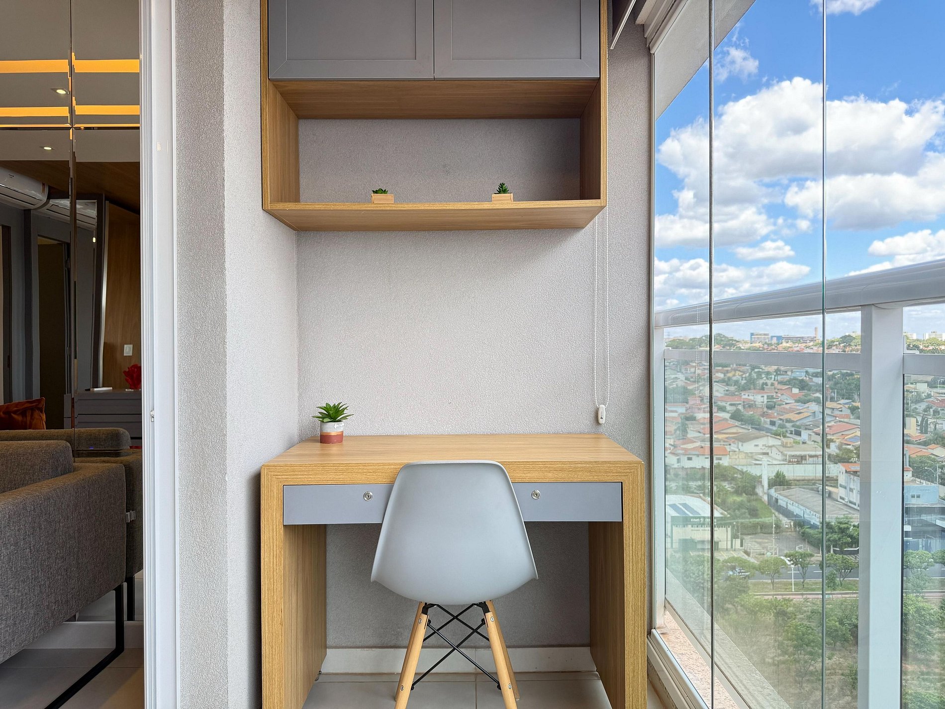 E a varanda? Ah, é um capítulo à parte, com uma mesa e cadeira para você aproveitar a vista enquanto relaxa.