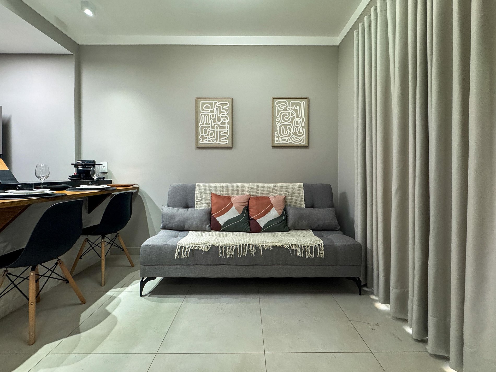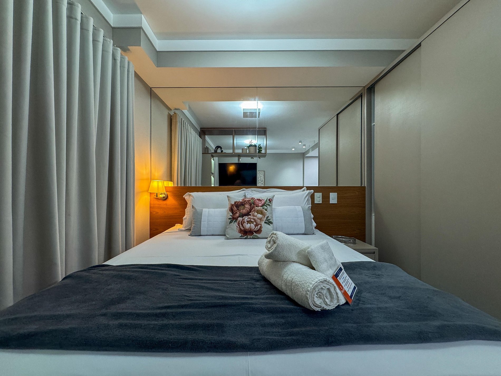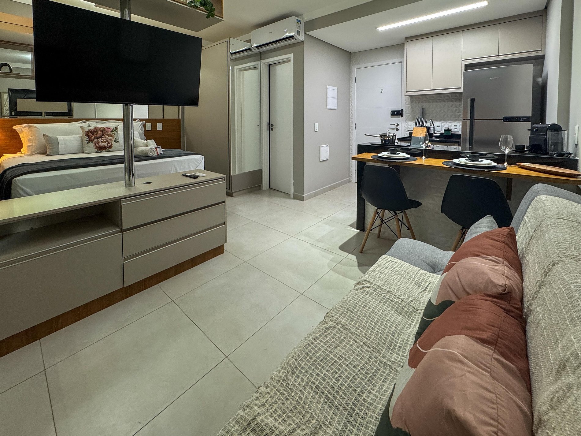 Na varanda, o cenário é inspirador: uma vista linda para o condomínio e, com sorte, uma trilha sonora ao vivo vinda dos restaurantes logo ali pertinho. A atmosfera é única — vibrante e ao mesmo tempo acolhedora.