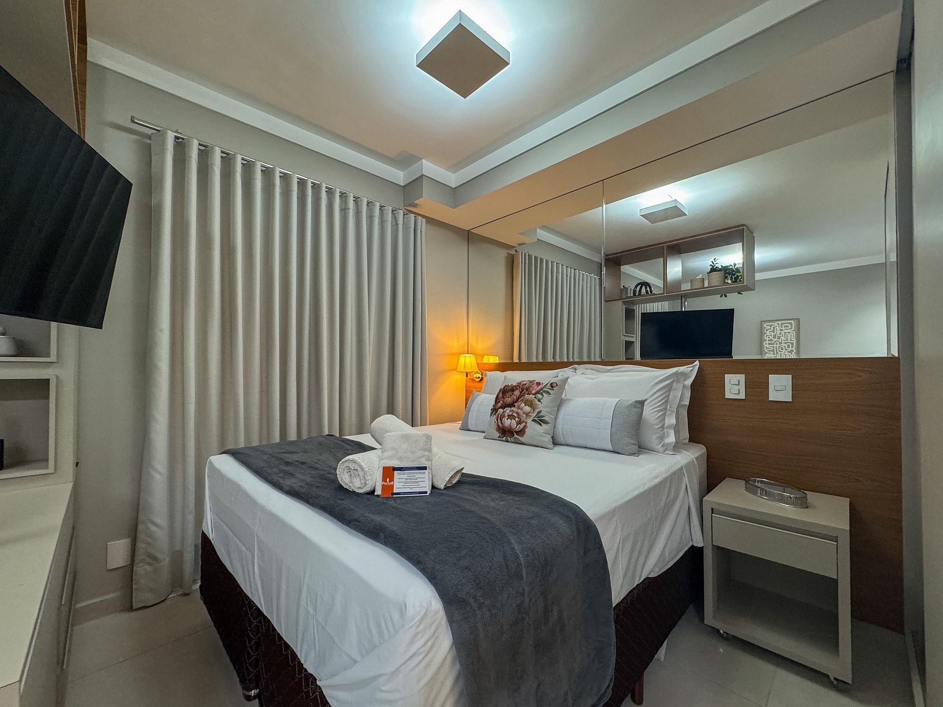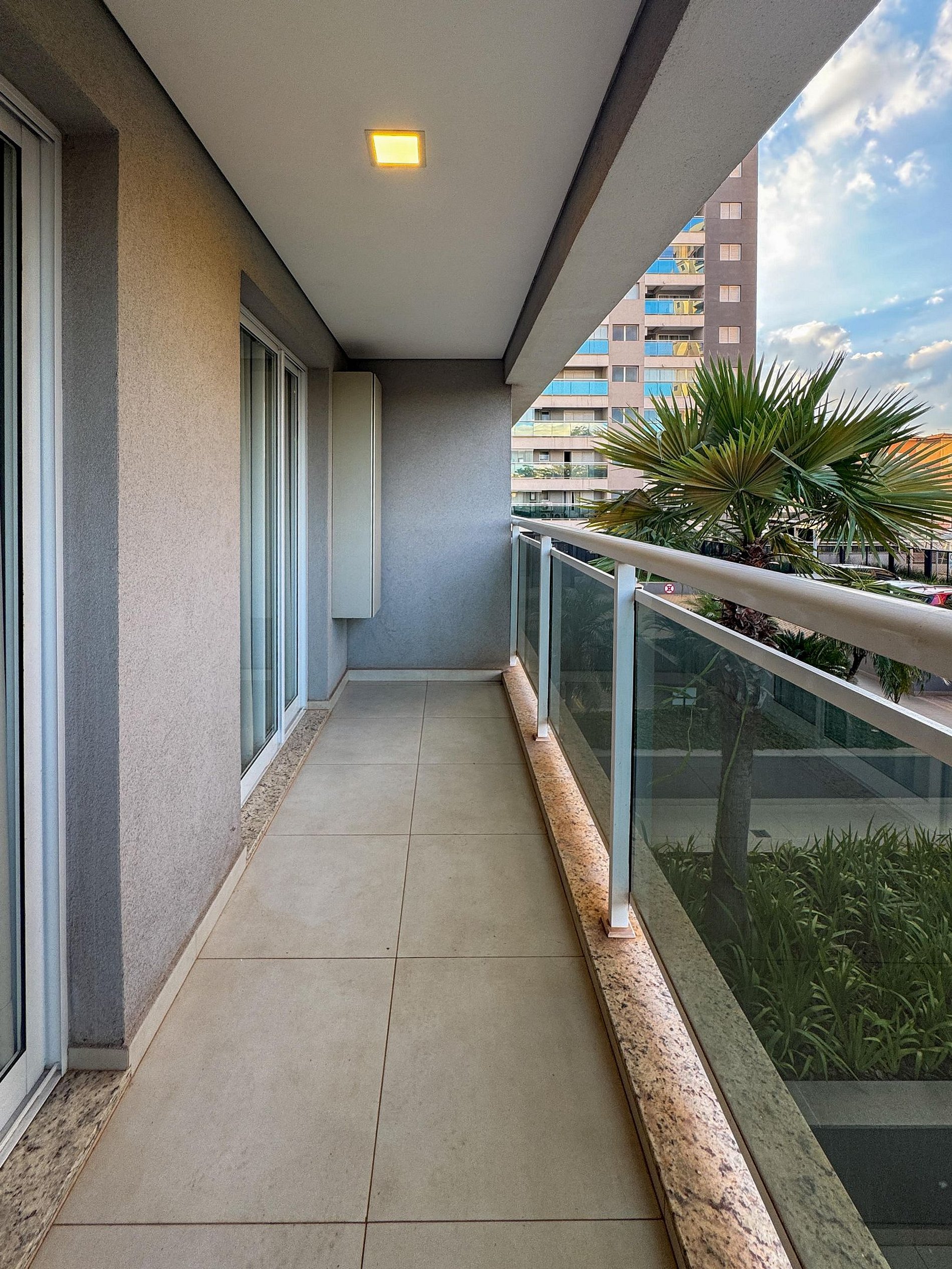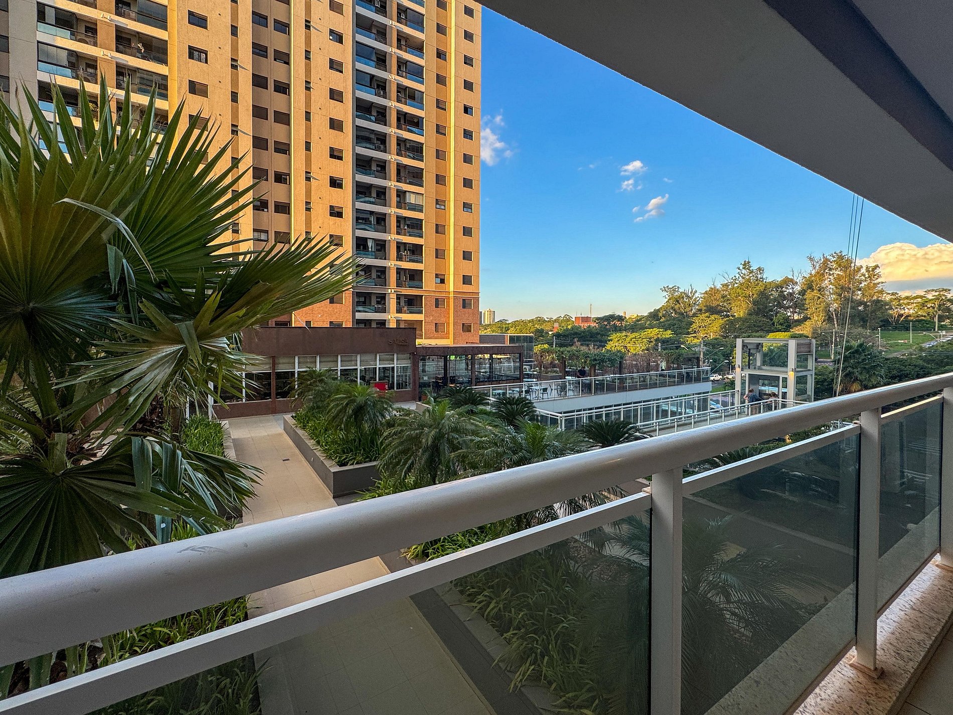 Na varanda, o cenário é inspirador: uma vista linda para o condomínio e, com sorte, uma trilha sonora ao vivo vinda dos restaurantes logo ali pertinho. A atmosfera é única — vibrante e ao mesmo tempo acolhedora.