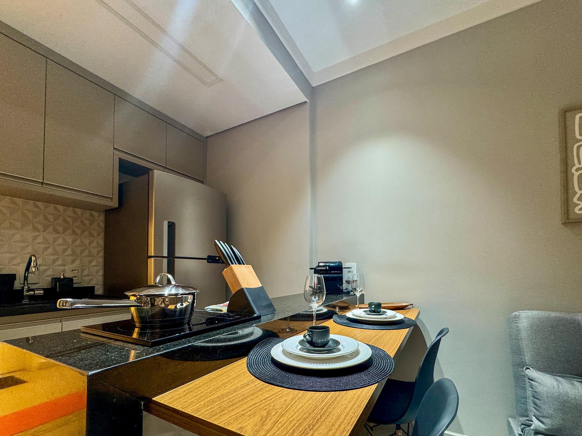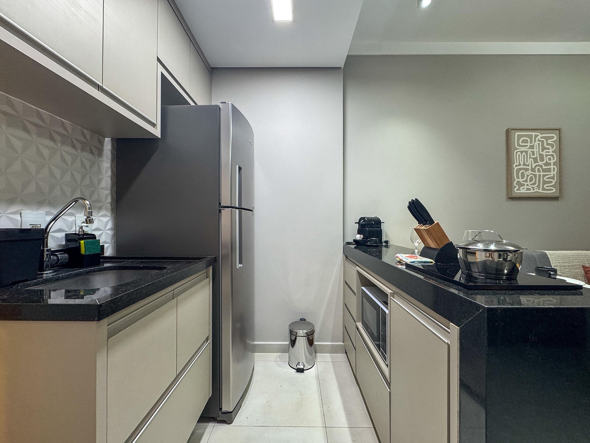 Precisa preparar uma refeição? A cozinha está equipada com fogão cooktop 1 boca, micro-ondas, geladeira e todos os utensílios essenciais. Tem até uma Nespresso para aquele café fresquinho que faz toda a diferença.