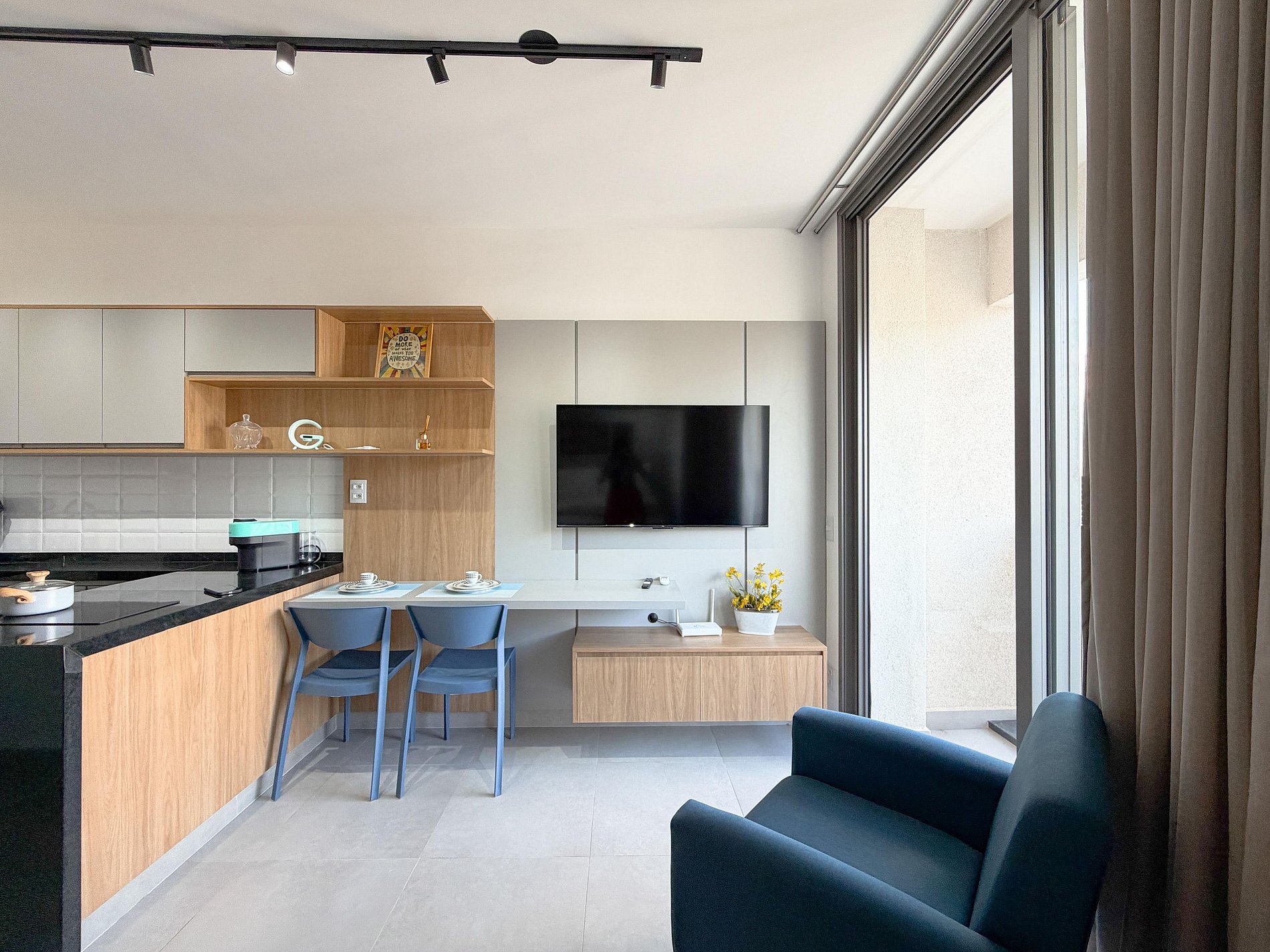 Com uma sacada aberta e vista deslumbrante, o ambiente é banhado por luz natural e convida ao relaxamento. O interior combina tons neutros e mobiliário elegante, criando uma atmosfera leve e sofisticada.
