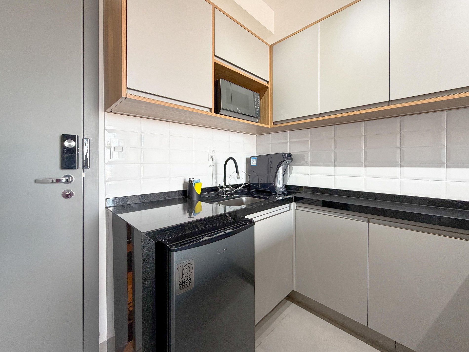 A cozinha completa é um dos destaques — equipada com fogão, micro-ondas, geladeira, cafeteira Nespresso e utensílios, perfeita para preparar suas refeições com praticidade.