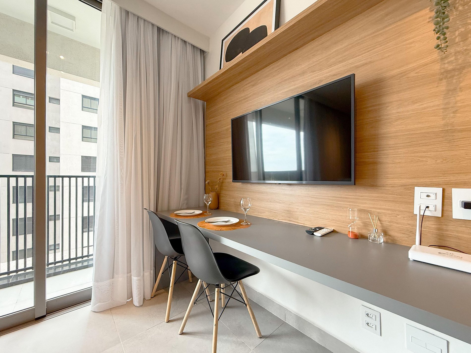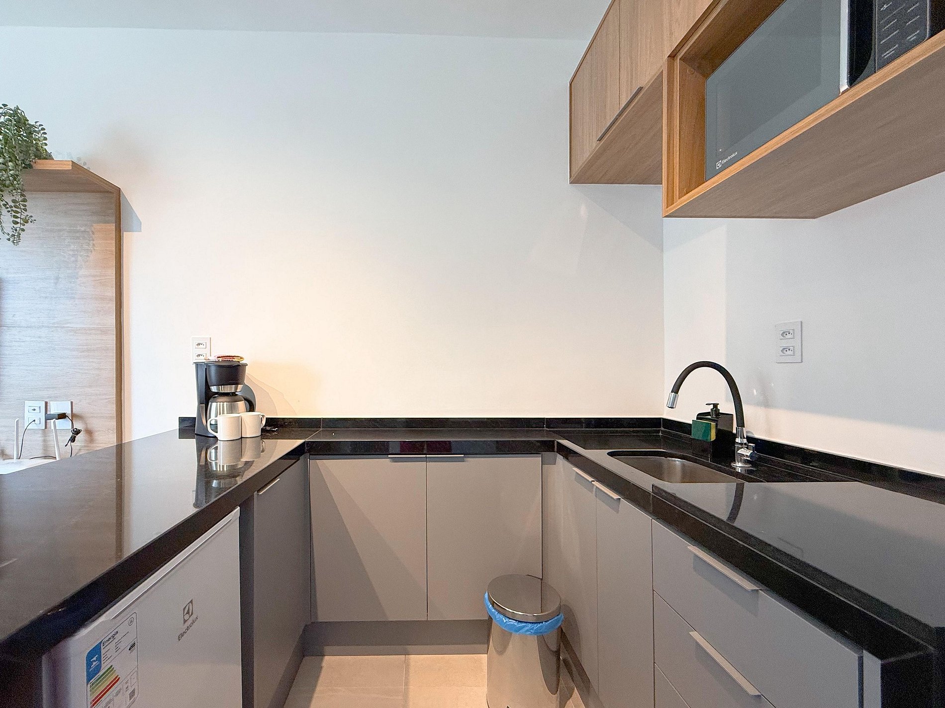 A cozinha é compacta e totalmente equipada, ideal para refeições rápidas ou estadias mais longas. O apê conta ainda com mesa para refeições ou trabalho, TV, ar-condicionado e armários planejados, tudo com acabamento contemporâneo e decoração clean.