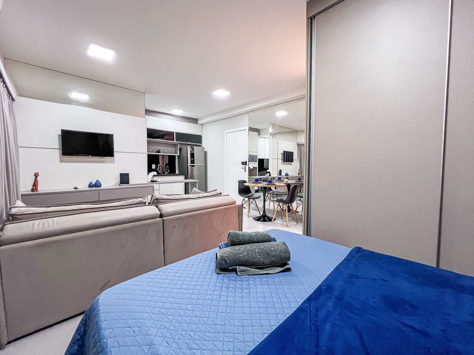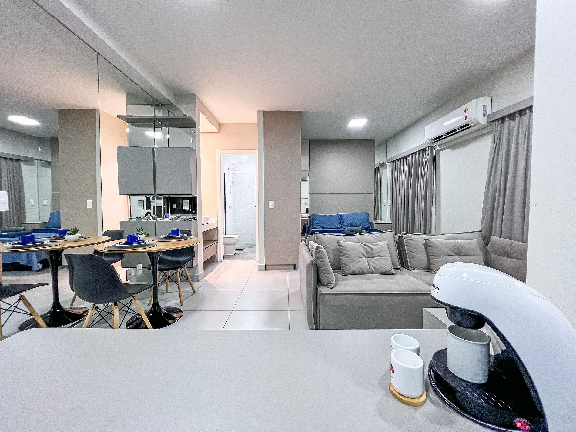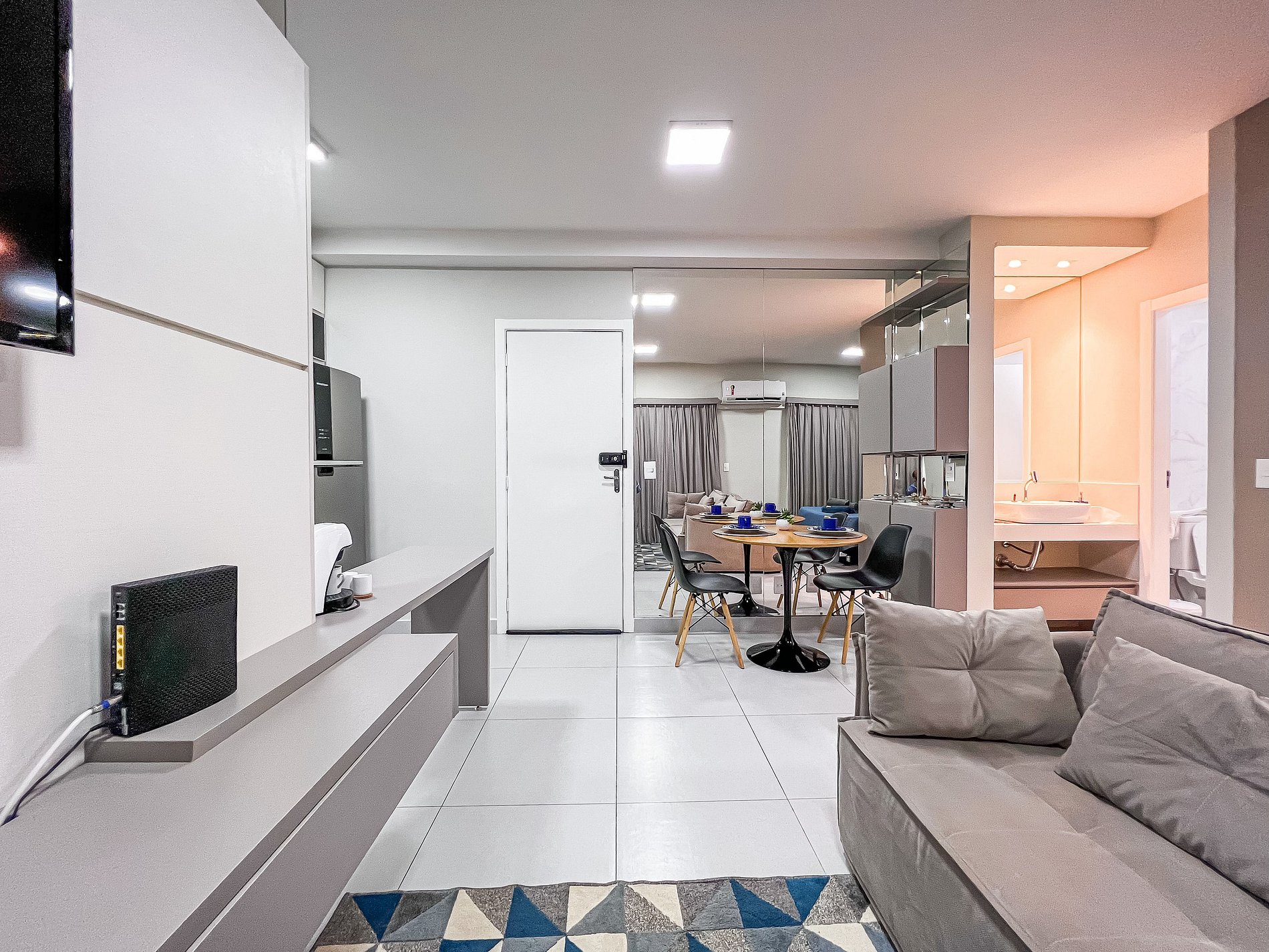 Sala com sofá-cama espaçoso, confortável para 4 pessoas, smart tv e ar condicionado. Ahh internet rápida para assistir o filme sem travar. Ambiente rico em espelhos.