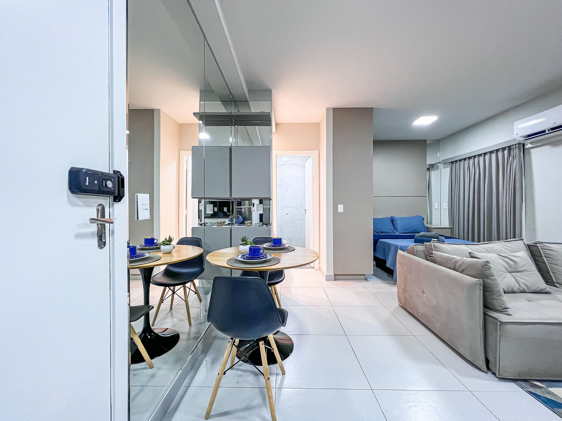 E para facilitar ainda mais, o check-in é moleza! No dia da sua chegada, você vai baixar o app PORTER e cadastrar sua facial para entrar no condomínio e irá receber uma senha para abrir a porta do seu apartamento, sem precisar ficar carregando chaves por aí.