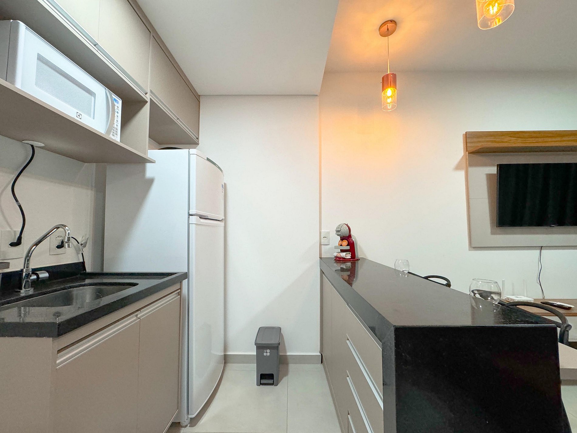 A cozinha é equipada com fogão elétrico 2 bocas, geladeira, micro-ondas, cafeteria DolceGusto e sanduicheira, além de ter pratos, talheres, copos, taças, xícaras e utensílios variados.