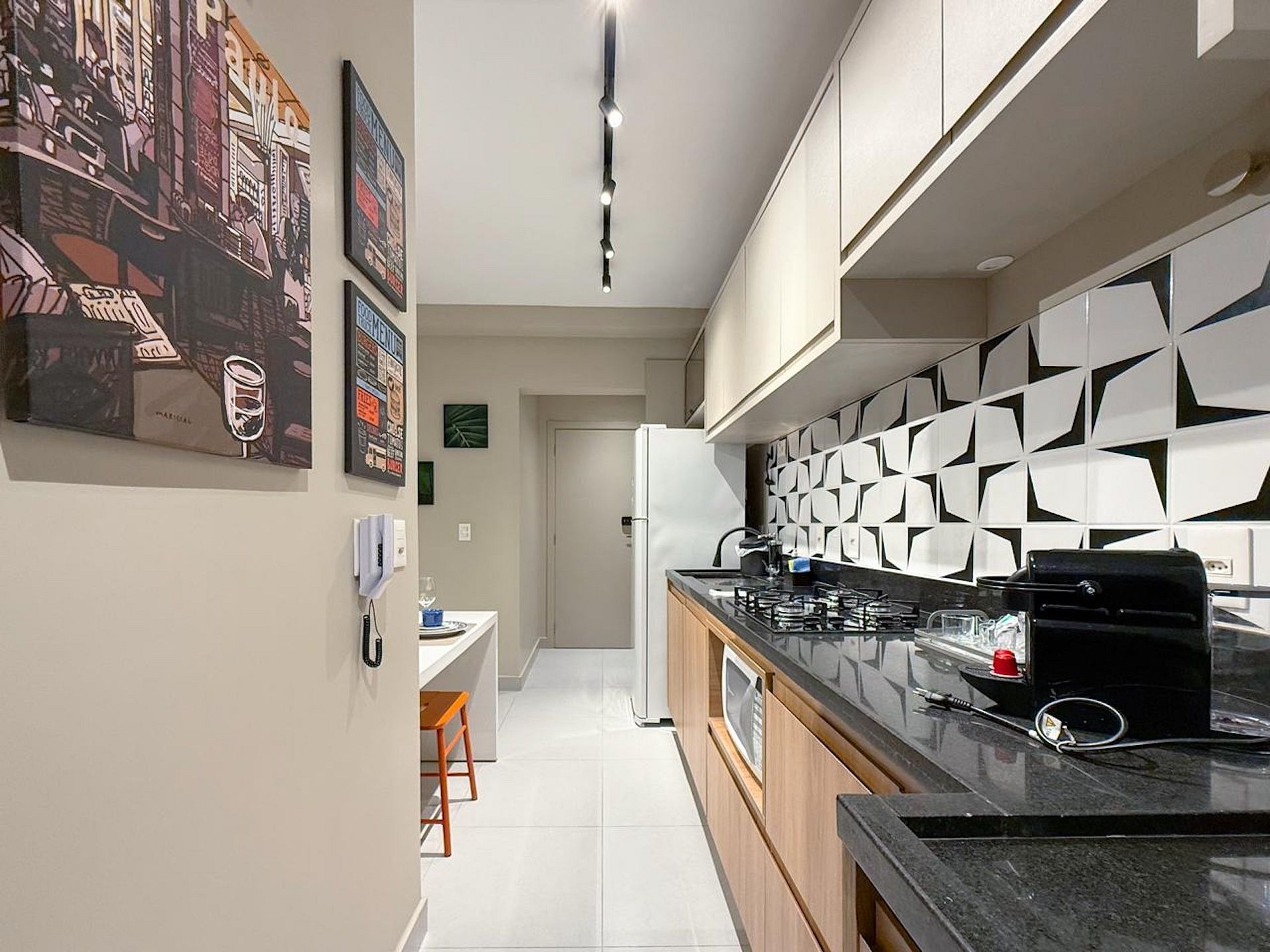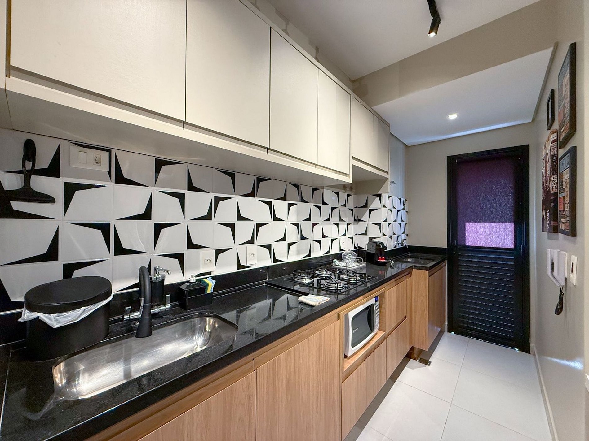 A cozinha é completa e equipada com geladeira inox, fogão, micro-ondas, cafeteira Nespresso, panelas e utensílios, para que você prepare desde um café rápido até um jantar especial.