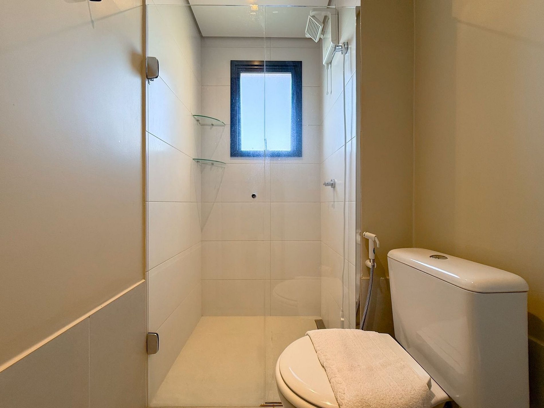 O banheiro é moderno, com box de vidro, ducha quente, secador de cabelos e enxoval de banho macio.
