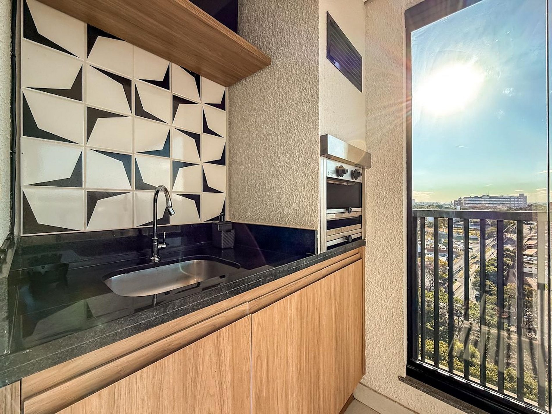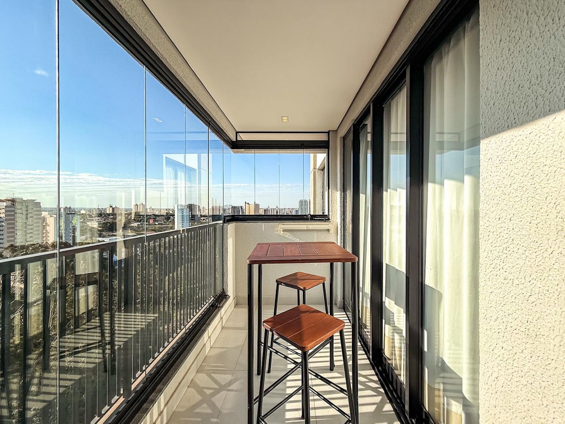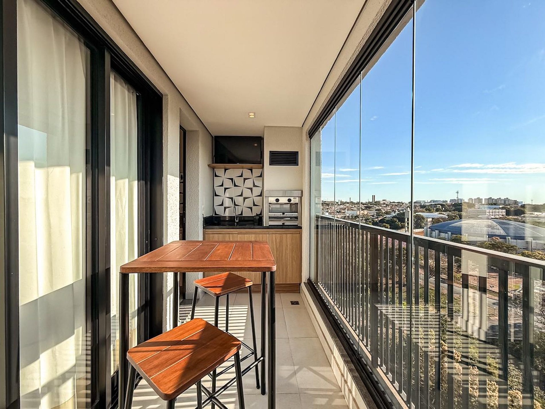 A sacada, fechada em vidro, amplia o ambiente e é equipada com churrasqueira e mesa alta, ideal para refeições ou para trabalhar com luz natural e vista para a cidade.