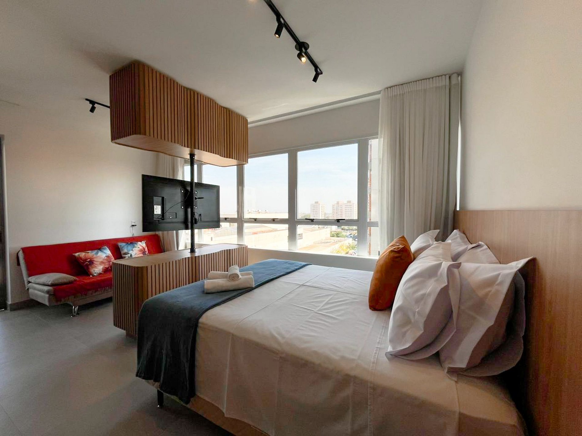 O ambiente foi cuidadosamente planejado: cama queen aconchegante com enxoval completo, sofá-cama versátil para receber amigos ou relaxar, Smart TV e internet de 600 mega que tornam o espaço ideal tanto para lazer quanto para home office.