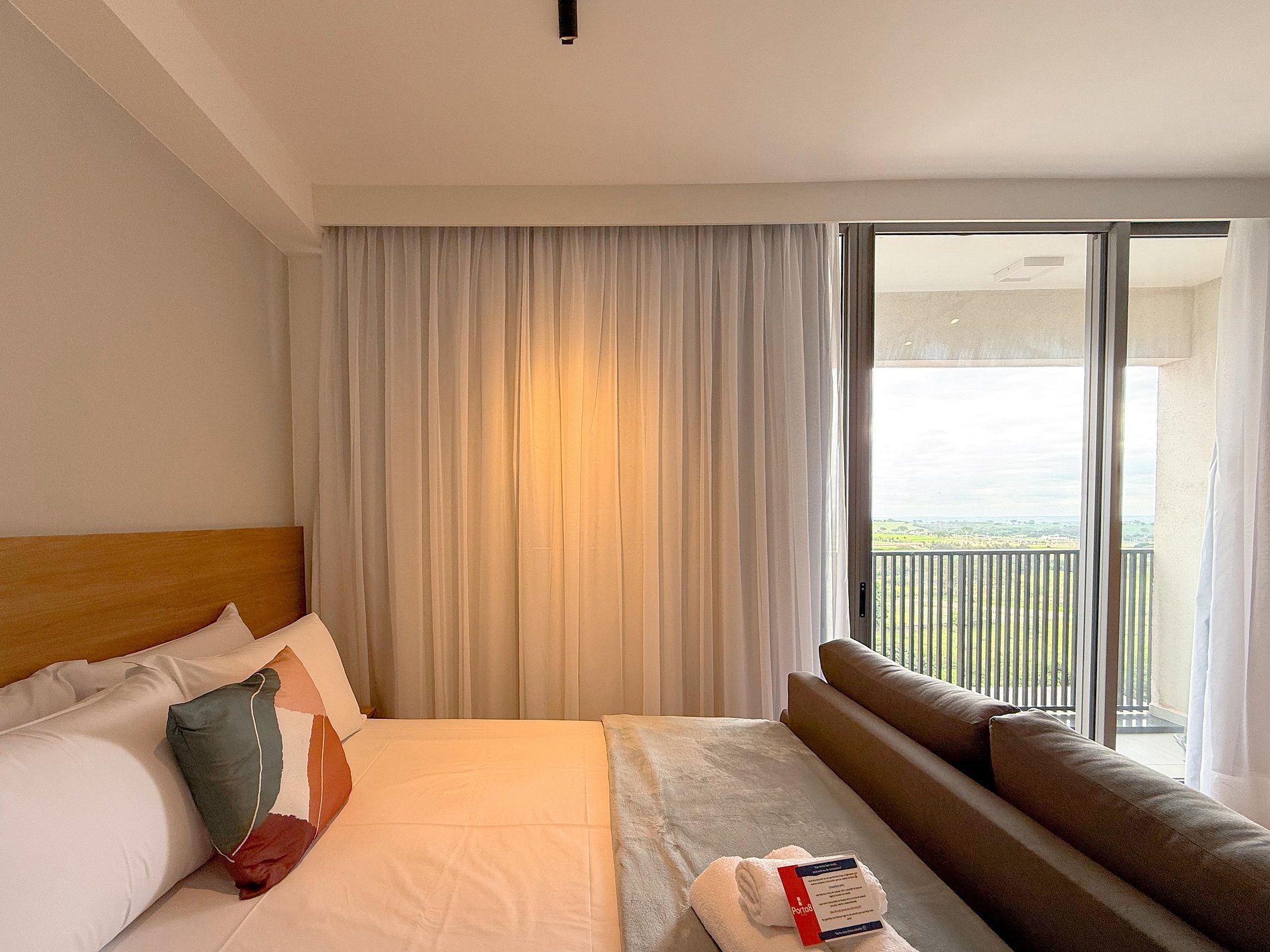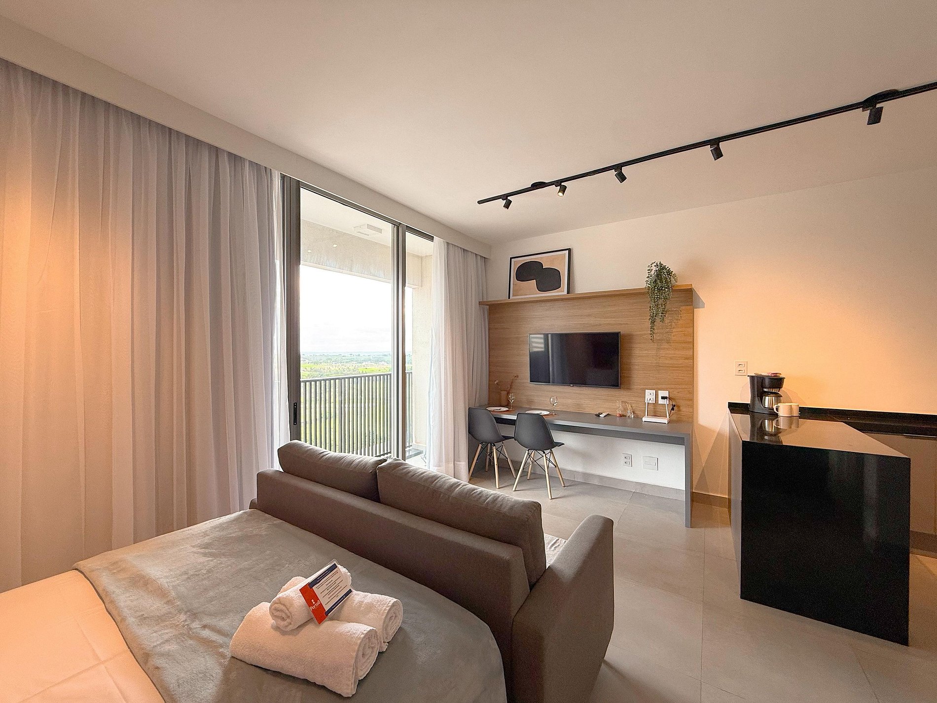 O espaço integra dormitório, estar e cozinha de forma inteligente. A cama é confortável, com enxoval de qualidade, e o sofá complementa o ambiente, criando um espaço aconchegante para relaxar. A varanda amplia a conexão com a vista e torna o ambiente ainda mais agradável.