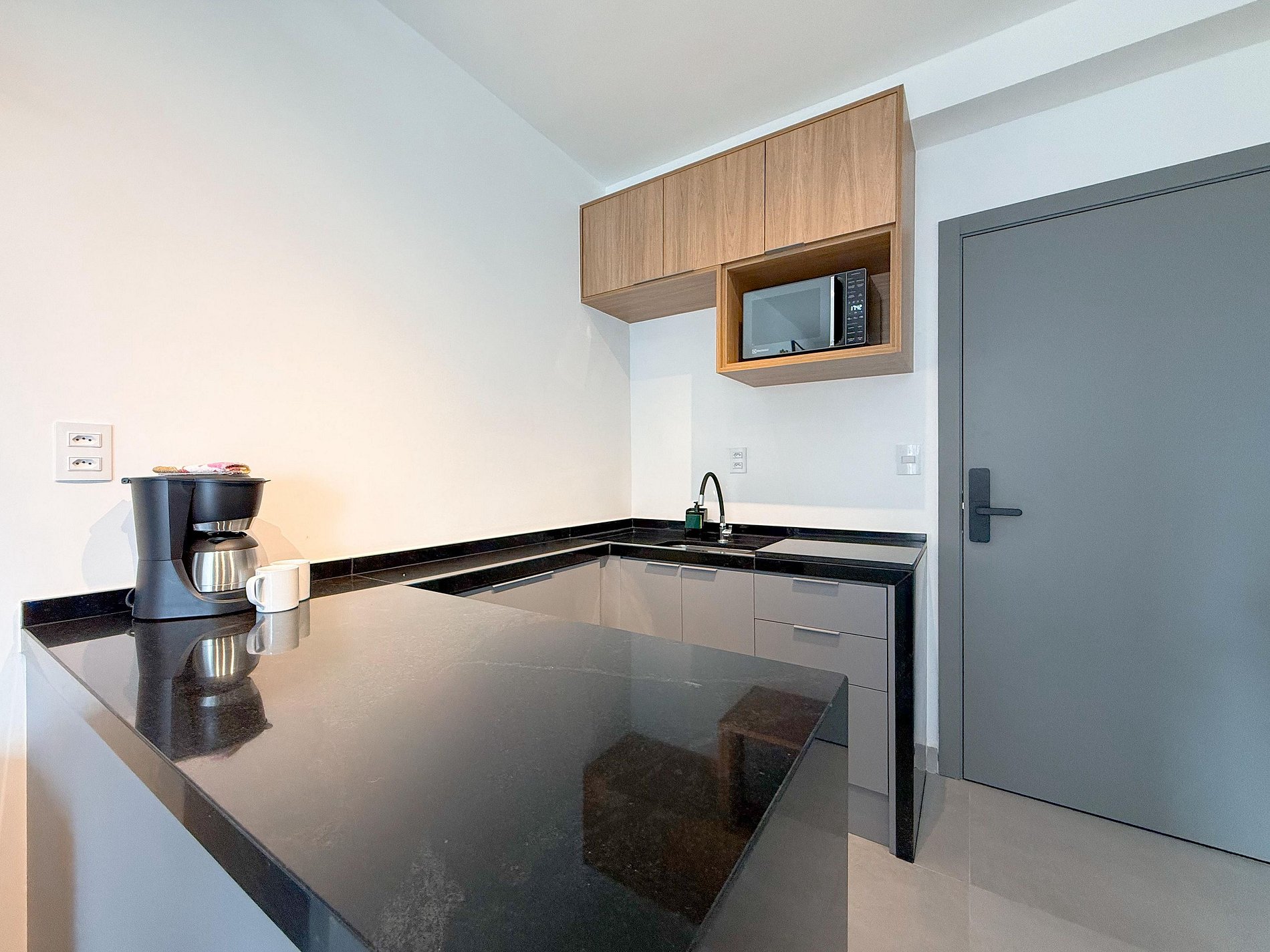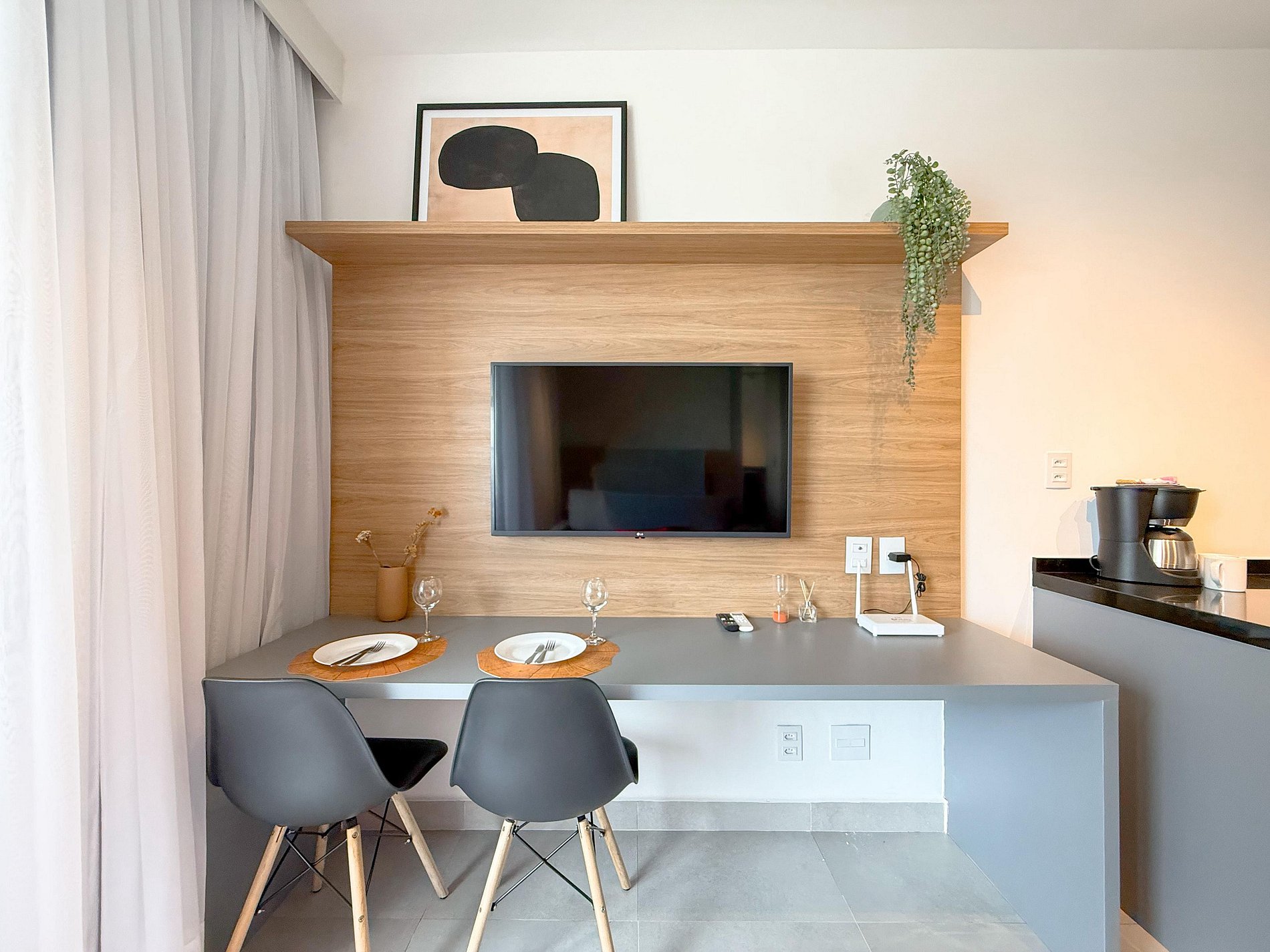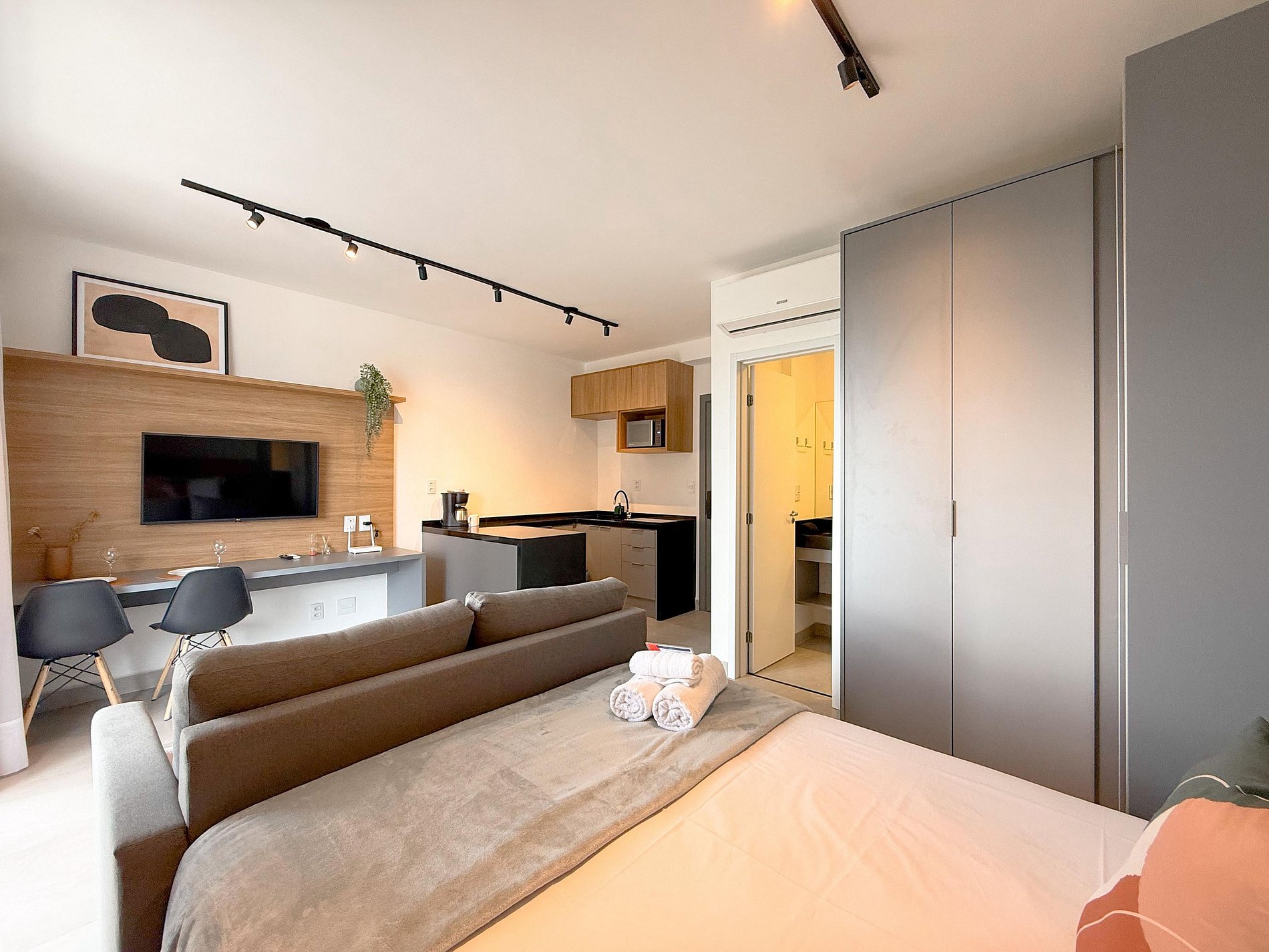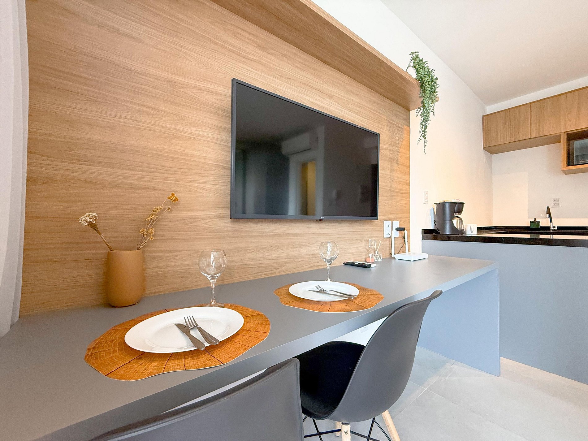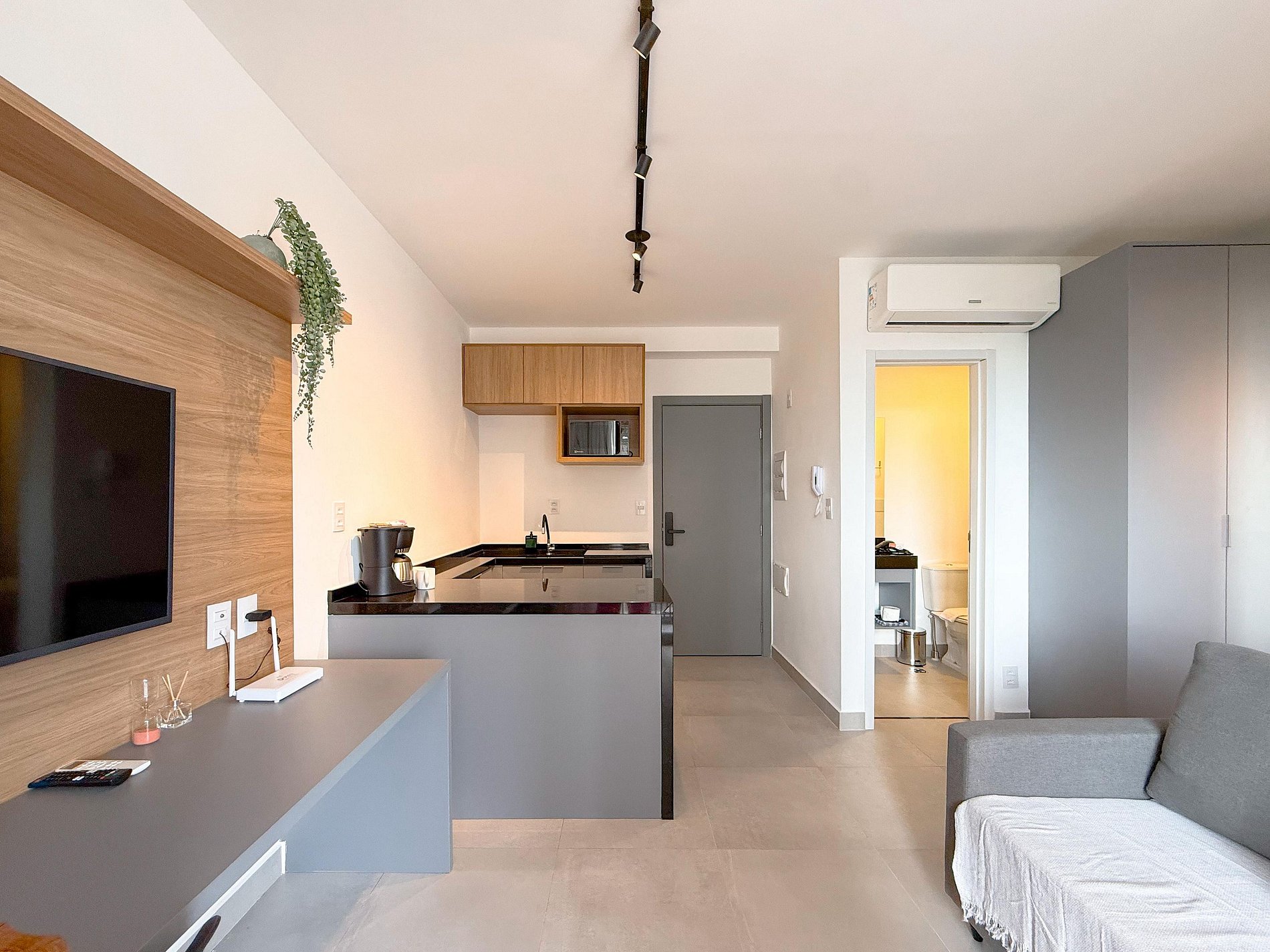 A cozinha é compacta e totalmente equipada, ideal para refeições rápidas ou estadias mais longas. O apê conta ainda com mesa para refeições ou trabalho, TV, ar-condicionado e armários planejados, tudo com acabamento contemporâneo e decoração clean.