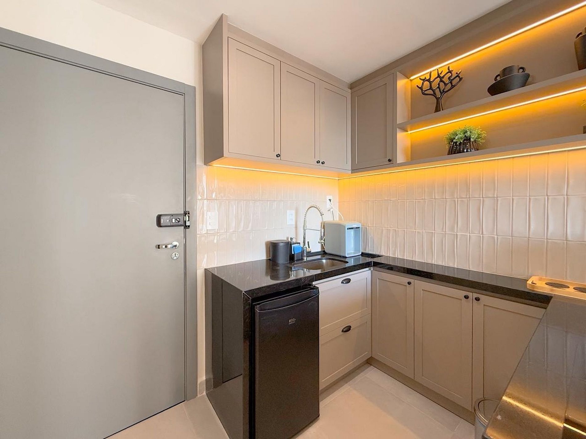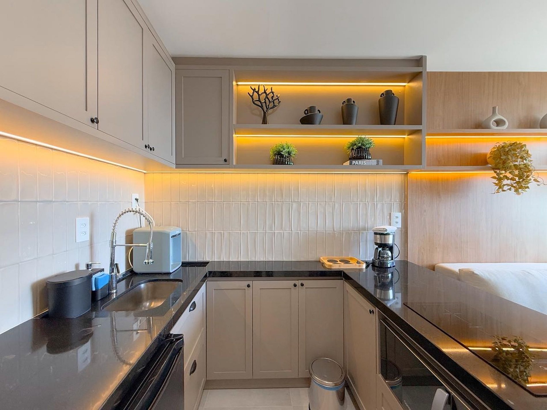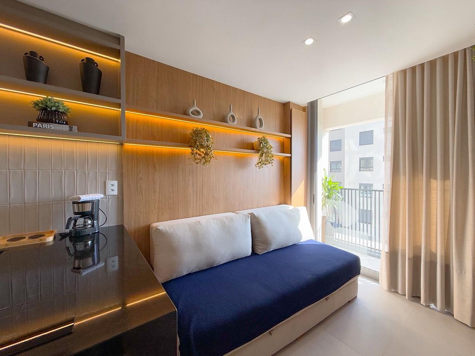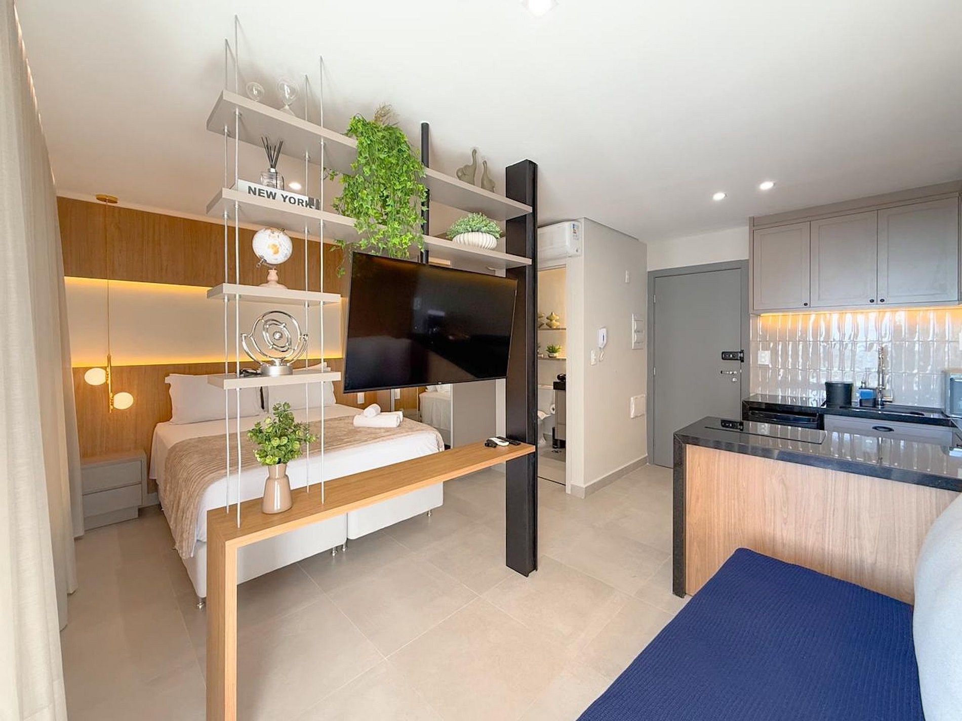 Este estúdio no 14º andar do Hype 017 foi projetado com detalhes inteligentes que transformam o ambiente em um refúgio moderno e acolhedor: marcenaria elegante, iluminação embutida que valoriza cada textura, cortinas longas que trazem suavidade e um layout que integra tudo com harmonia.