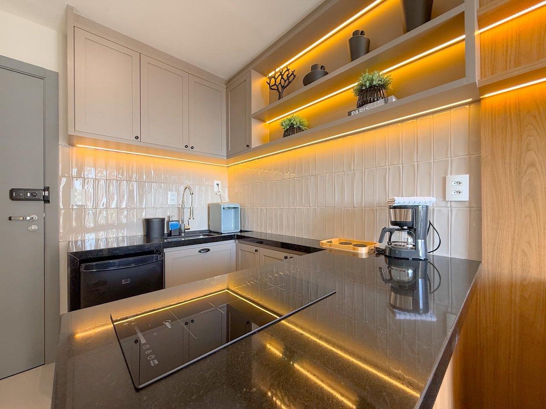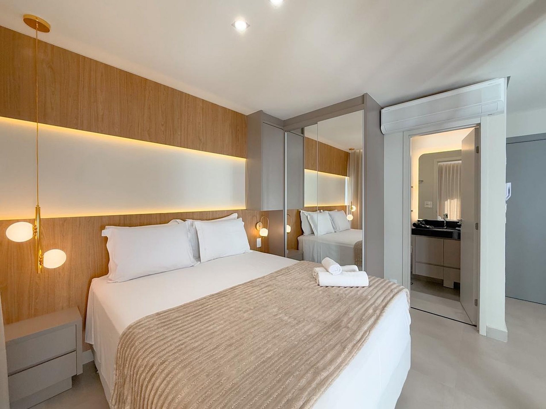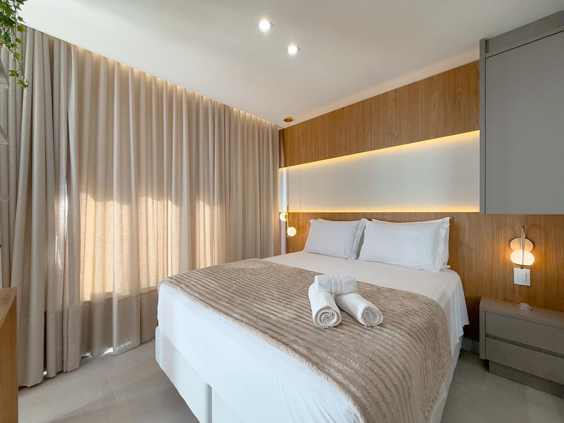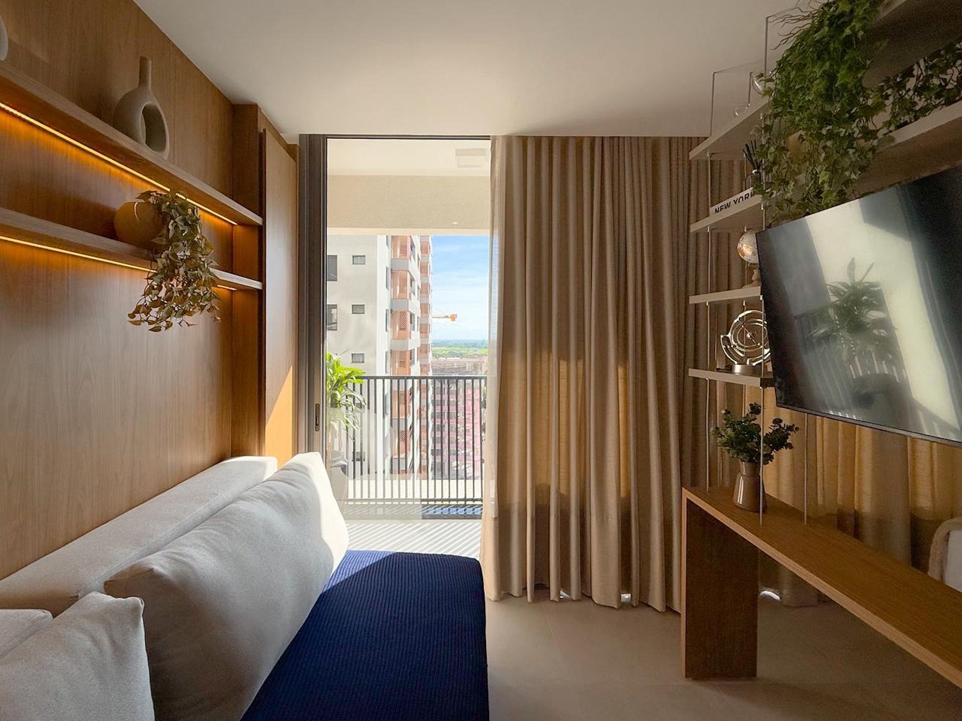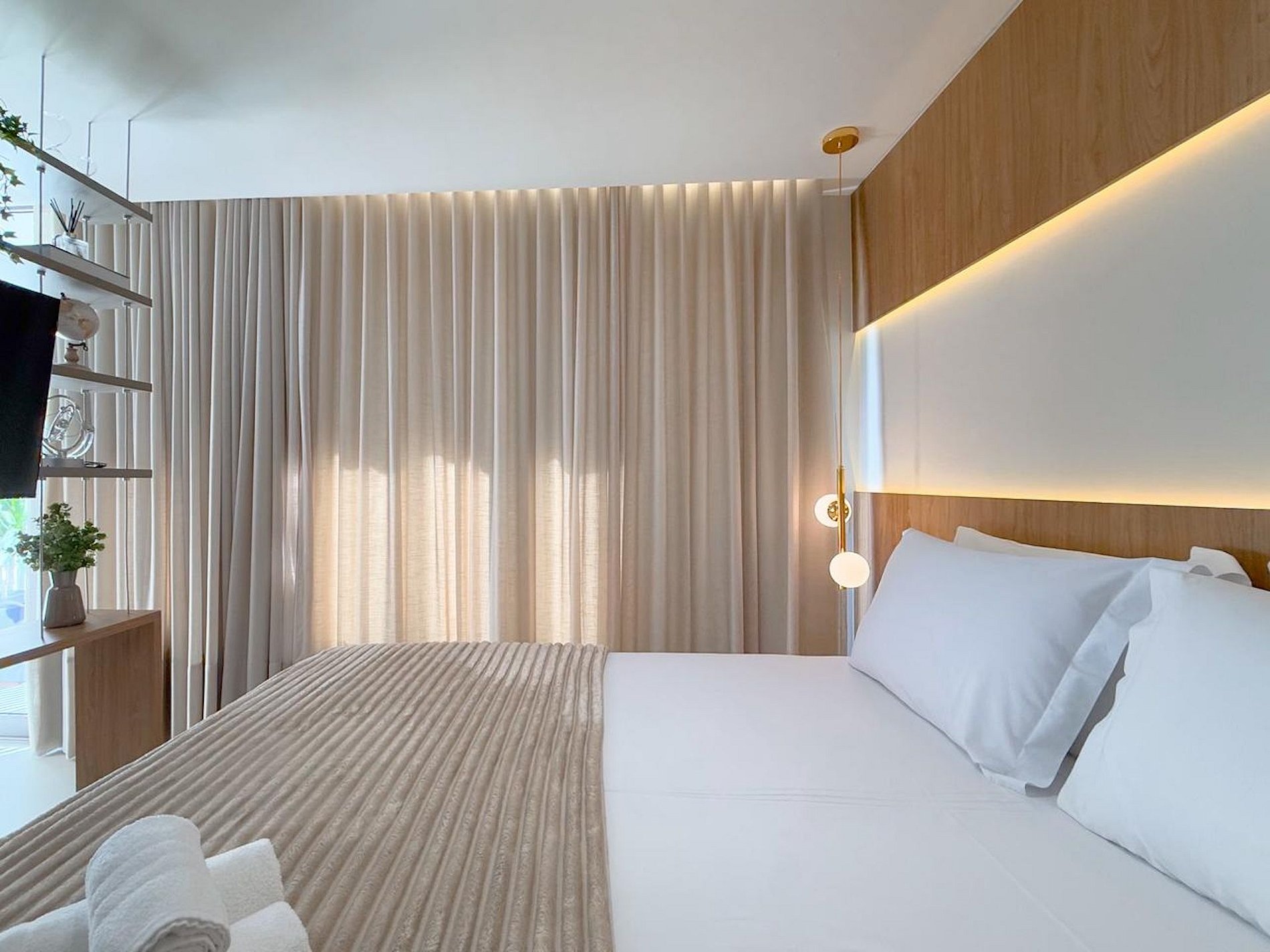 Este estúdio no 14º andar do Hype 017 foi projetado com detalhes inteligentes que transformam o ambiente em um refúgio moderno e acolhedor: marcenaria elegante, iluminação embutida que valoriza cada textura, cortinas longas que trazem suavidade e um layout que integra tudo com harmonia.