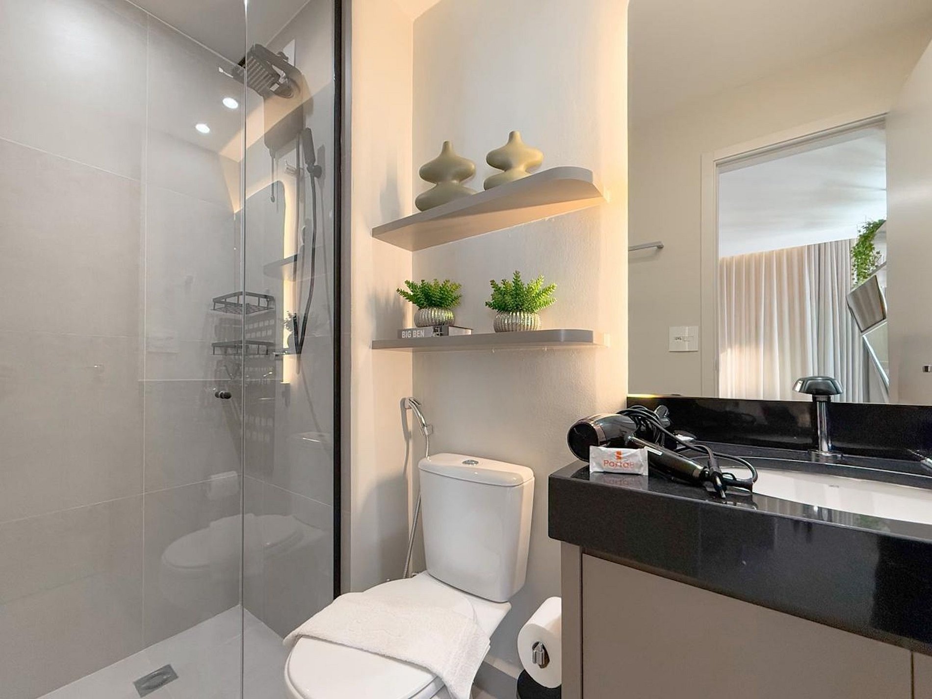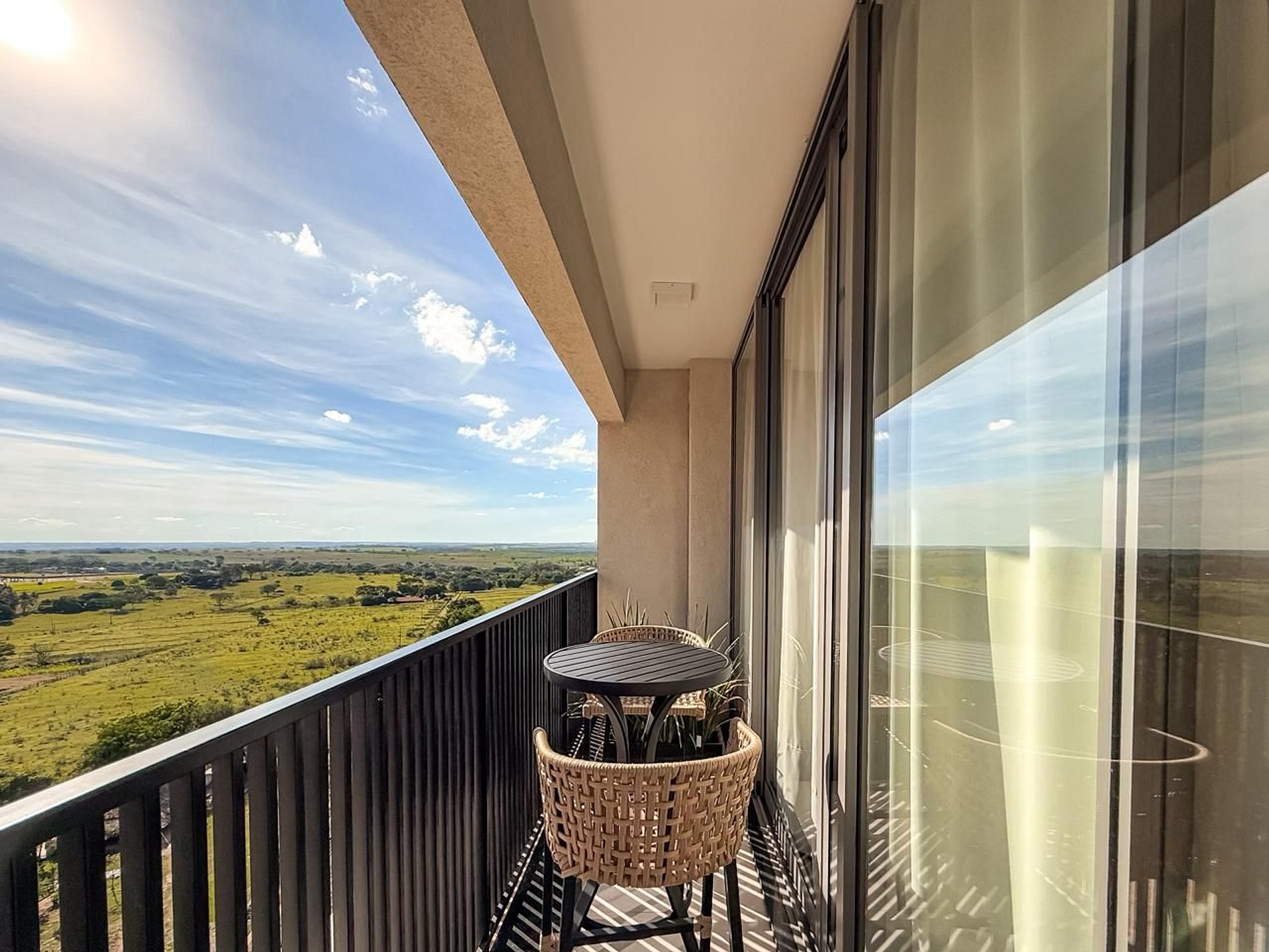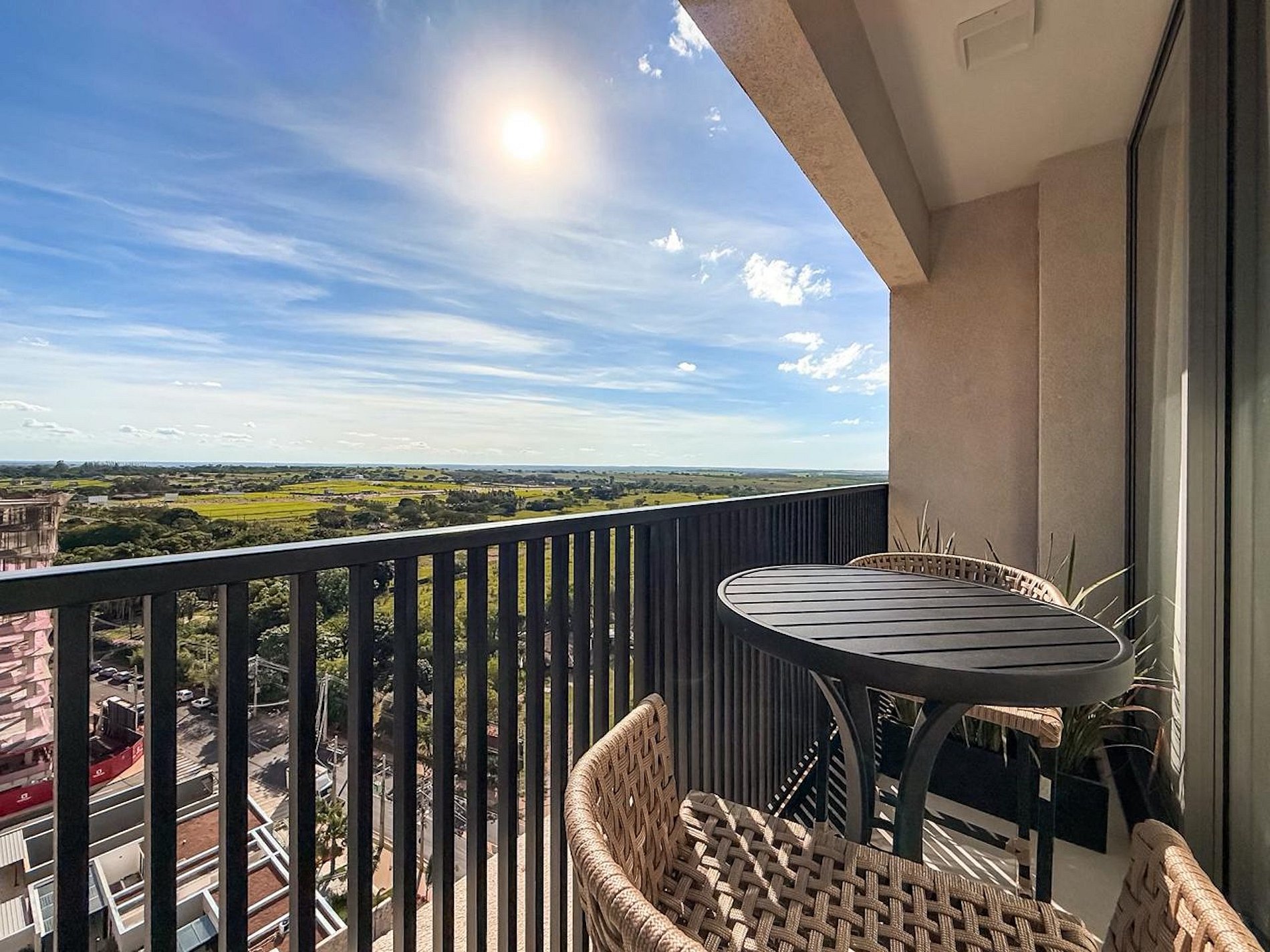 A sacada é um espetáculo à parte: vista aberta, horizonte amplo e a luz natural que invade o apartamento, criando uma atmosfera leve e sofisticada. É o lugar perfeito para um café da manhã tranquilo ou para fechar o dia contemplando a paisagem.