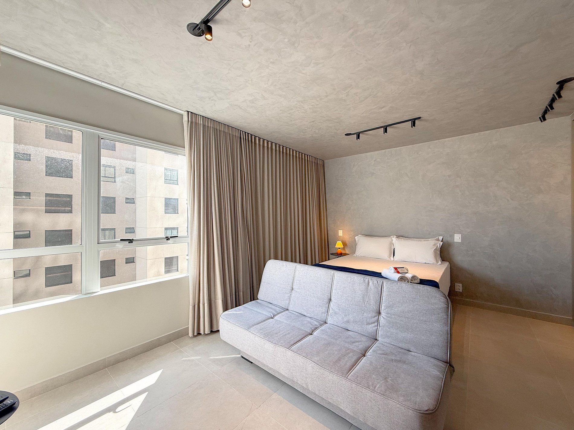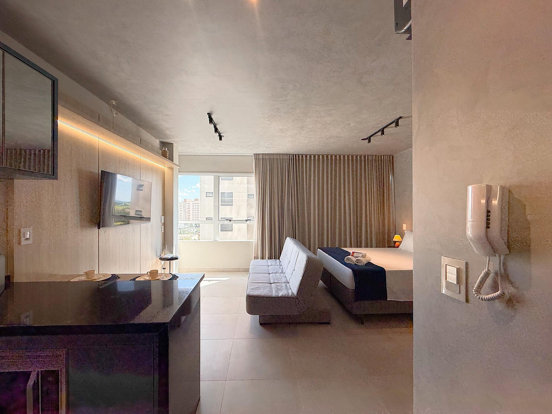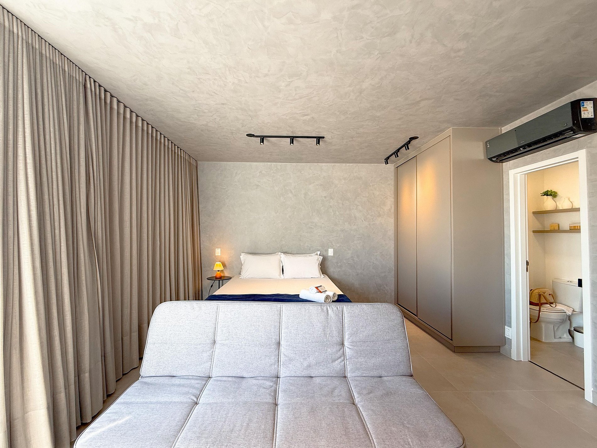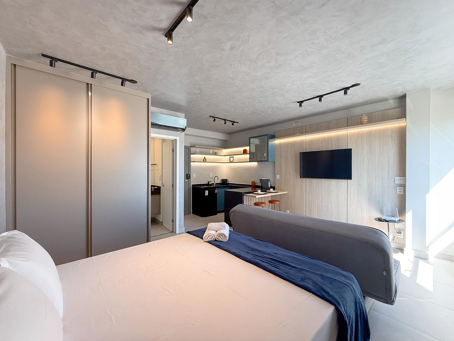 A paleta neutra, os tons de madeira, o concreto aparente e a iluminação indireta criam uma atmosfera sofisticada e tranquila. A área social integra sala, dormitório e cozinha de forma fluida, trazendo amplitude e conforto visual. O sofá posiciona o espaço para momentos de descanso, enquanto a cama garante noites confortáveis e silenciosas.