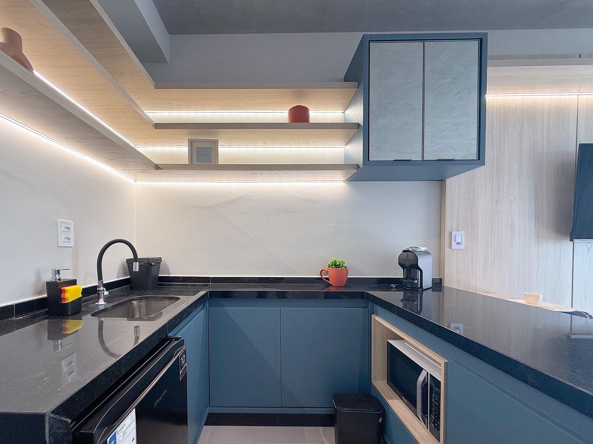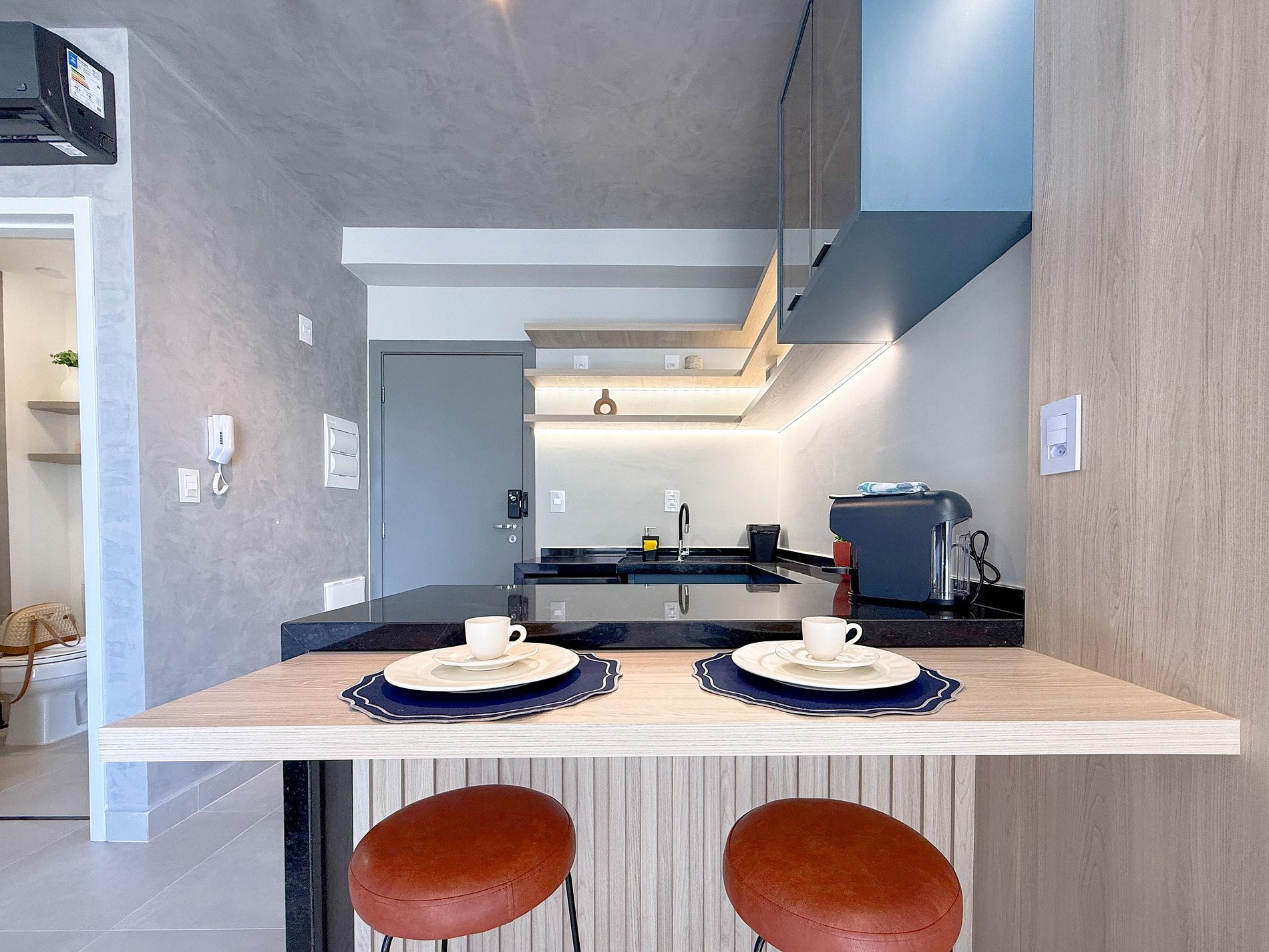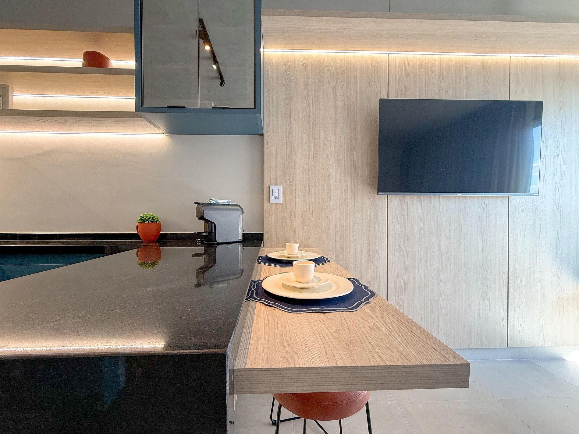 A cozinha é um dos destaques: marcenaria planejada, bancada generosa, eletros bem integrados e iluminação que valoriza cada detalhe. Um espaço funcional, mas também bonito — ideal tanto para o dia a dia quanto para estadias mais longas.