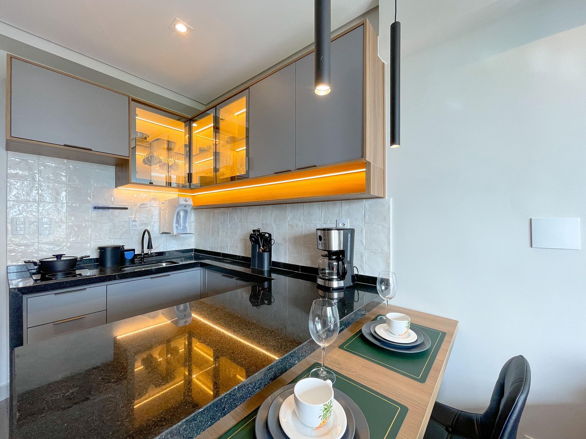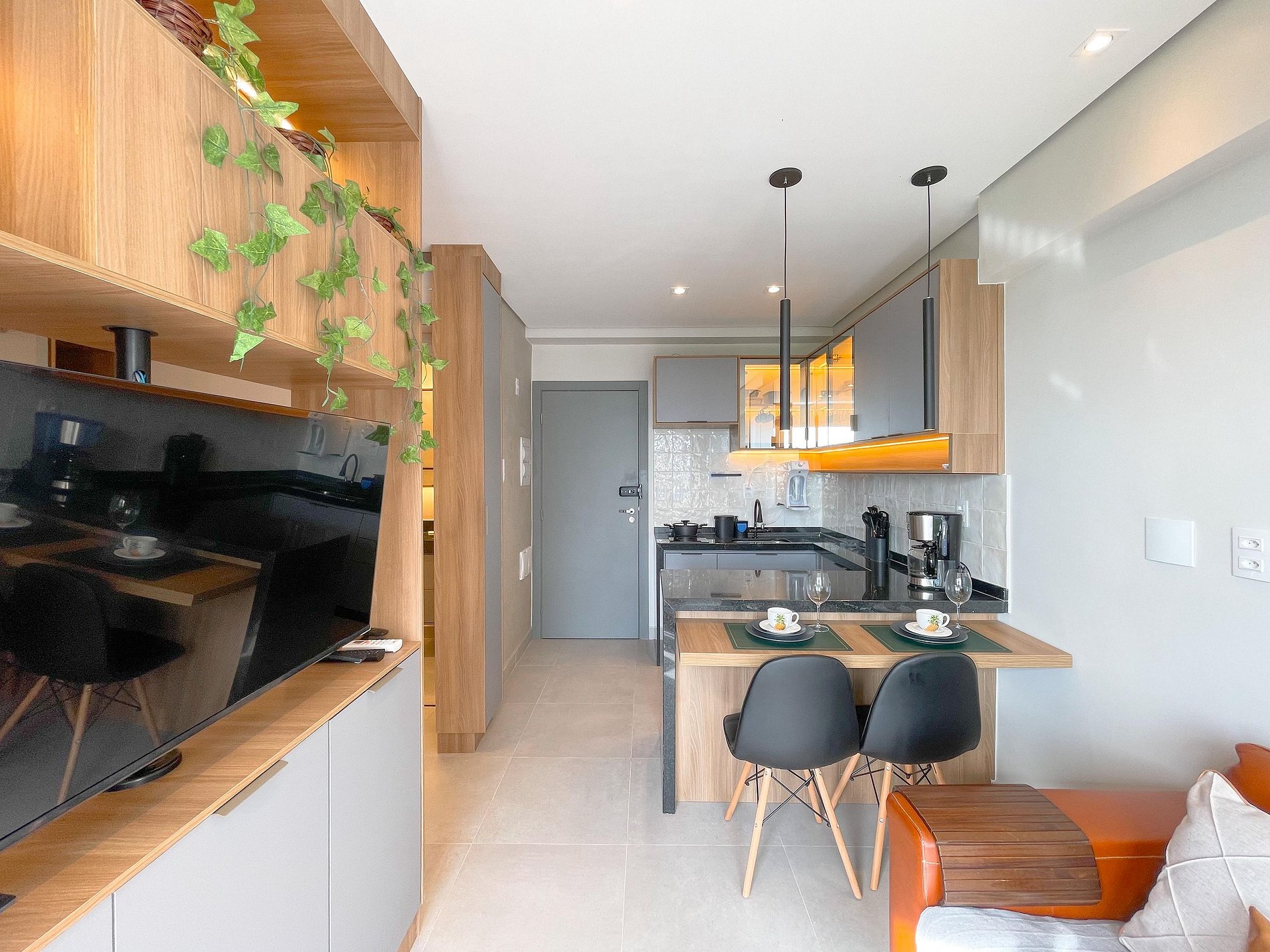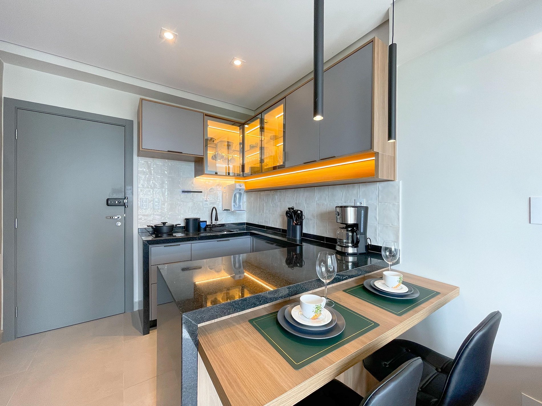A cozinha é completa e funcional, equipada com cooktop, frigobar, cafeteira, utensílios e armários planejados, ideal tanto para estadias curtas quanto mais longas. O apartamento dispõe ainda de ar-condicionado, espaço para trabalho e acabamentos de alto padrão.