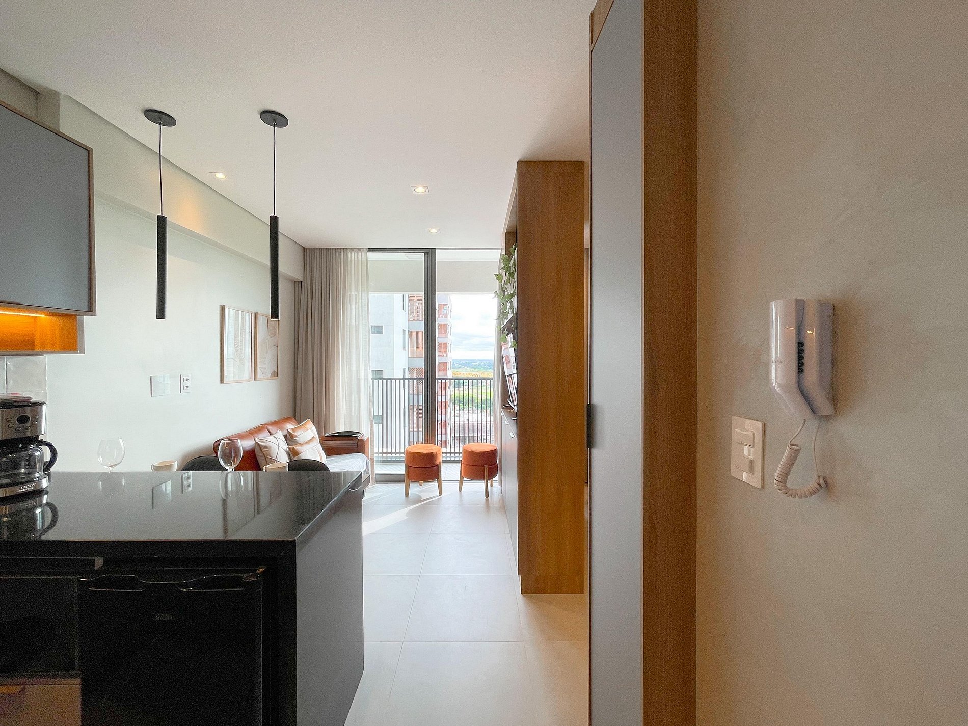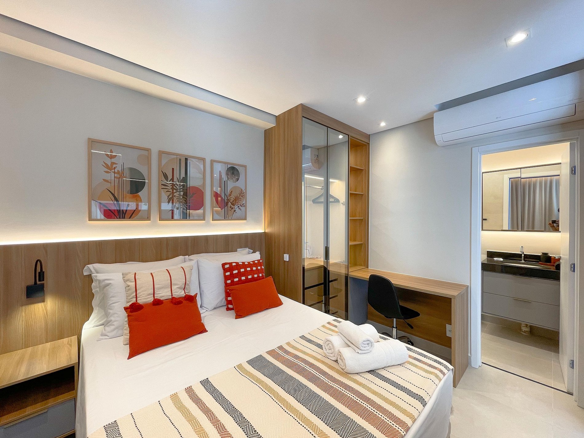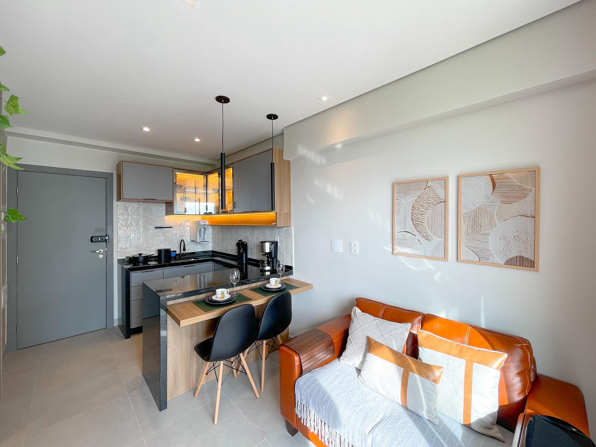 A cozinha é completa e funcional, equipada com cooktop, frigobar, cafeteira, utensílios e armários planejados, ideal tanto para estadias curtas quanto mais longas. O apartamento dispõe ainda de ar-condicionado, espaço para trabalho e acabamentos de alto padrão.