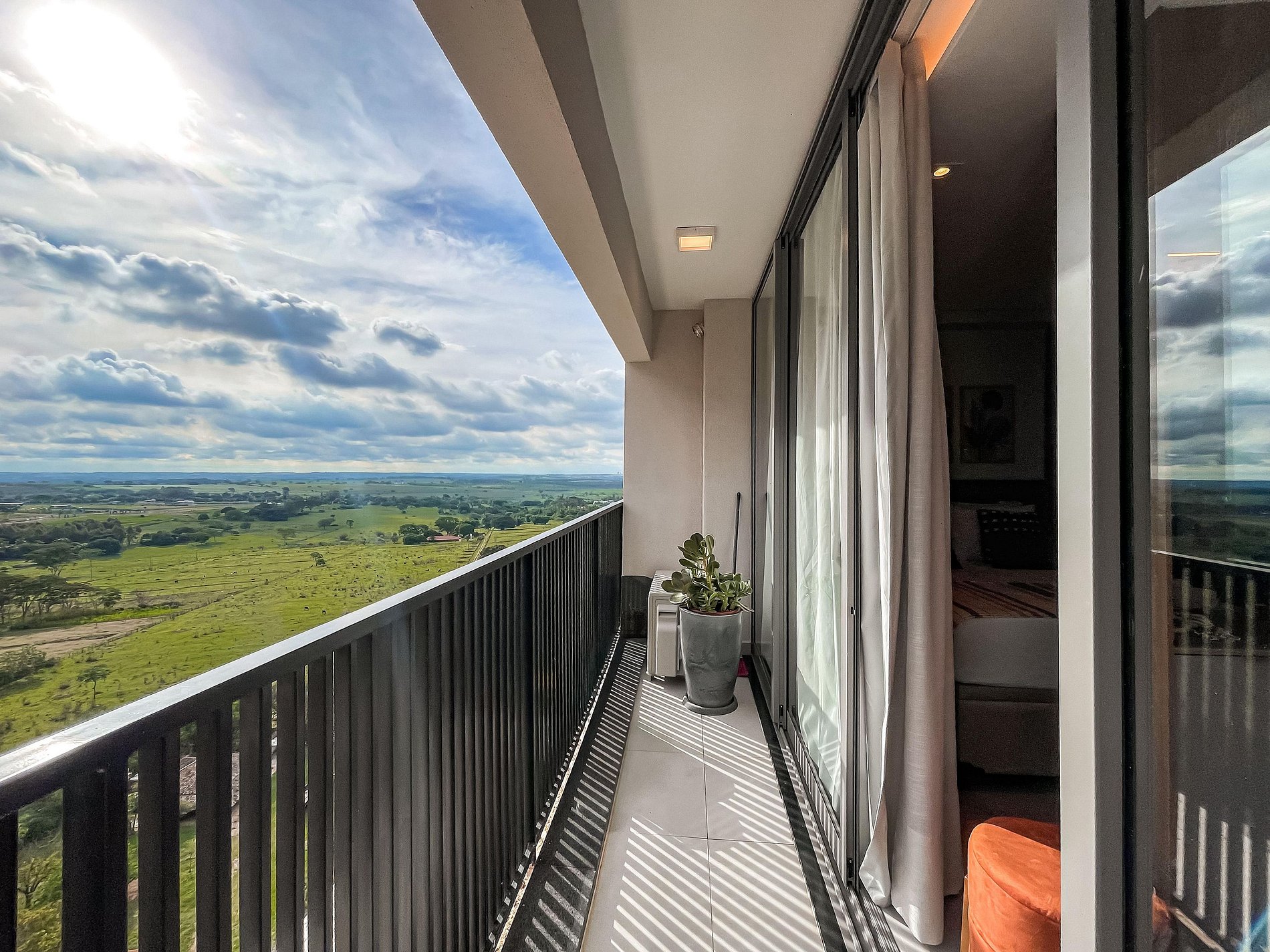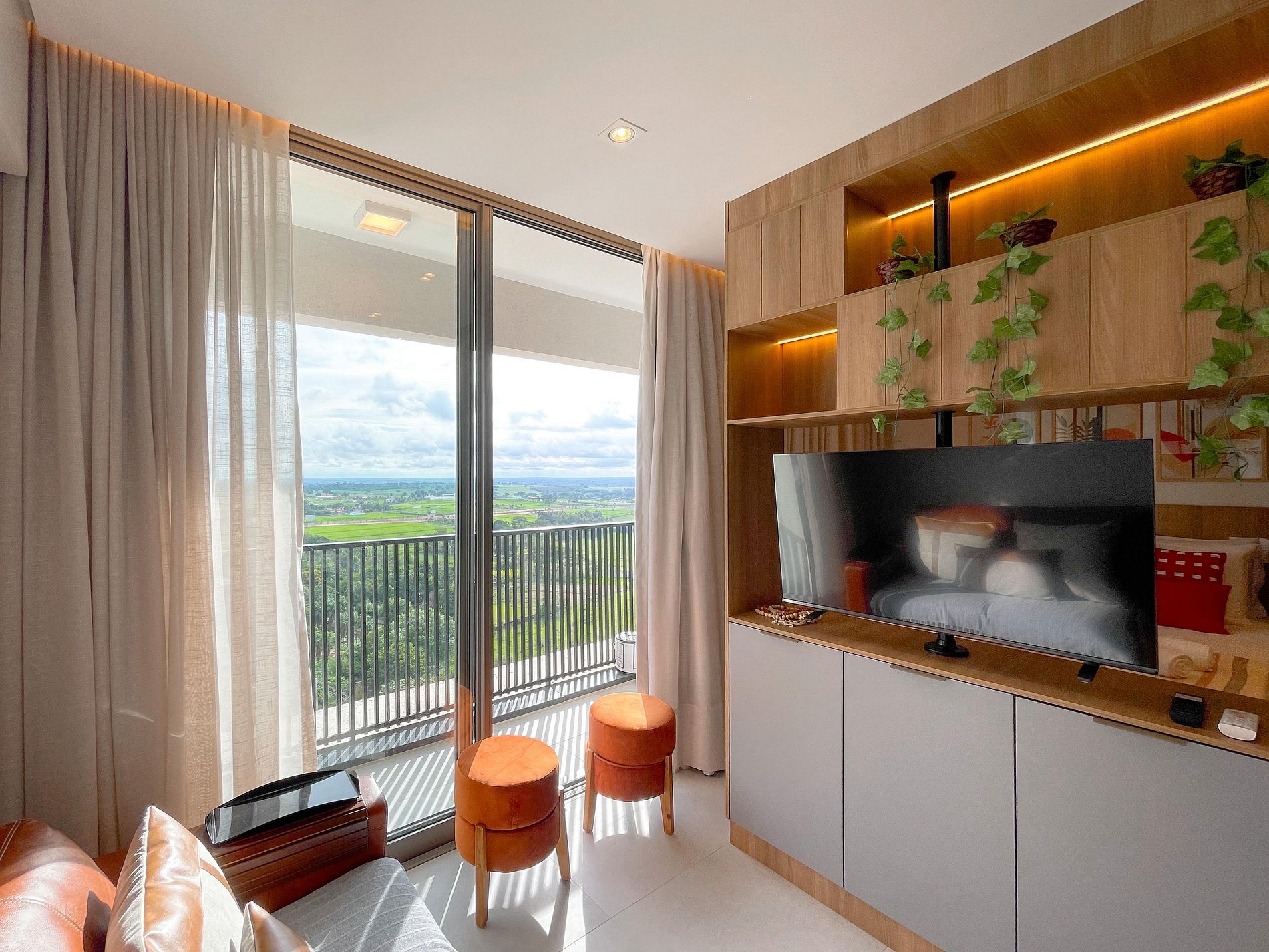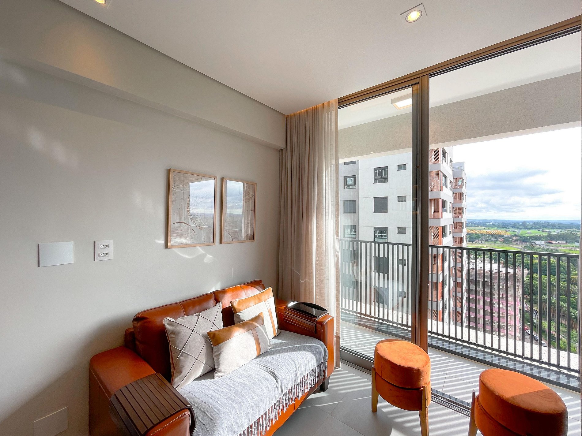 A sala integra-se de forma elegante ao espaço, com sofá aconchegante, smart TV e acesso à sacada com vista panorâmica, onde a luz natural e o horizonte aberto se tornam protagonistas — um convite para relaxar ou trabalhar com inspiração.