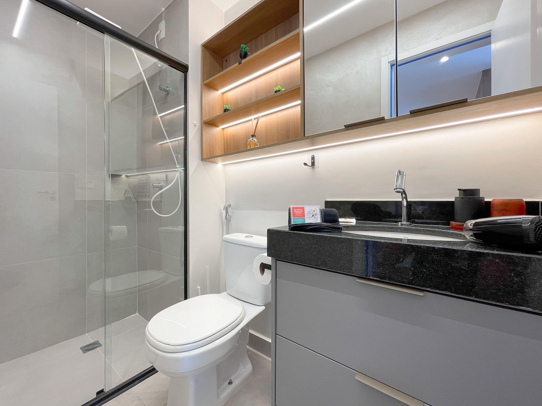 O ambiente é marcado por design contemporâneo, marcenaria sob medida e iluminação cuidadosamente projetada, criando uma atmosfera acolhedora e sofisticada. A área de descanso conta com cama casal confortável, enxoval completo e detalhes decorativos que elevam a experiência.