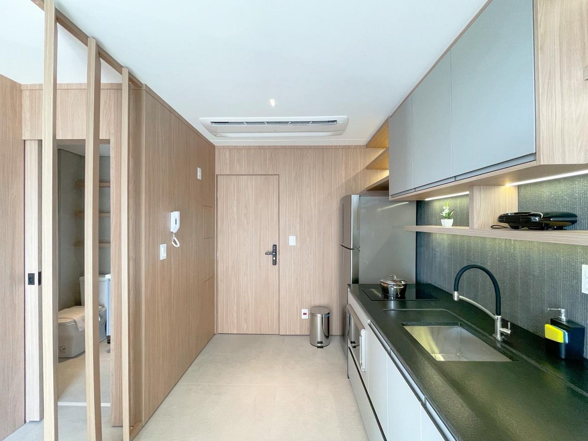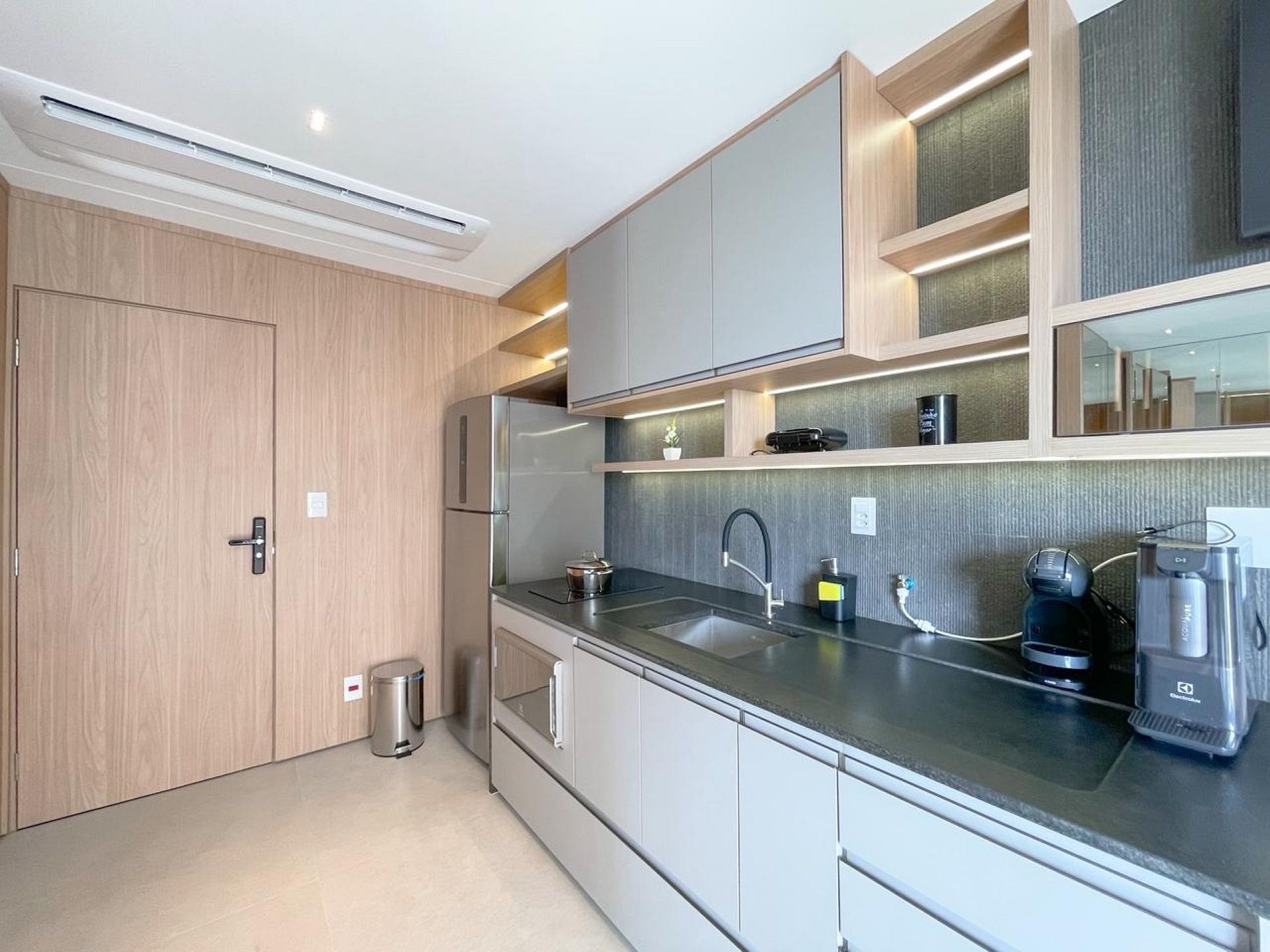 A área social integra cozinha e estar de forma elegante, com marcenaria sob medida, revestimentos modernos e iluminação indireta que cria uma atmosfera acolhedora. A cozinha é completa, equipada com geladeira inox, cooktop, micro-ondas, cafeteira Dolce Gusto, e utensílios que permitem preparar refeições com praticidade.