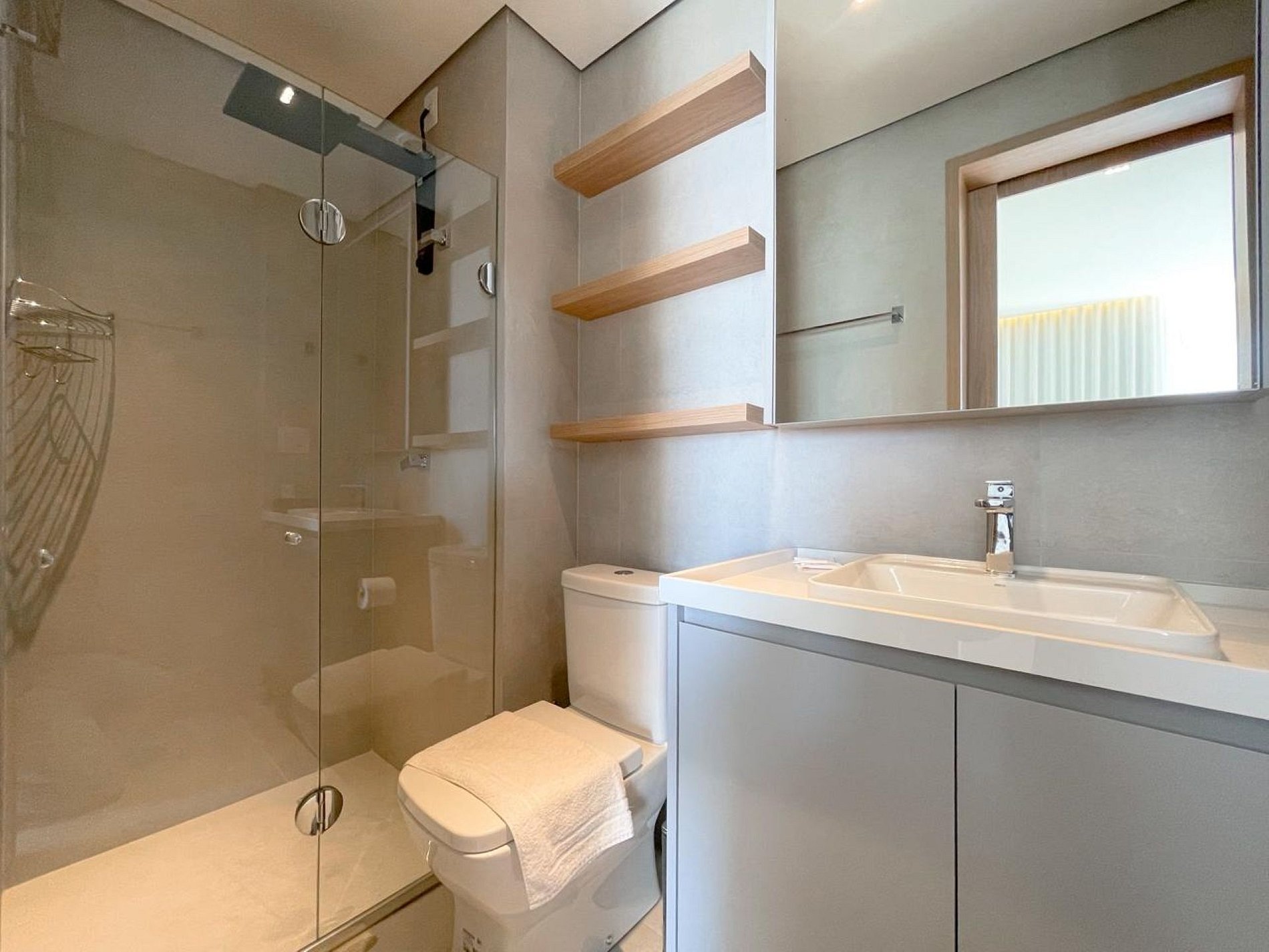 O banheiro segue o mesmo padrão sofisticado, com acabamento moderno, box em vidro, ducha quente e espelho iluminado, reforçando a sensação de hotel premium.