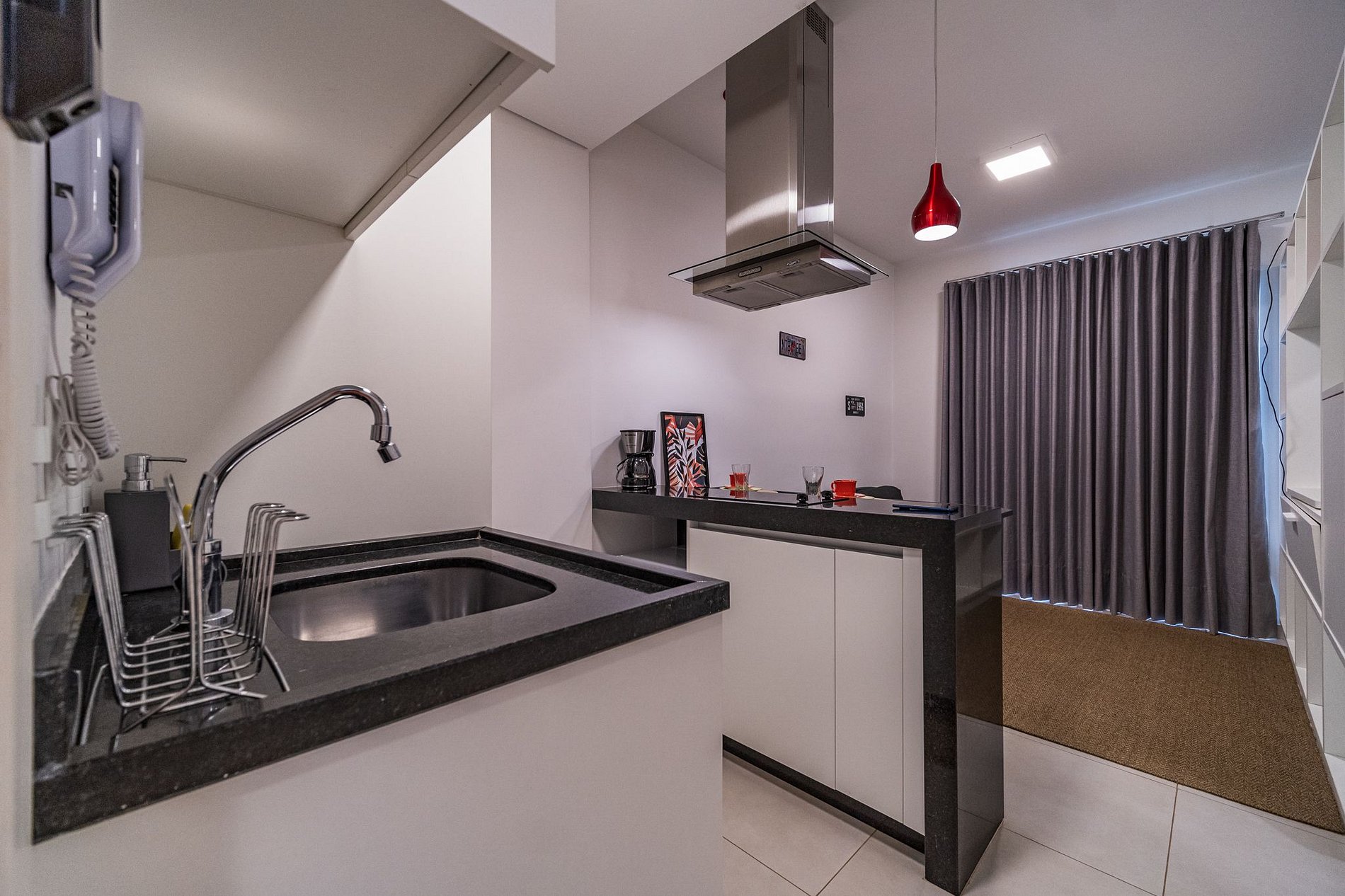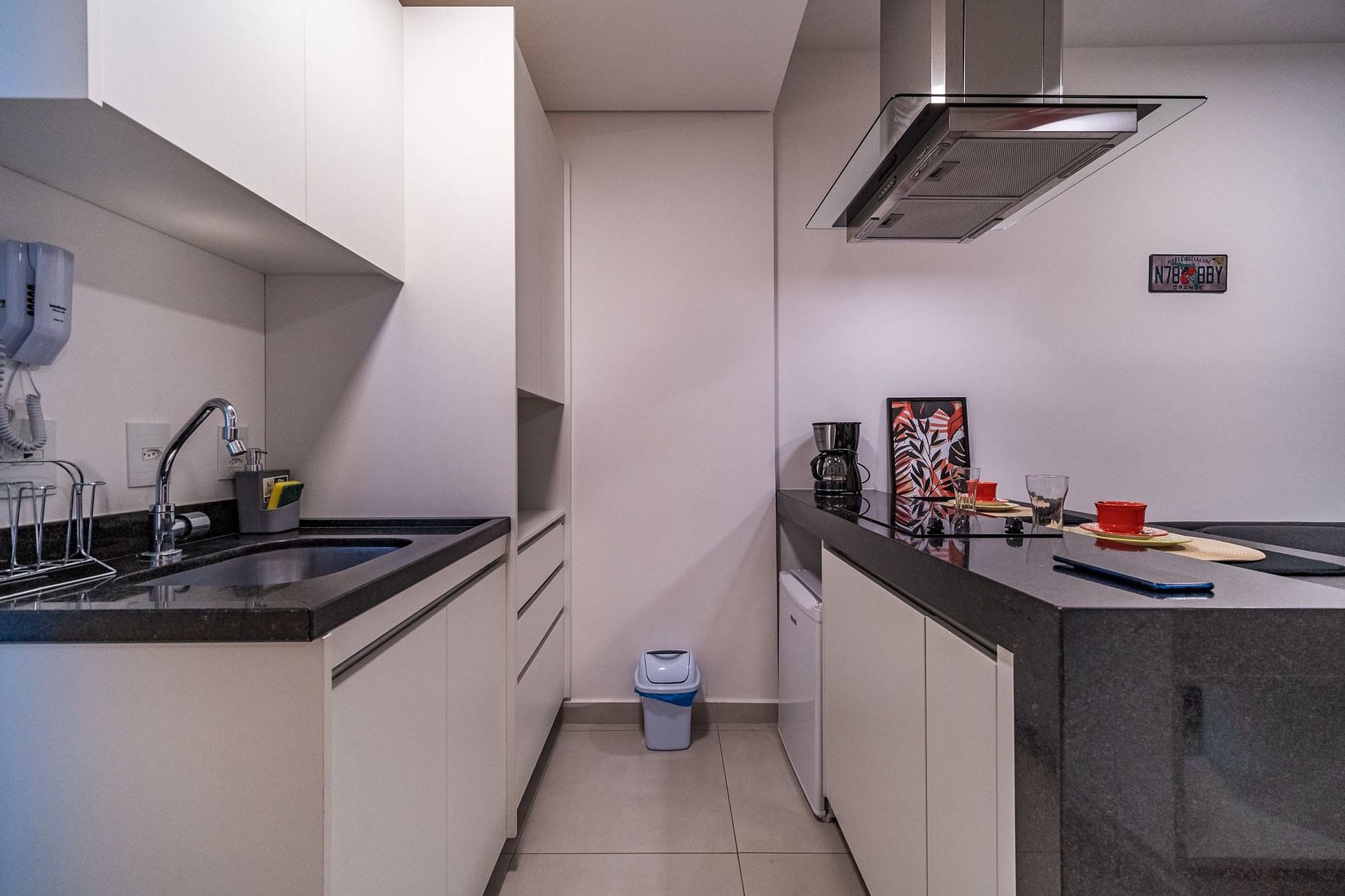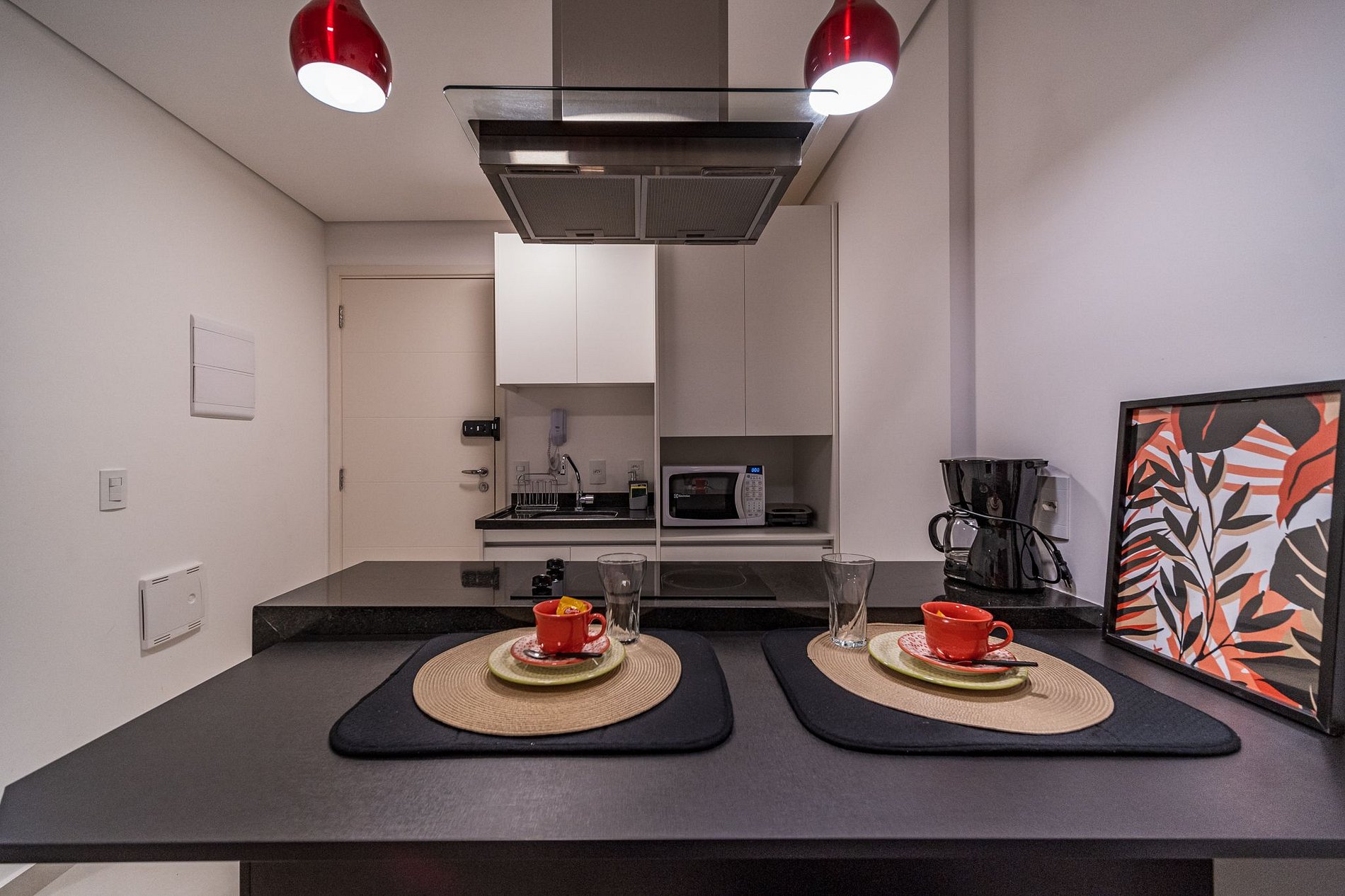 A cozinha é equipada com cooktop de indução de 2 bocas, coifa, frigobar, micro-ondas, cafeteria e sanduicheira, além de ter pratos, talheres, copos, taças, xícaras e utensílios variados.