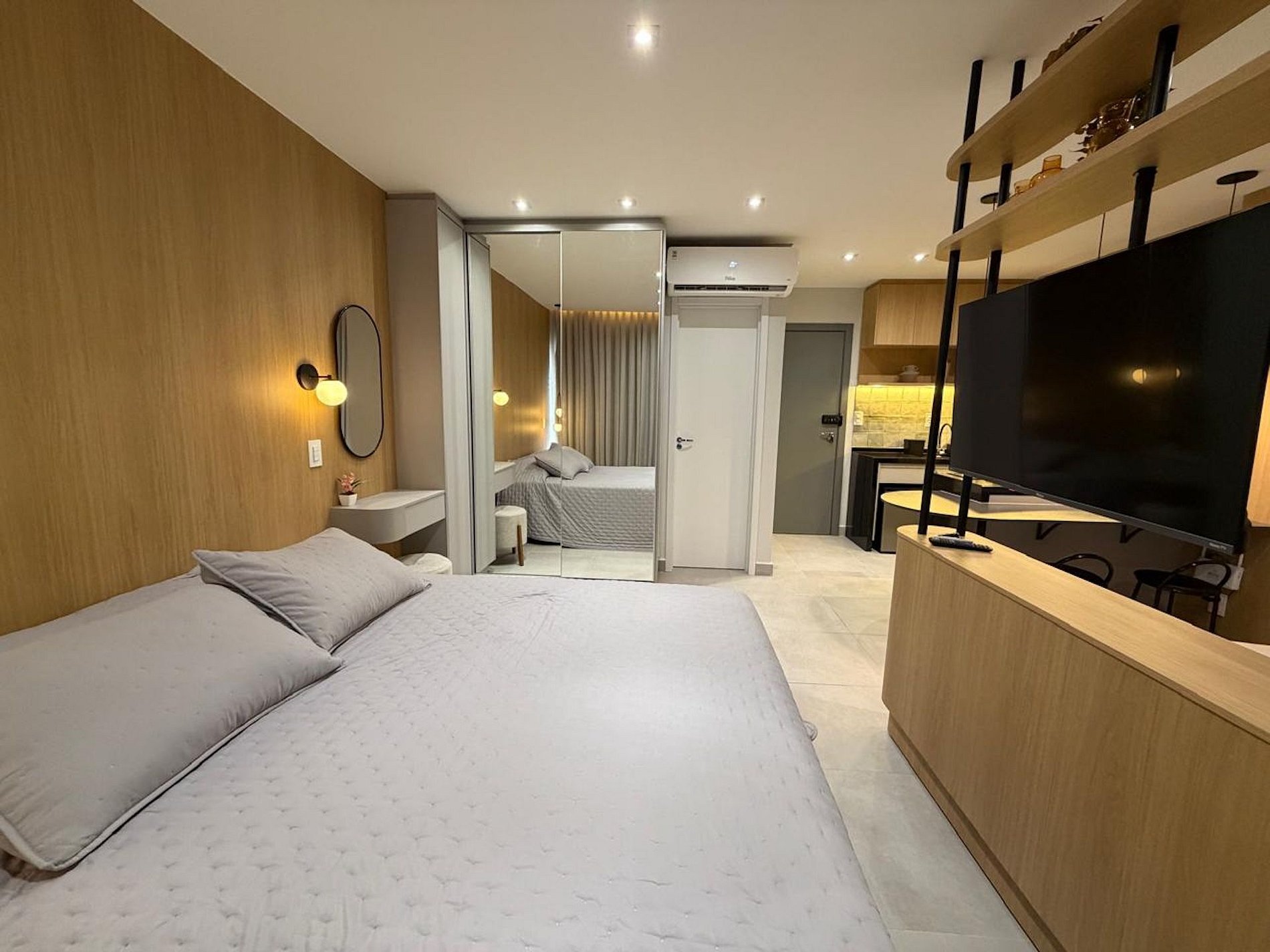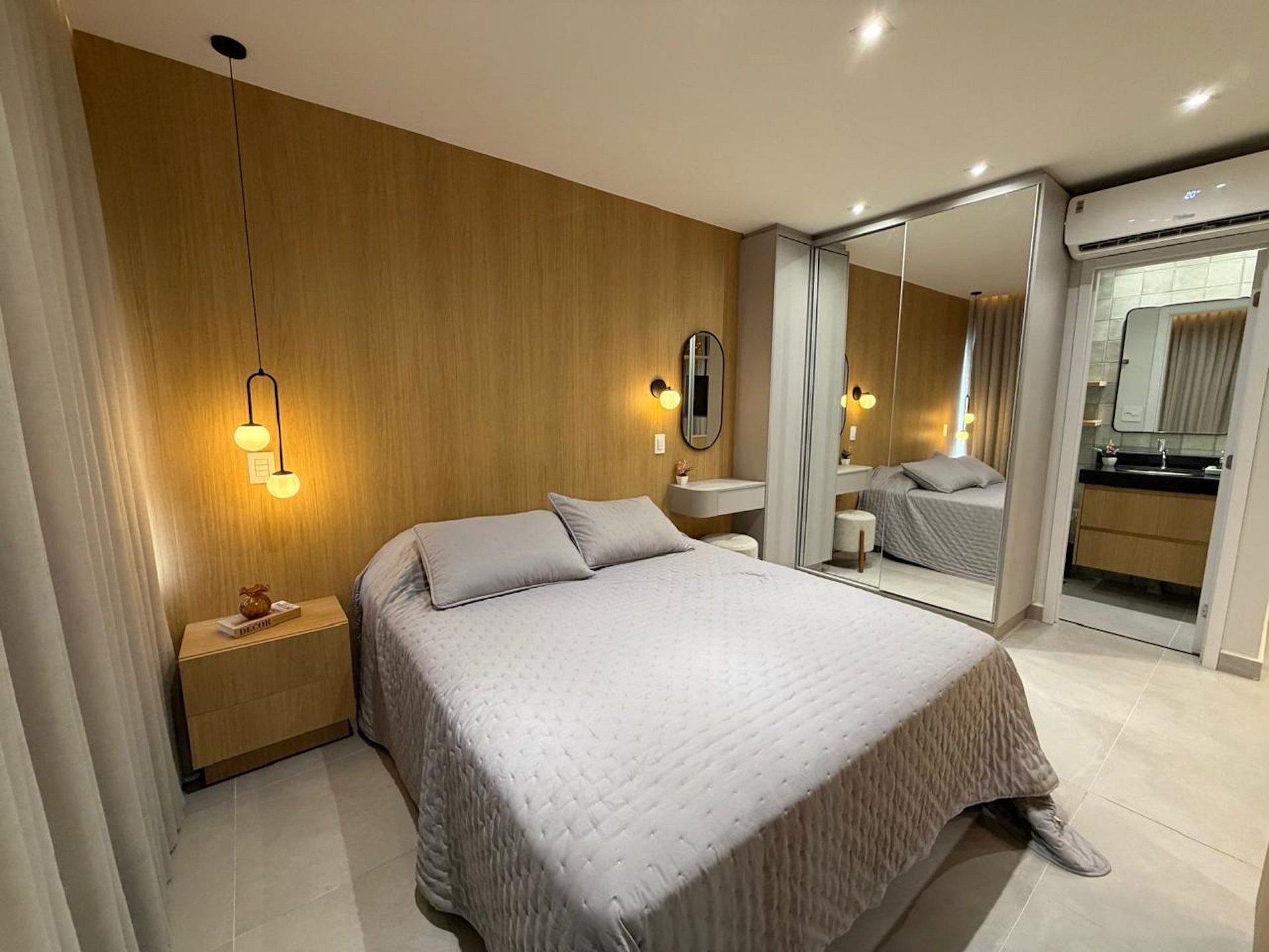 O quarto oferece cama queen confortável, enxoval de qualidade, armários amplos com portas espelhadas e iluminação suave, criando um espaço silencioso e relaxante. O ar-condicionado garante conforto térmico em qualquer estação.