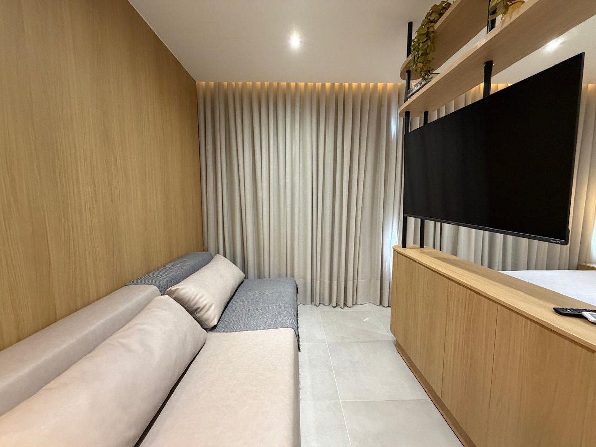 O ambiente integra quarto, sala e cozinha de forma fluida e elegante. A marcenaria sob medida em tons amadeirados cria uma atmosfera acolhedora, enquanto a iluminação indireta valoriza cada detalhe do projeto. A sala conta com sofá confortável e TV, perfeita para relaxar após um dia cheio.