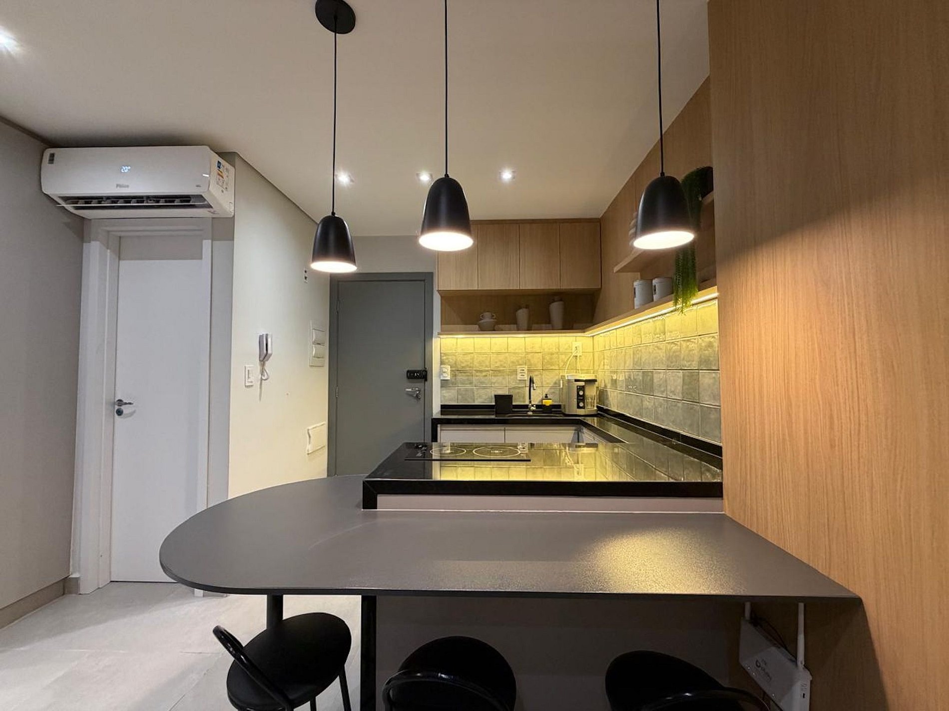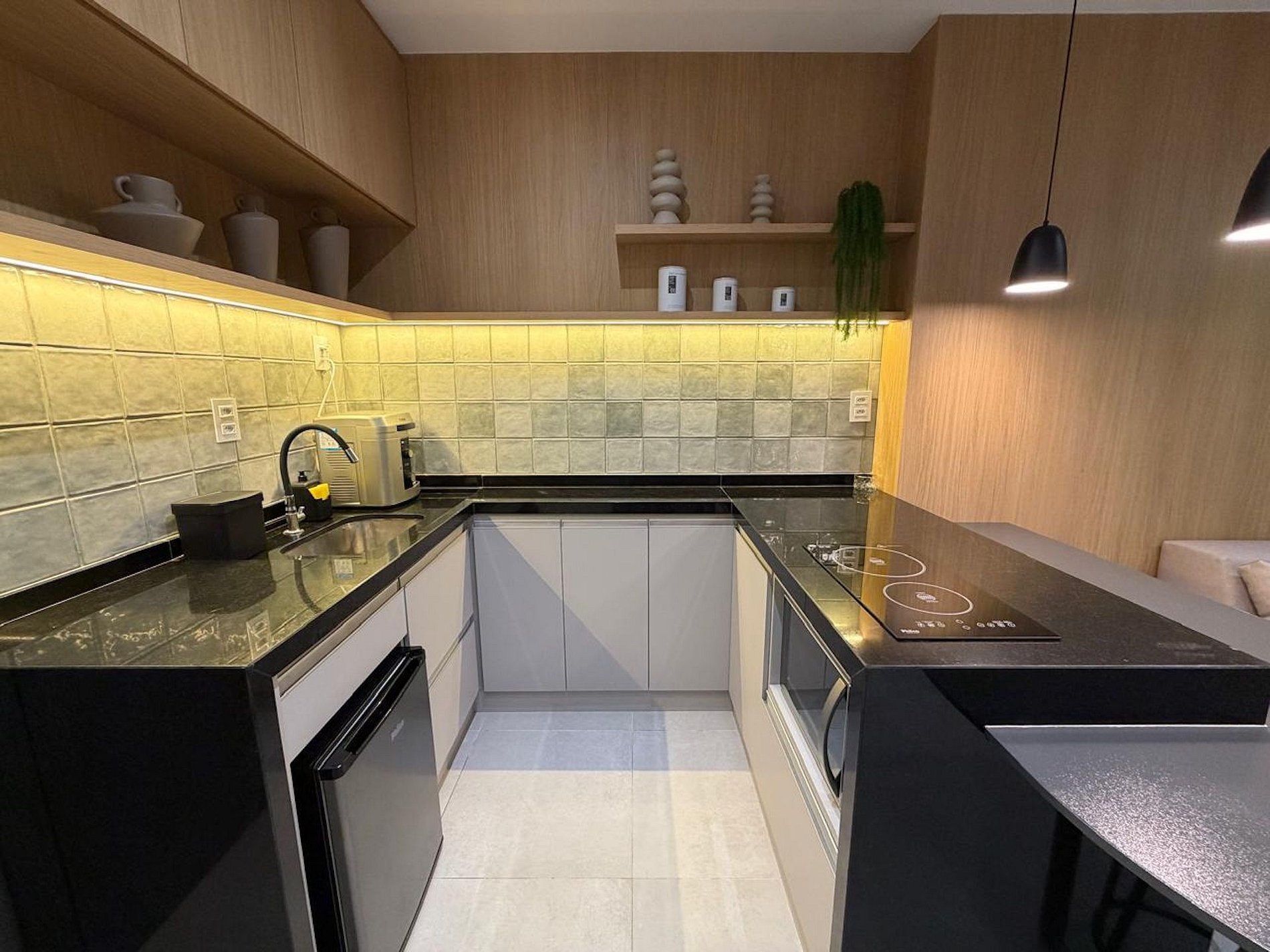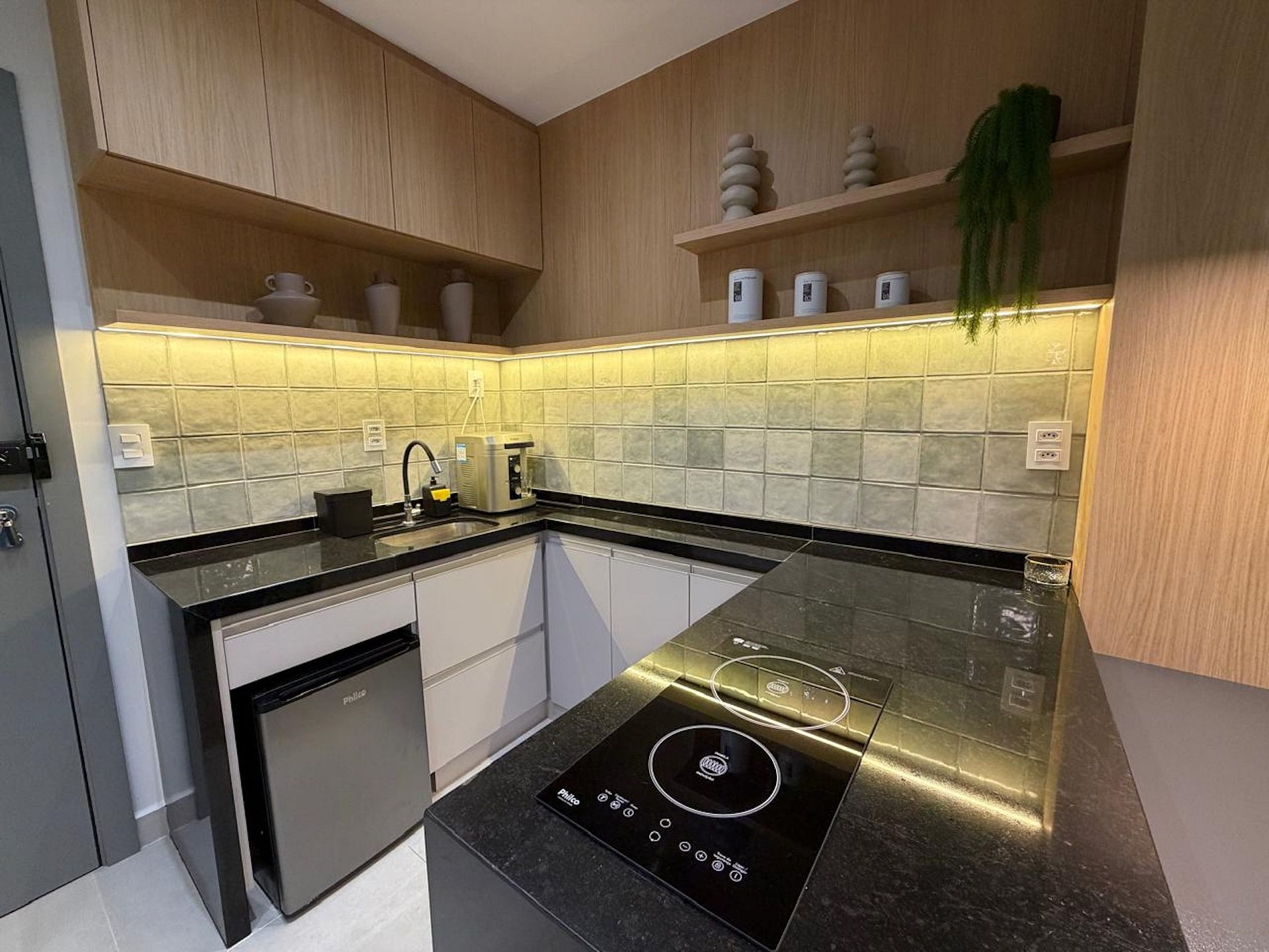 A cozinha é completa e moderna, equipada com cooktop por indução, micro-ondas, frigobar, cafeteira e uma charmosa bancada curva que convida para refeições rápidas ou um café tranquilo.