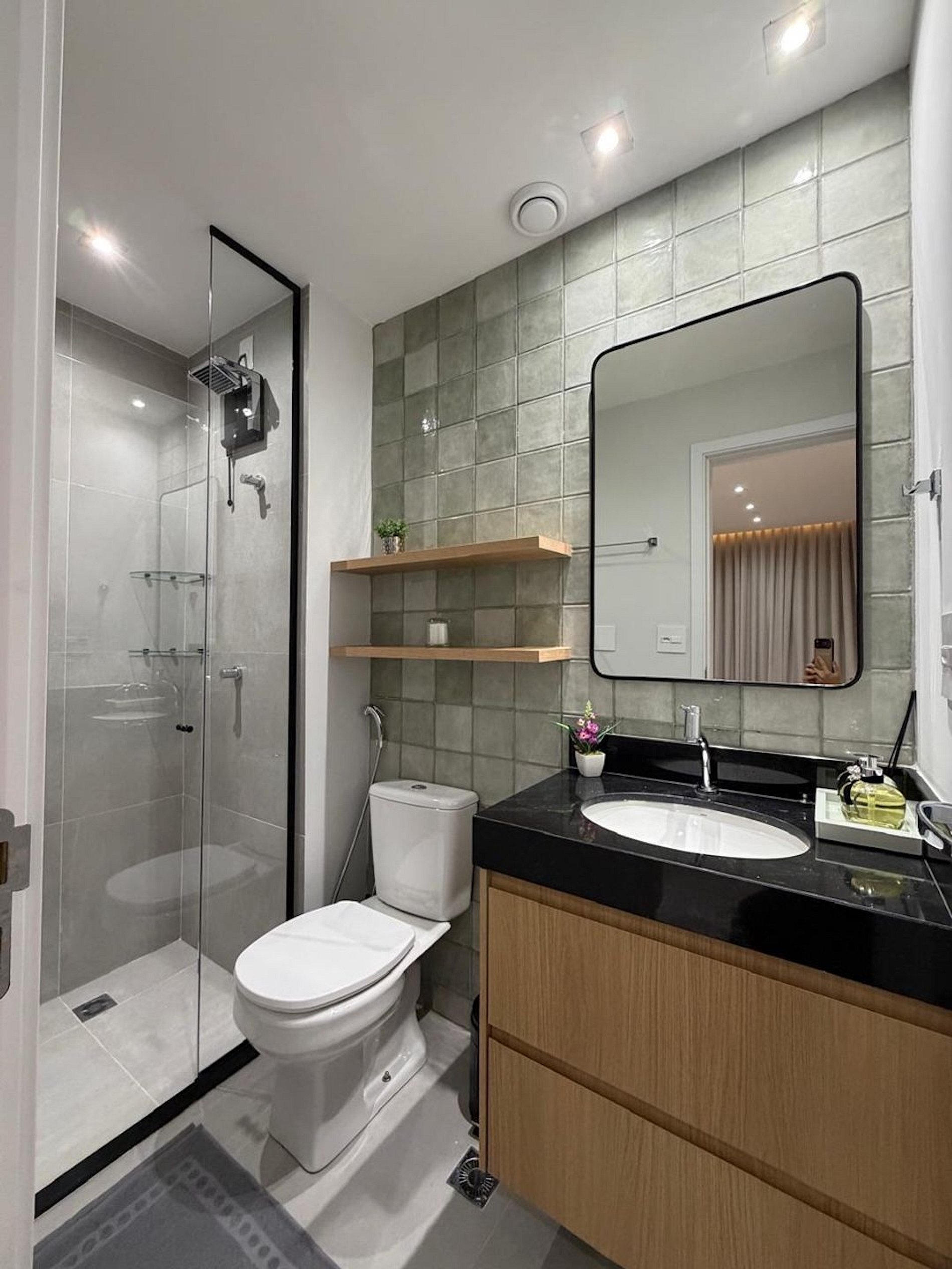 O banheiro segue o mesmo padrão sofisticado, com acabamento moderno, box em vidro, ducha excelente e bancada elegante.