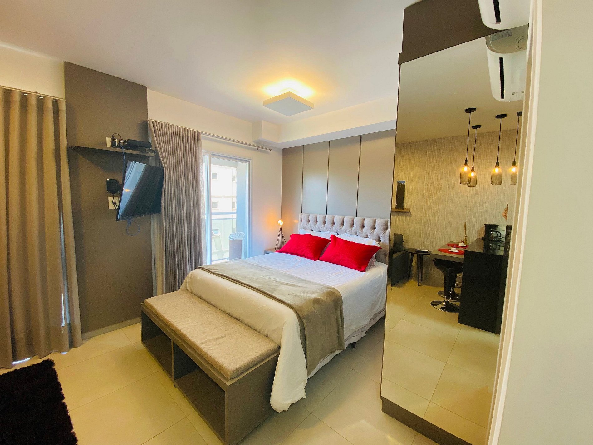 Os apartamentos são modernos, confortáveis e bem equipados, com ar condicionado, cozinha compacta e vista para a cidade. Os moradores têm à disposição estacionamento particular Med Park no próprio condomínio.