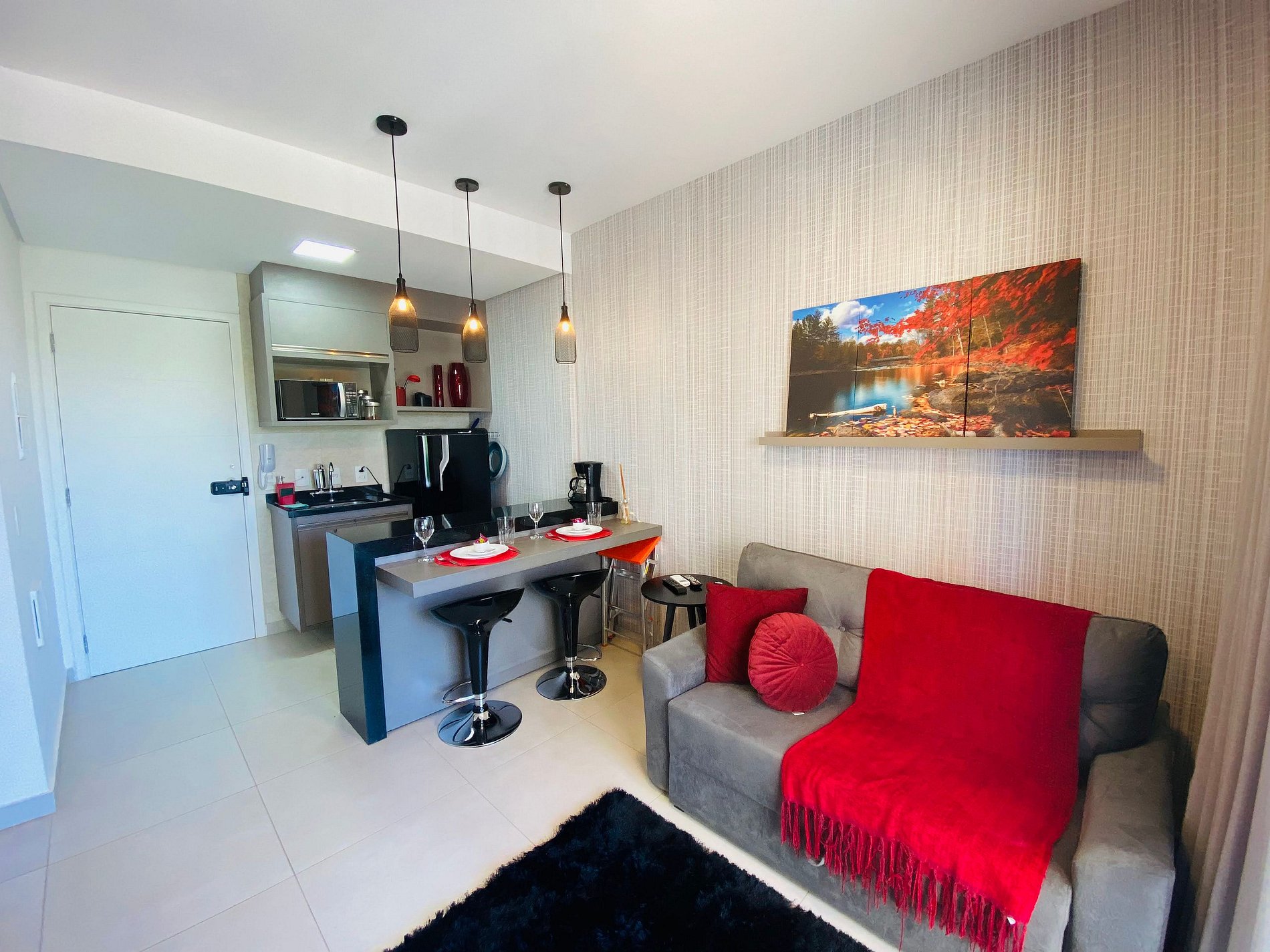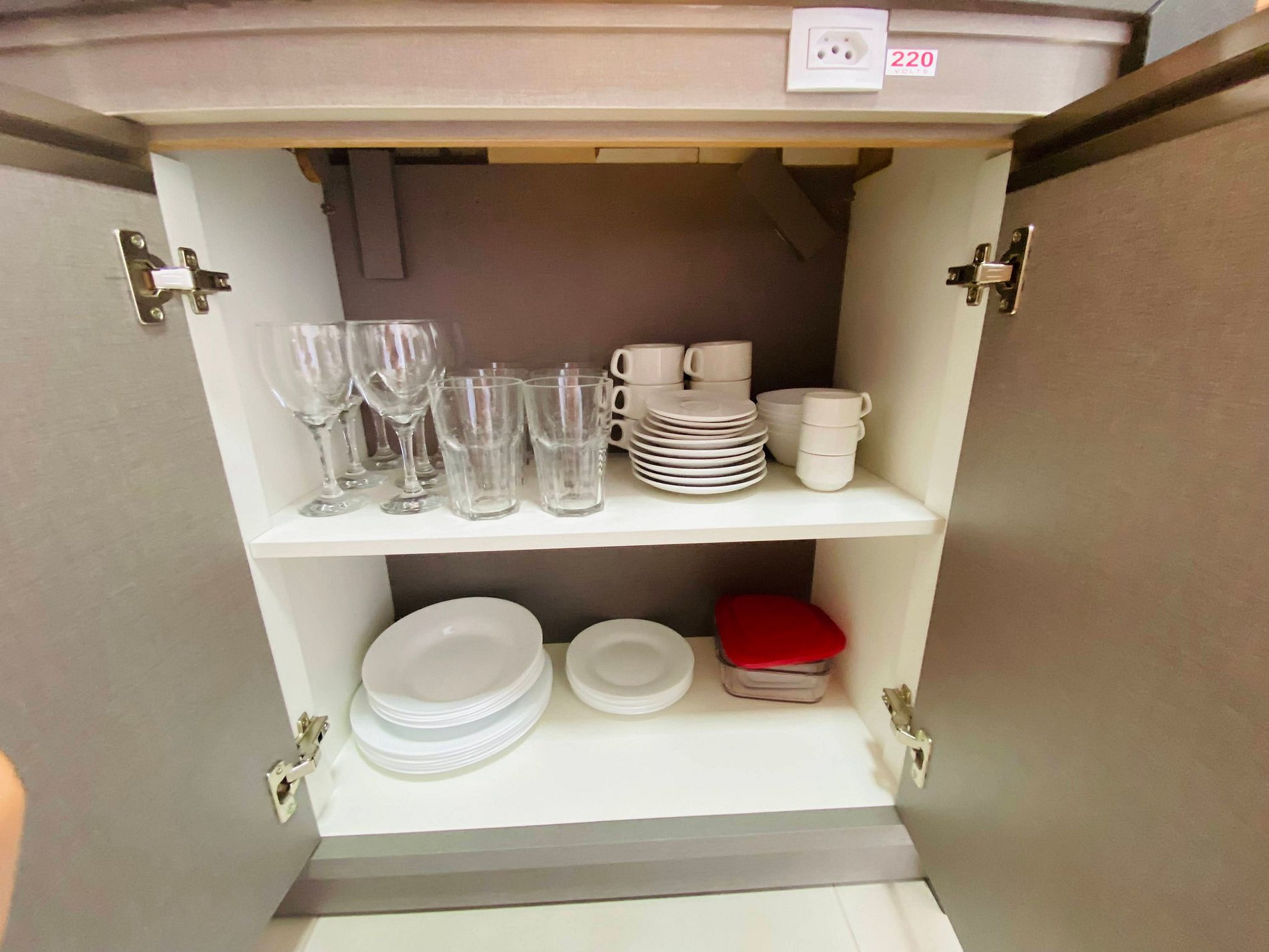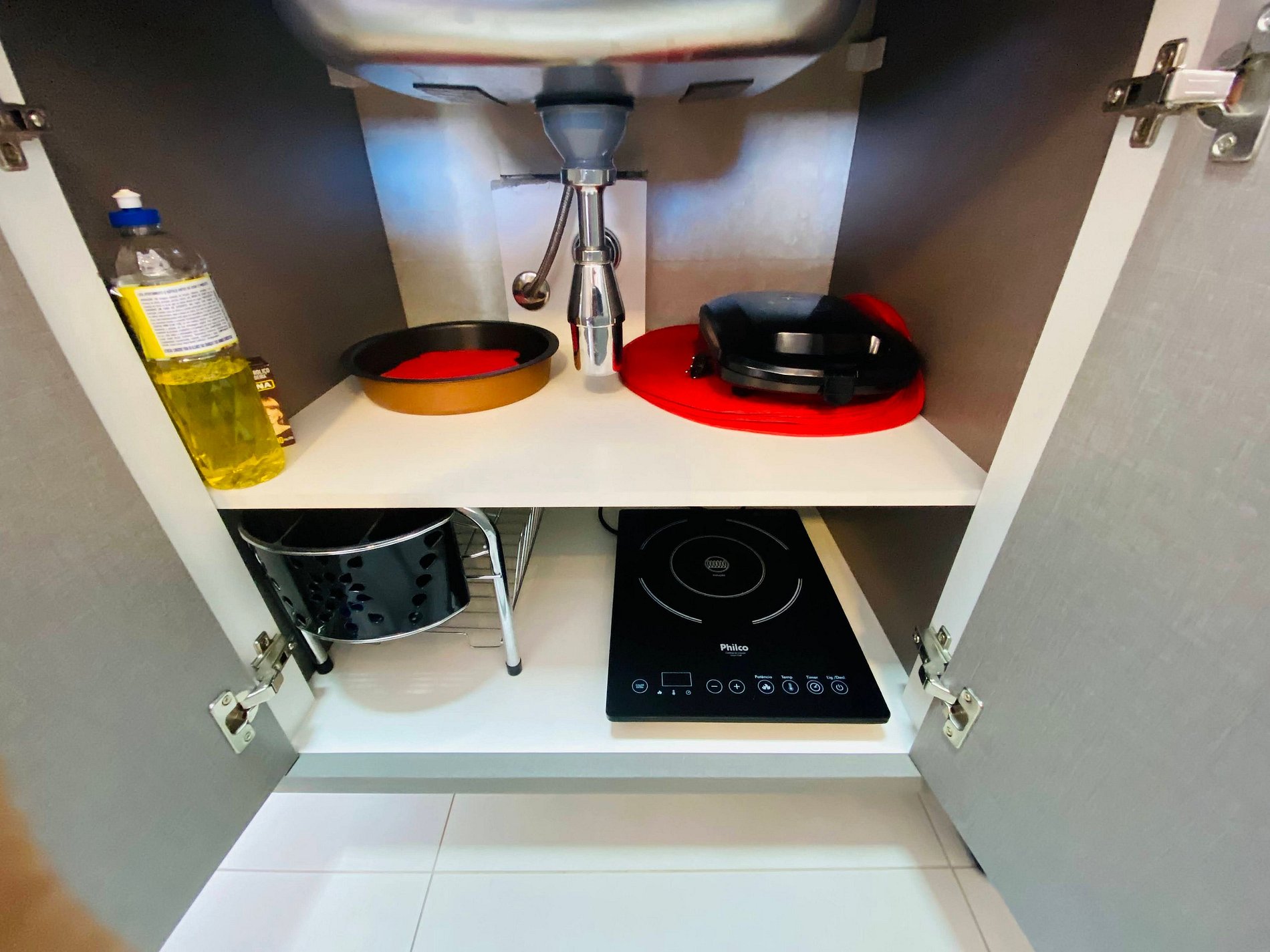 Na cozinha compacta, você encontra tudo o que precisa para preparar suas refeições, desde cafeteira elétricas até um fogão de indução de uma boca, panelas e utensílios para você soltar a criatividade. Além disso, há pratos, talheres, copos e taças para você servir sua comida com muito estilo!
