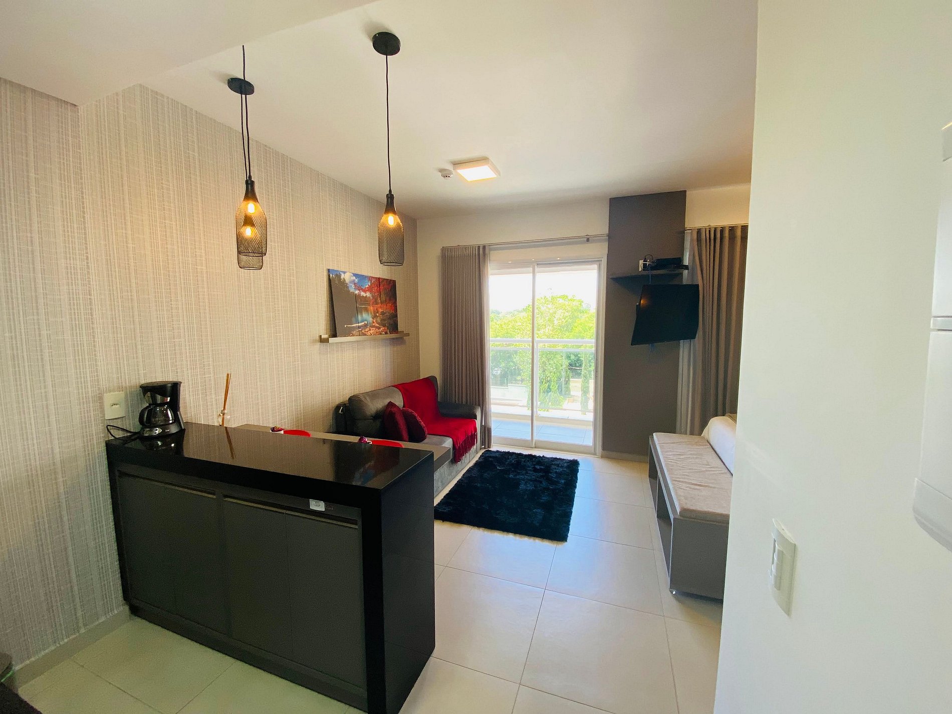 A sala é equipada com um sofá-cama confortável, que vai te acomodar perfeitamente enquanto você assiste sua Smart TV com internet ultra-rápida de 600MG. O ar-condicionado vai deixar o ambiente fresquinho enquanto você curte suas séries e filmes favoritos.